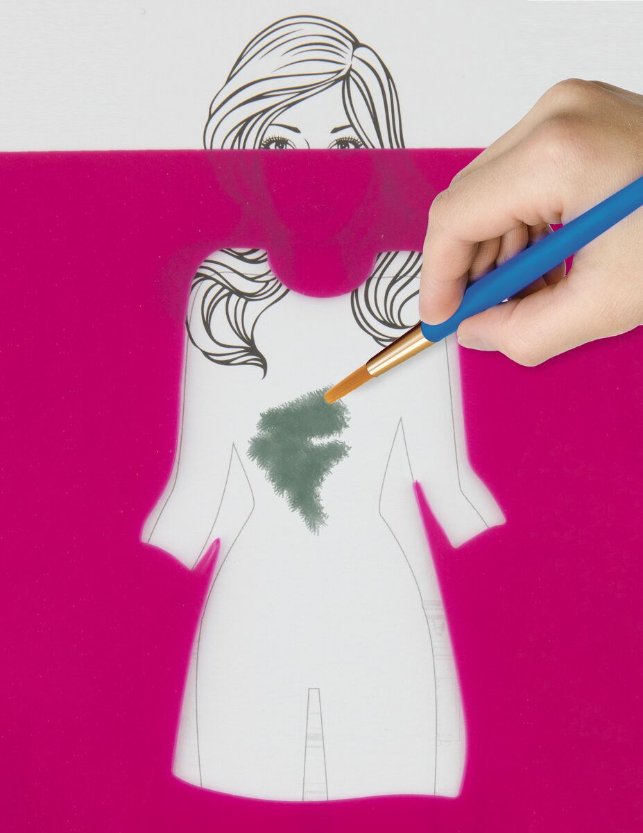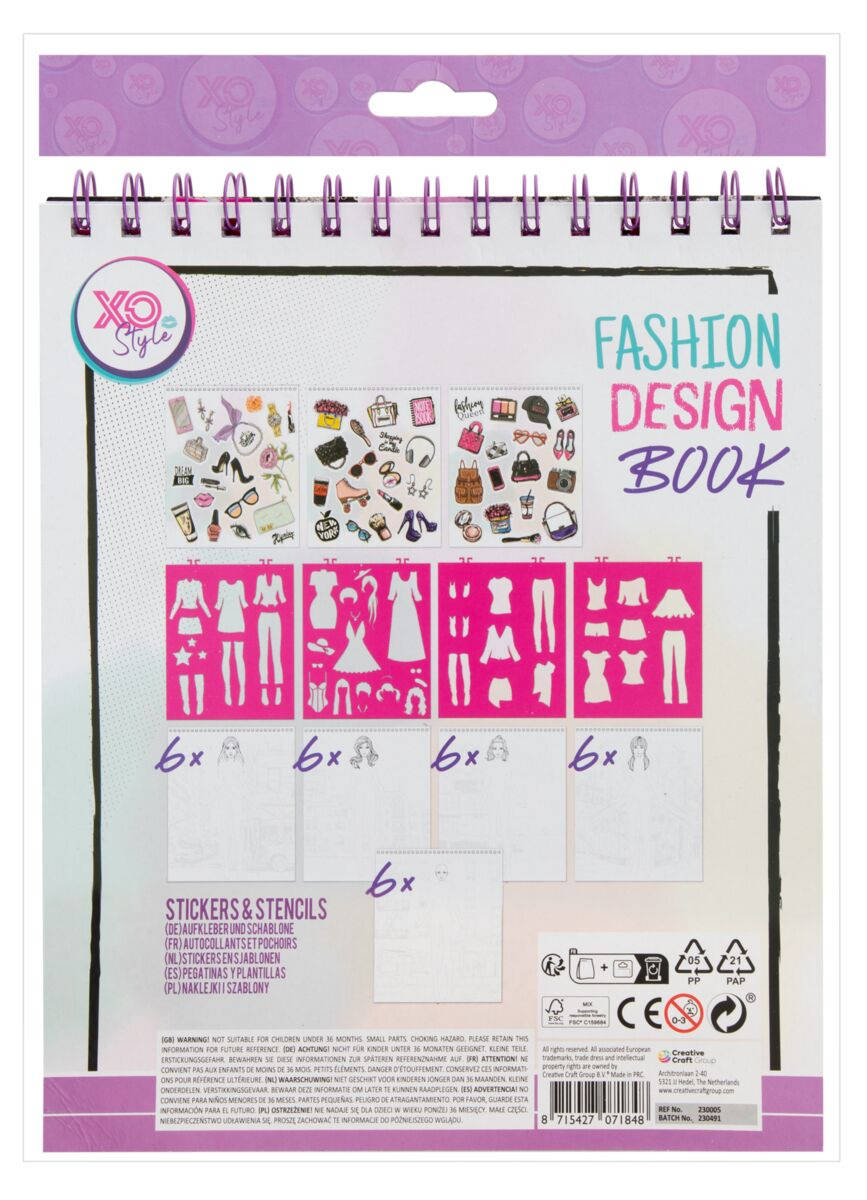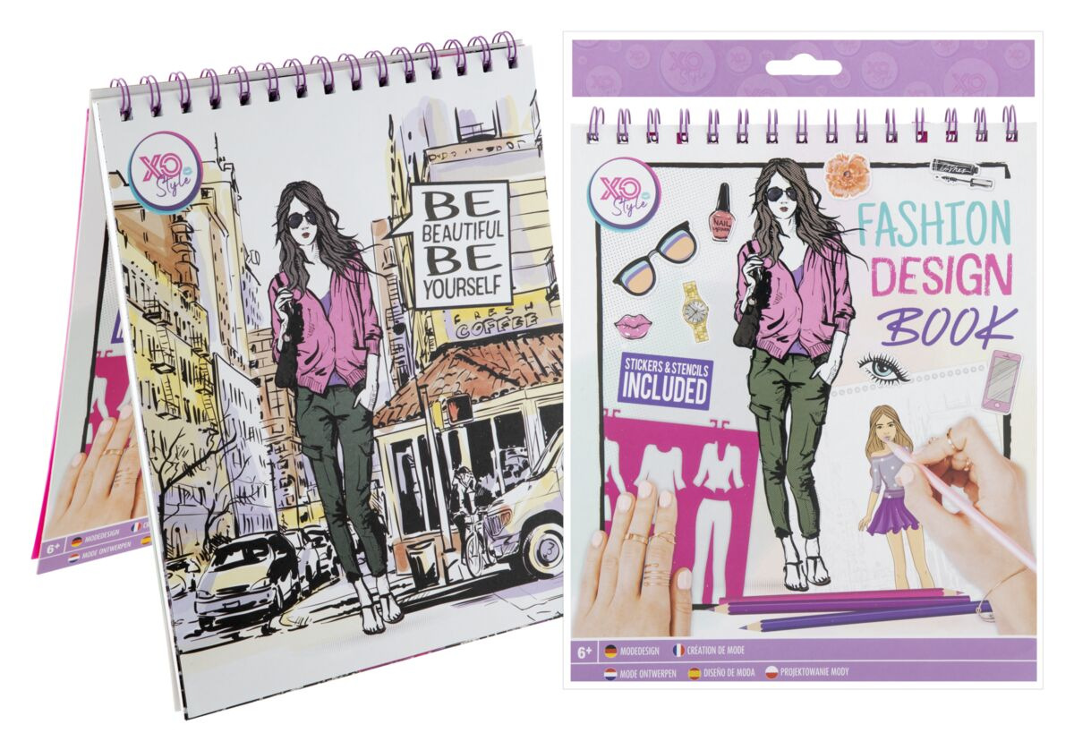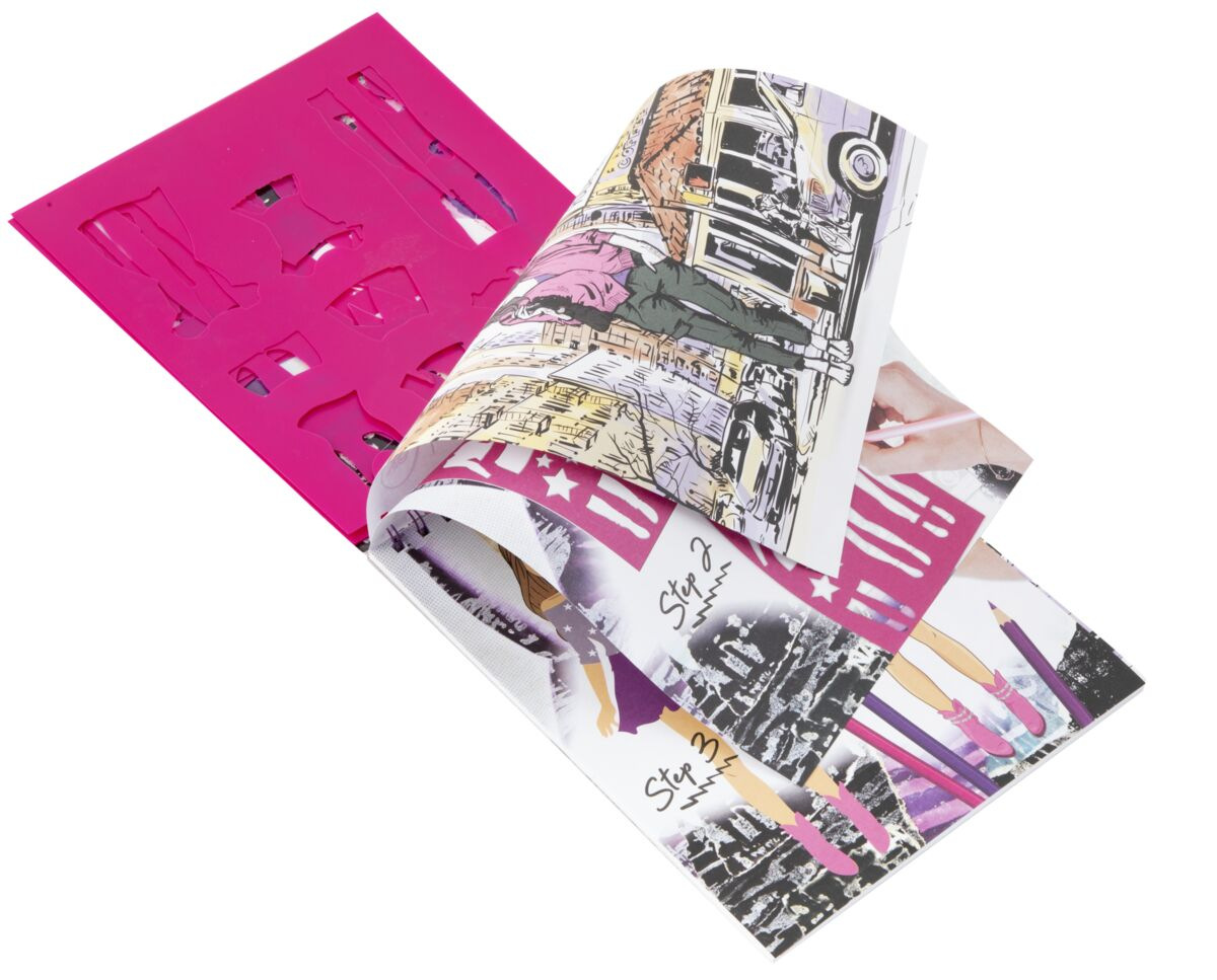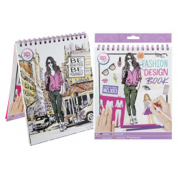 Kreativní set ve formě kroužkového bloku s motivem designu a módního návrhářství obsahuje 36 listů předloh, které je možné vymalovat s pomocí 5 listů šablon a doplnit pomocí přiložených samolepek