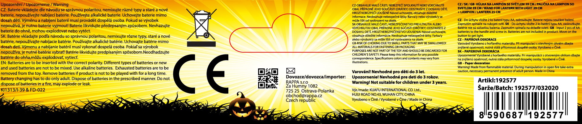 Papierlaterne mit Kürbismotiv und dazu leuchtender Stab. Das ideale Set für eine Halloween-Party oder einen Laternenumzug! Der Zauberstab benötigt 2 AA-Batterien, die nicht im Lieferumfang enthalten sind. Durch Umschalten des Schalters am Griff leuchtet der Stab.