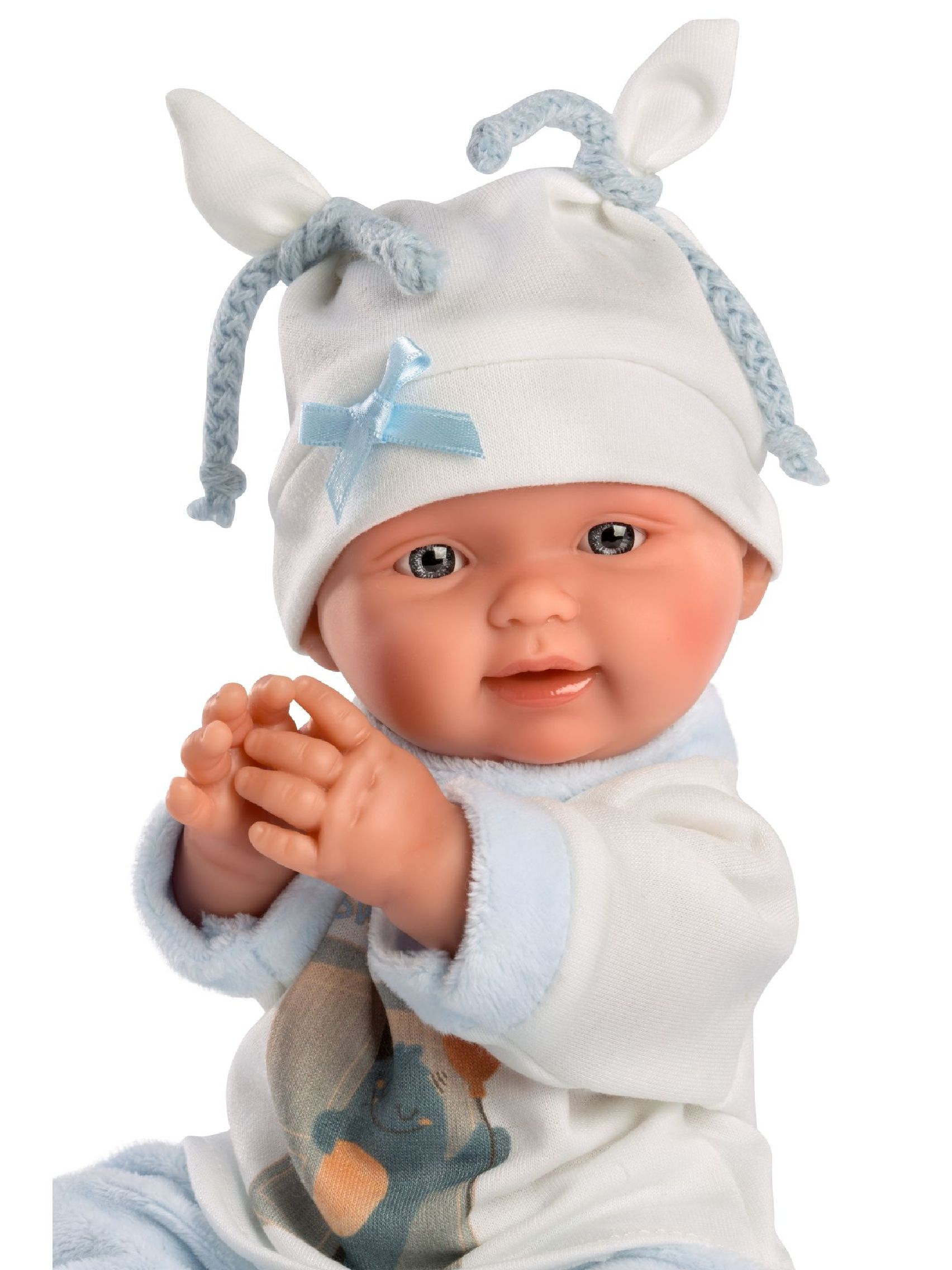 Ein lautloses Baby mit einem badbaren Vinylkörper, der buchstäblich jedes Detail des Babykörpers einfängt, einschließlich süßer Babyfalten und Geschlecht. Die Arme und Beine sind über ein Gelenk mit dem Körper verbunden. Das Baby ist verstellbar und kann sogar sitzen. Der im Paket enthaltene Schnuller ist lediglich ein Zubehör. Größe 26 cm. Handgefertigt in Spanien, verpackt in einer Geschenkbox. Altersempfehlung ab 3 Jahren.