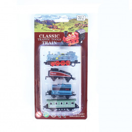 Mini-Zug mit Rückzugmechanismus. Das Set enthält eine Metalllokomotive und 3 Kunststoffwaggons. Die Lokomotive hat eine Länge von ca. 7 cm.