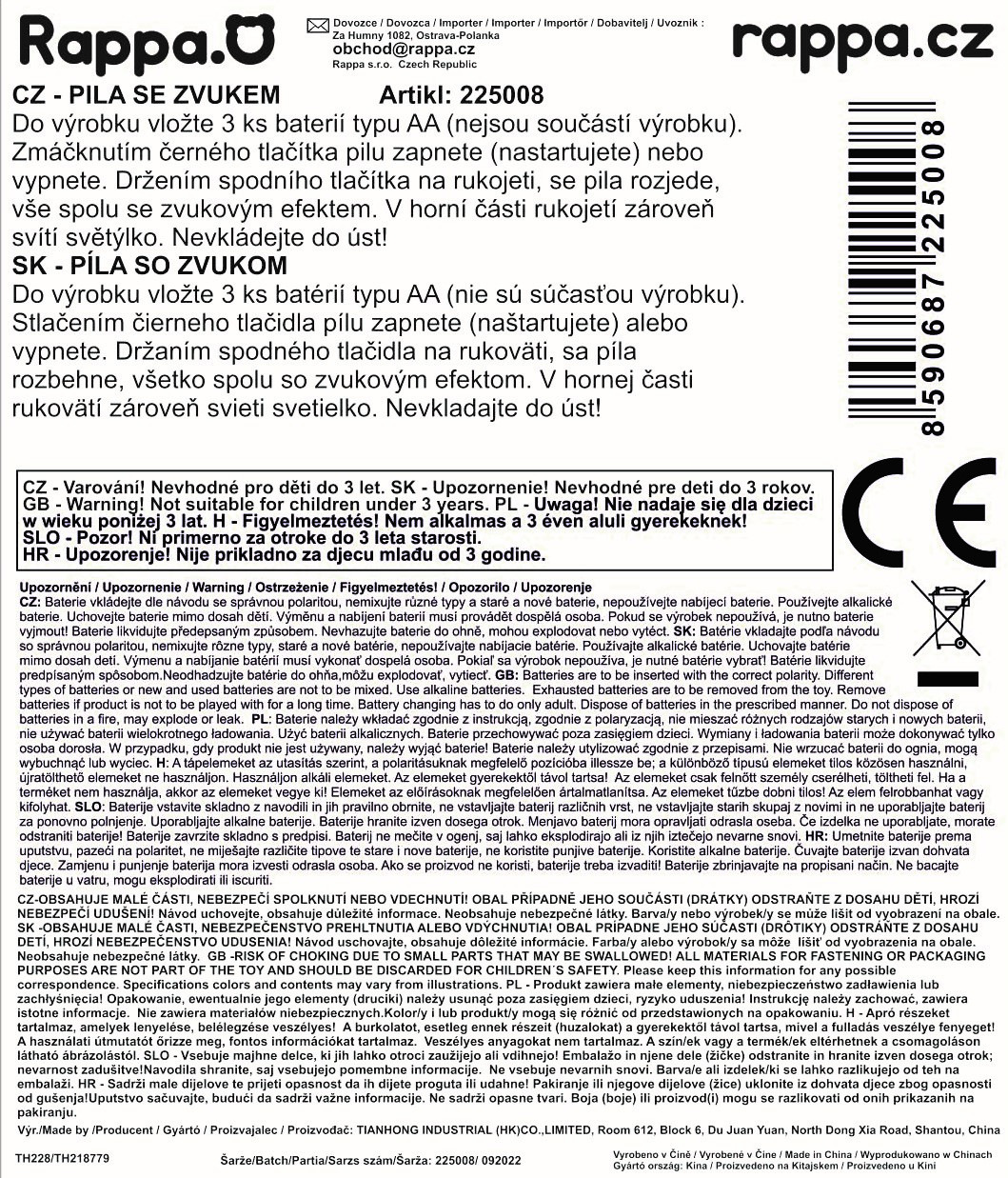 Diese Kettensäge wird sicherlich allen Jungen gefallen und das nicht nur, weil sie echt aussieht. Wenn Sie den Knopf drücken, ertönt ein Geräusch, das Licht geht an und die Kette beginnt sich wie bei einer echten Säge zu drehen. Es funktioniert auf 3x1.5-V-AA-Batterien, nicht im Lieferumfang enthalten. Die Länge des Produkts beträgt ca. 40 cm.