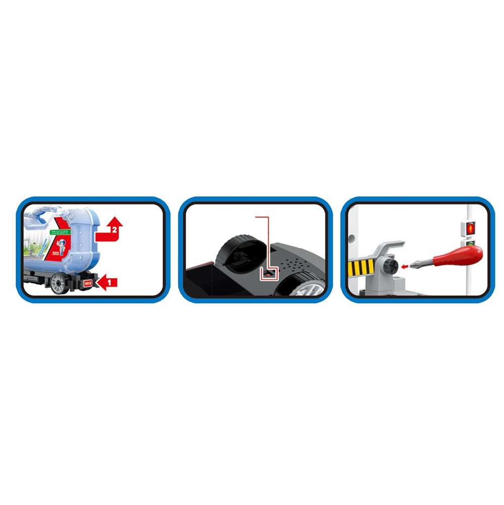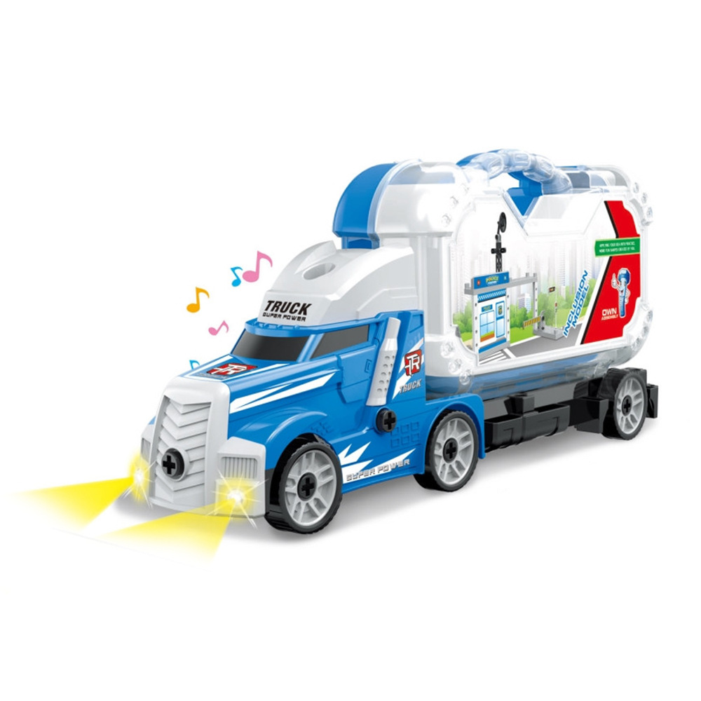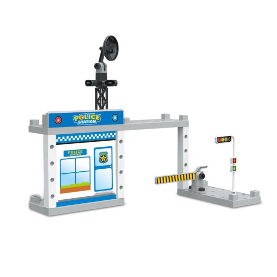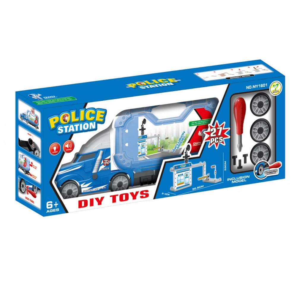 Die Polizei braucht deine Hilfe! Baue deine Polizeibasis auf, nimm den Koffer aus dem LKW und benutze die Teile, um die Räder zu reparieren! Das Set enthält ein großes Auto mit einem Reparaturkoffer, ein kleines Hilfsfahrzeug und Teile zum Zusammenbau einer Polizeibasis. Das Auto gibt realistische Geräusche von sich und blinkt. 3 Stück Batterien vom Typ AG13 sind im Lieferumfang enthalten. Mit diesem Auto können Kinder ihre Geschicklichkeit entwickeln!