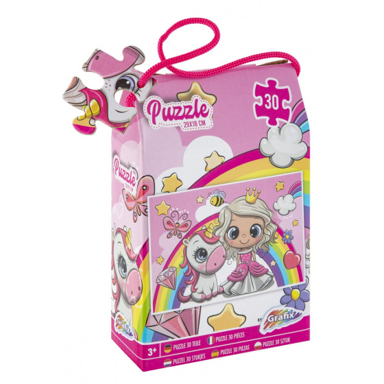 Nádherné dětské puzzle obsahující 30 velkých dílků, které po složení vytvoří obrázek s motivem princezny a jednorožce o rozměru 29x18 cm, baleno v krásné dárkové krabičce s uchem