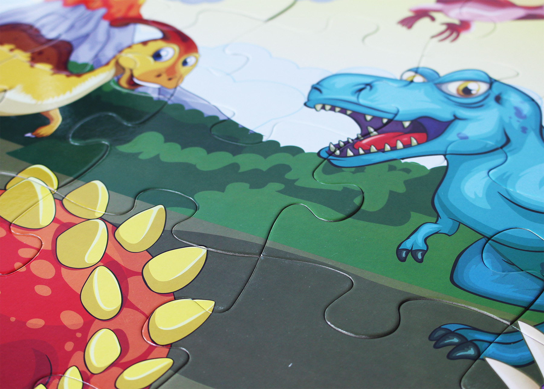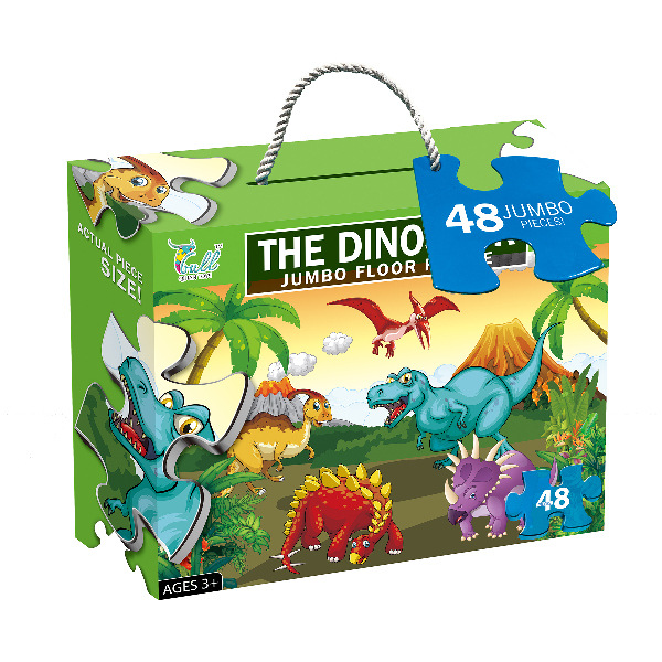 Bodenpuzzle für Kinder mit Dinosaurier-Motiv. Die Verpackung enthält 48 Teile, die einzelnen Teile sind groß genug für einen einfachen Griff. Das Endbild hat eine Größe von 92 x 62 cm. Geeignet für Kinder ab 3 Jahren.