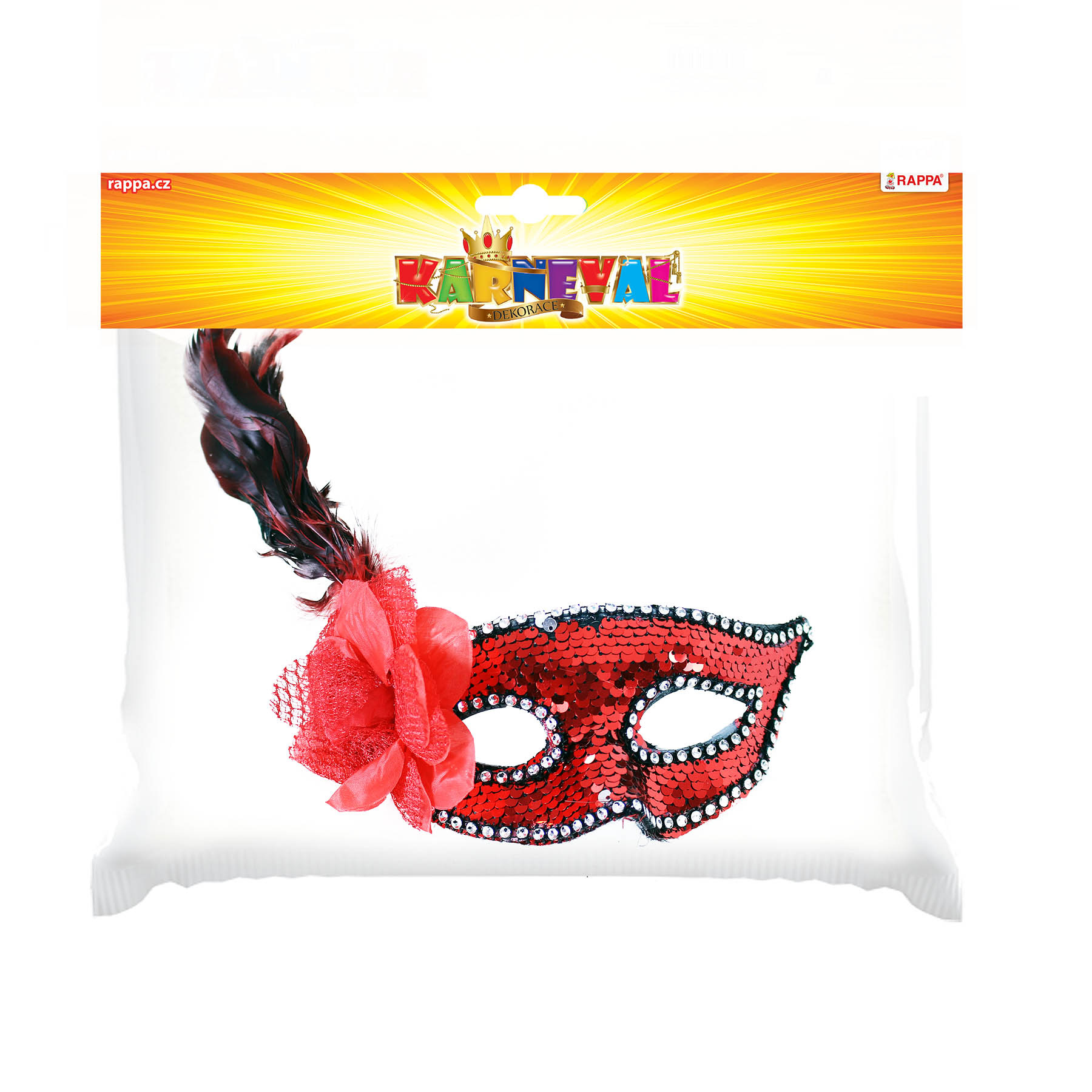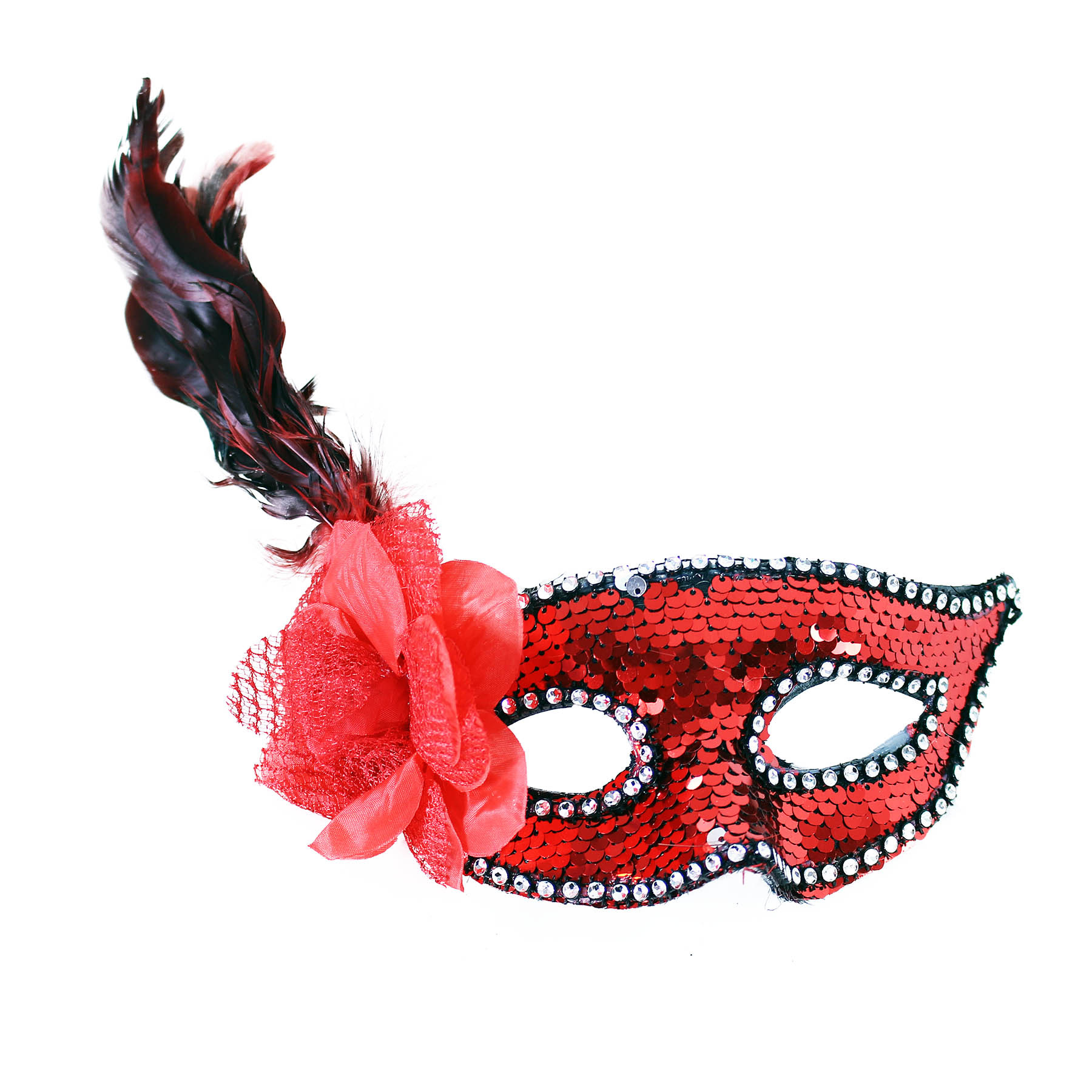Die rote elegante Maske mit Gummiband ist mit Pailletten verziert und mit weißen, glänzenden Steinen gesäumt. Auf der rechten Seite ist sie mit einer roten Blume und Federn dekoriert.