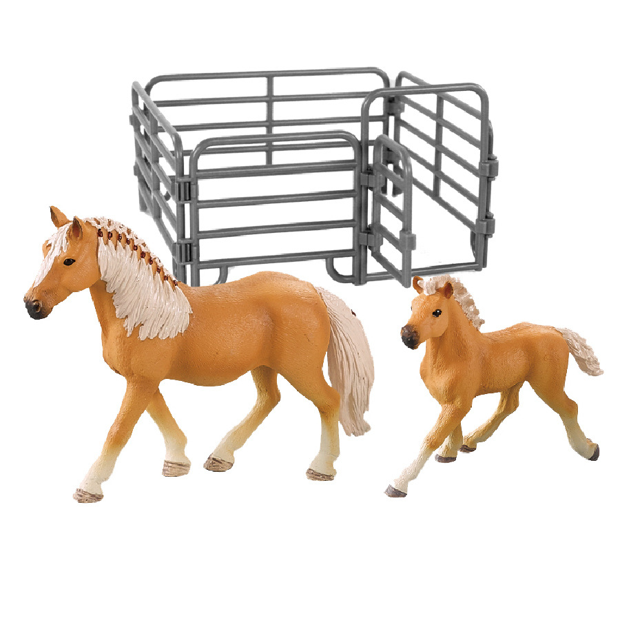 Figur eines Pferdes und Fohlens in brauner Farbe mit heller Mähne. Im Lieferumfang ist auch ein Gehege enthalten. Ideal für Pferdeliebhaber. Dieses Spielzeug ist Teil der Kollektion Mein kleiner Bauernhof.