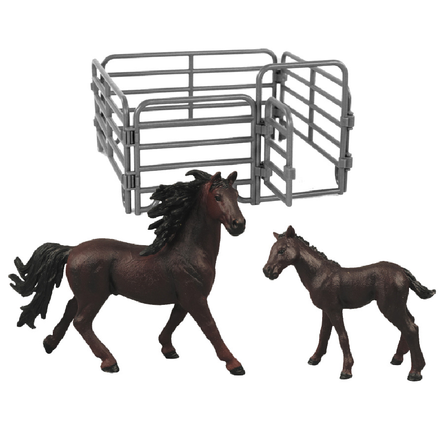 Figur eines Pferdes und eines Fohlens in dunkelbrauner Farbe mit schwarzer Mähne. Im Lieferumfang ist auch ein Gehege enthalten. Ideal für Pferdeliebhaber. Dieses Spielzeug ist Teil der Kollektion Mein kleiner Bauernhof.