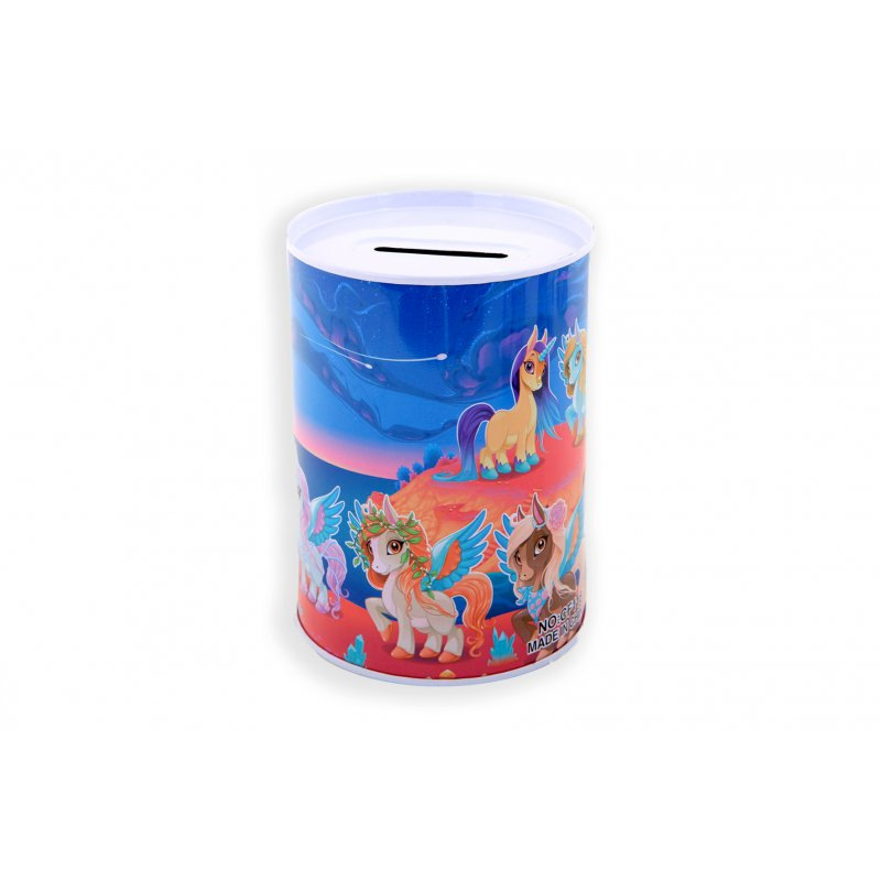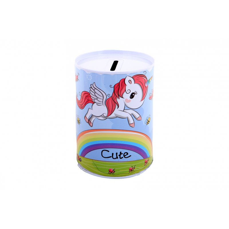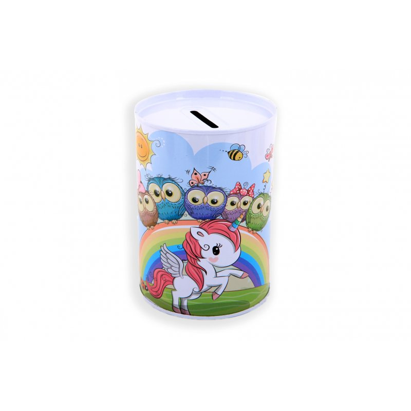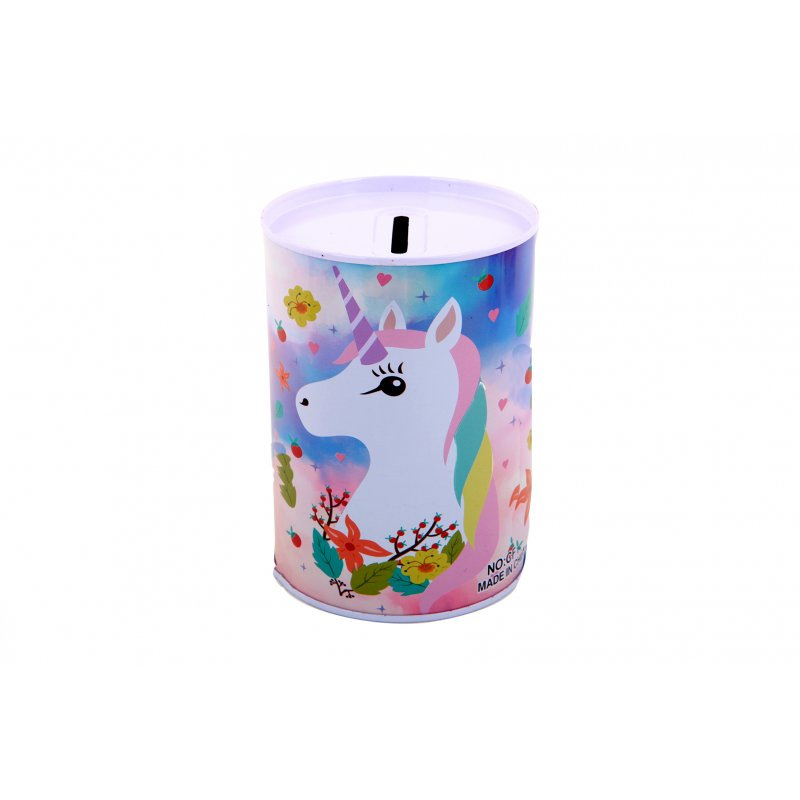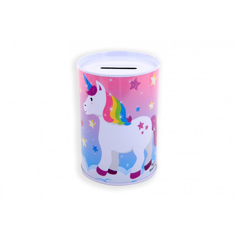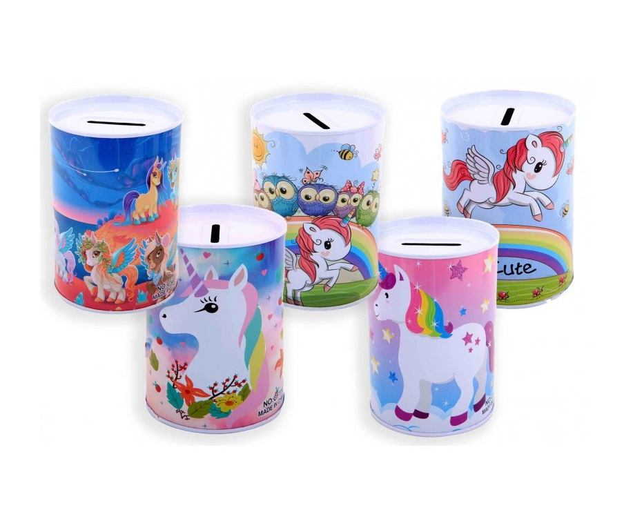 Blechspardose mit Einhornmotiv, 5 Sorten, 8,5x12 cm. Eine Auswahl eines bestimmten Typs ist nicht möglich, wir liefern nach Lagerverfügbarkeit.