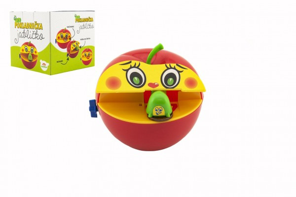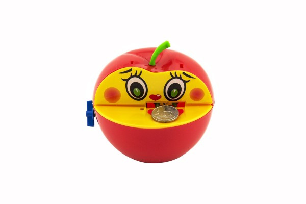 Die Plastikspardose in Form eines Apfels hat einen mechanischen Aufziehmechanismus mit einem Schlüssel. Nach dem Einwerfen der Münze nimmt der Wurm die Münze und versteckt sie im Apfel. Die Münzen können entnommen werden, indem man den Deckel am Boden der Spardose abklappt. Verpackungsmaße 11 x 11 x 10 cm.