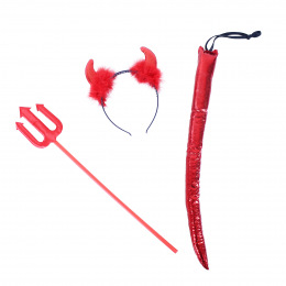 Niedliches Teufel-Set, in dem Sie ein Haarband mit Hörnern, einen Schwanz und einen Gabelstab finden