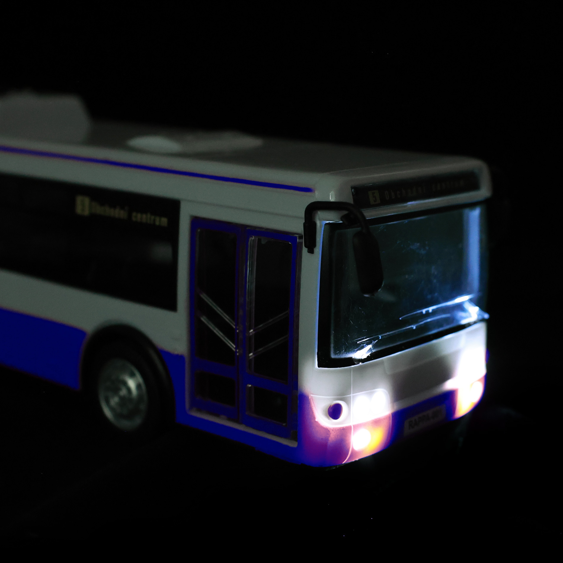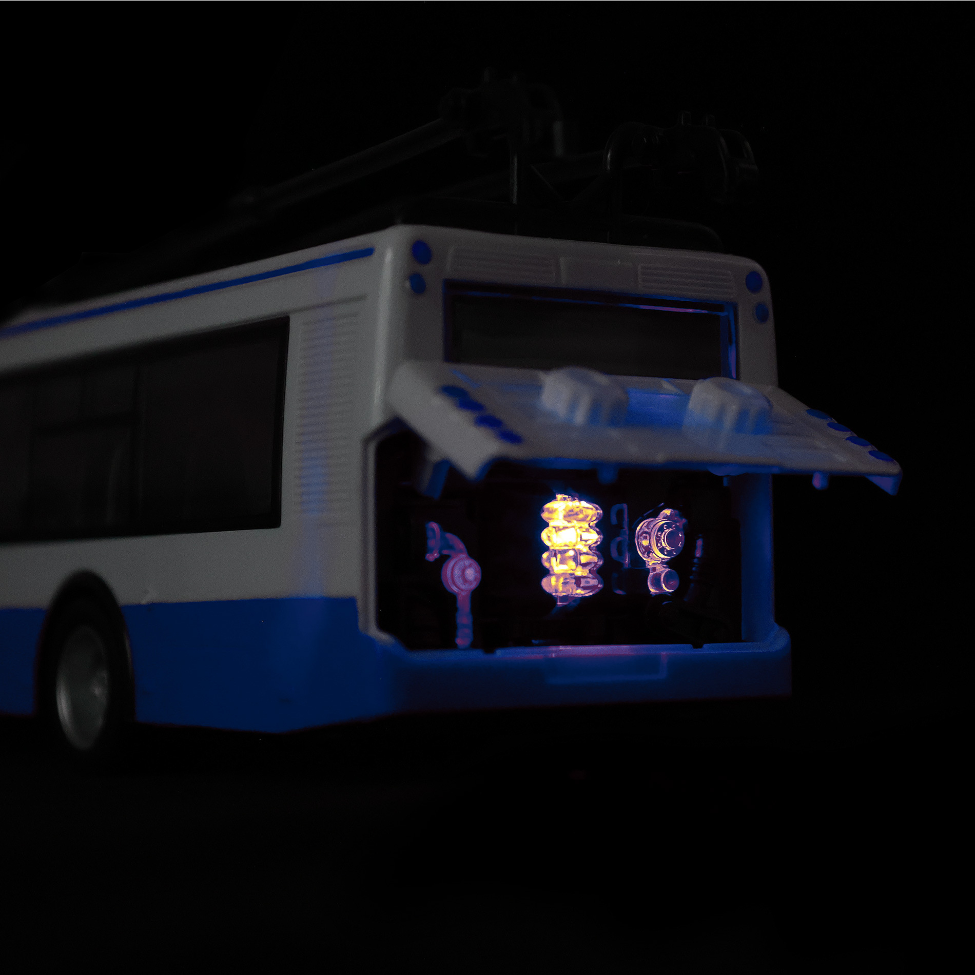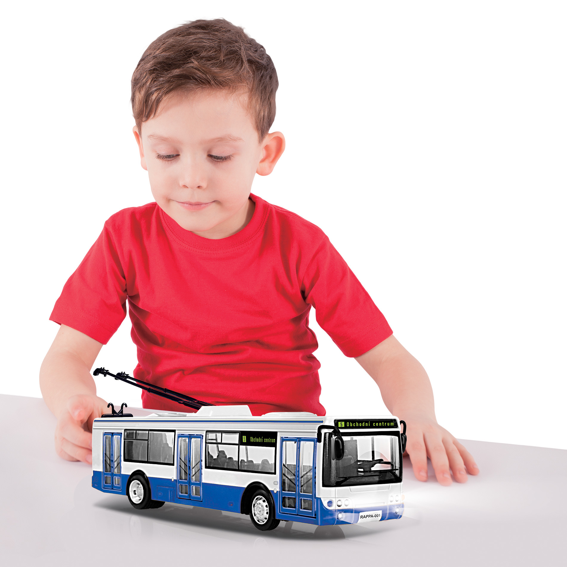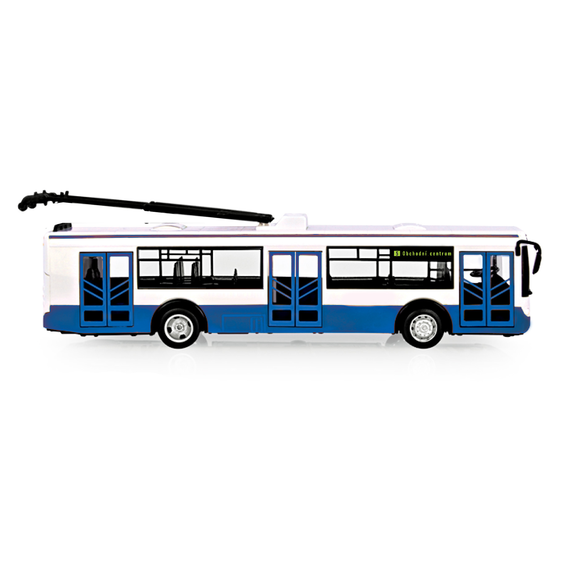 Rychle nastoupit, zavřít dveře a jedeme! Originální trolejbus, který oznamuje stanice v českém jazyce a jezdí na zpětný chod. Dveře lze manuálně otevřít a zavírají se pomocí tlačítka umístěného na střeše vozu. Při každém otevření se ozve hlášení, při zavření navíc blikají přední světla trolejbusu. Trolejbus je vyroben v délce 28 cm a měřítku 1:43. Vyžaduje použití 3 ks baterií typu LR44/AG13, které jsou součástí balení. Tahle unikátní hračka nesmí chybět fandům ekologické dopravy!