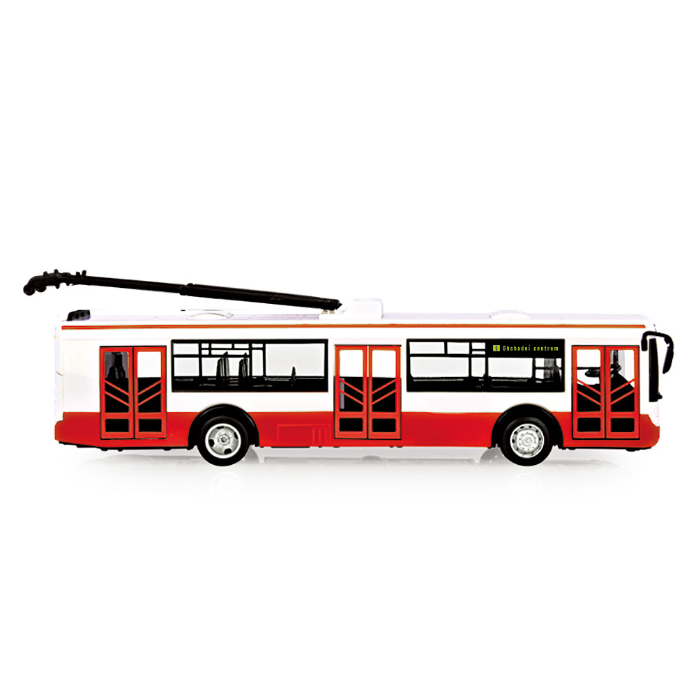 Schnell einsteigen, Türen schließen und los geht's! Ein origineller Oberleitungsbus, der die Haltestellen auf Tschechisch ansagt und im Rückwärtsgang fährt. Die Türen können manuell geöffnet werden und schließen sich mit einem Knopf, der auf dem Dach des Fahrzeugs angebracht ist. Bei jedem Öffnen ertönt eine Ansage, beim Schließen blinken zusätzlich die Frontlichter des Trolleybusses. Der Trolleybus ist aus Kunststoff gefertigt, hat eine Länge von 28 cm und benötigt 3 Batterien, die im Lieferumfang enthalten sind. Dieses einzigartige Spielzeug darf in Ihrer Sammlung auf keinen Fall fehlen!