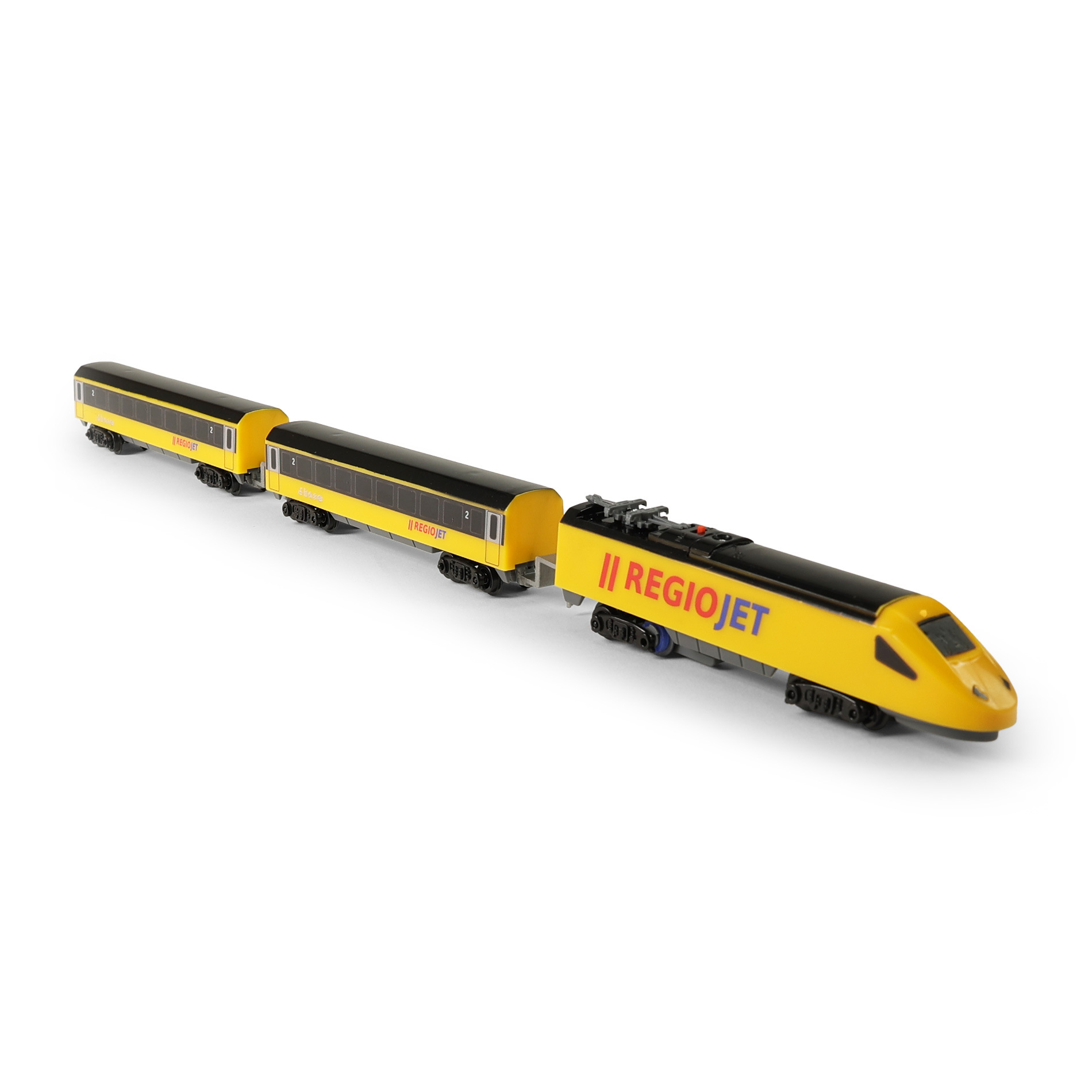 Milujete cestování vlakem? Tak sestavte koleje, postavte na ně lokomotivu, připojte vagóny a vzhůru za dobrodružstvím! Originální žlutý vlak RegioJet od Student Agency obsahuje žlutou lokomotivu a 2 žluté vagónky, 8 zahnutých a 4 rovné koleje. Lze vytvořit kolejiště až do velikosti 96 x 58 cm. Rozteč kolejí je 1,4 cm. Lokomotiva měří na délku 14 cm a vagón 13,5 cm. Lokomotiva jezdí na 1 ks AA baterie (není součástí), na střeše lokomotivy vypínačem ON/OFF (zapnuto/vypnuto) uvedete vlak do chodu. Vlak RegioJet MINI lze kombinovat s vlakem Pendolino MINI a Slovenské dráhy MINI.