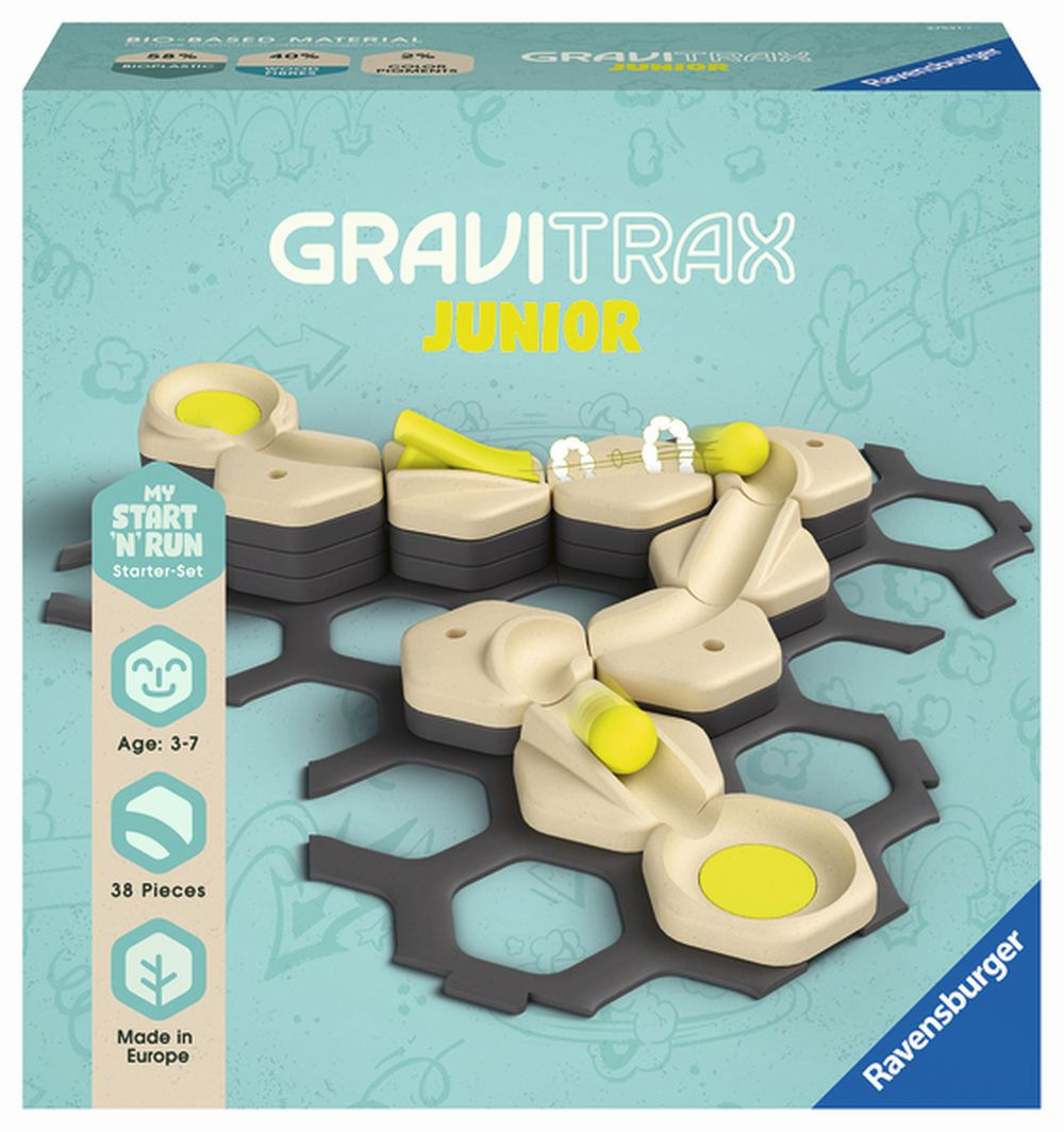 GraviTrax Junior ist ein interaktives Kugelbahnsystem für Kinder ab 3 Jahren. Aus Kugelbahnen, die nach Belieben dekoriert werden können, bauen die Kleinen ihre eigenen Welten und schaffen so individuelle Themenwelten. Beim kreativen Bauen haben Kinder viel Spaß. GraviTrax Junior Starter Set Start ist das ideale Starterset und der Einstieg in die Welt von GraviTrax Junior. Mädchen und Jungen ab 3 Jahren bauen ihre eigenen Kugelbahnwelten. Alle Komponenten bestehen aus Holz-Biokunststoff. Das Start-Starterkit kann mit Zubehör, weiteren Starter- oder Erweiterungskits erweitert werden. Es lässt sich außerdem mit einem Themenset kombinieren und so in eine Themenwelt verwandeln.