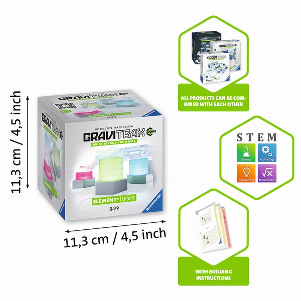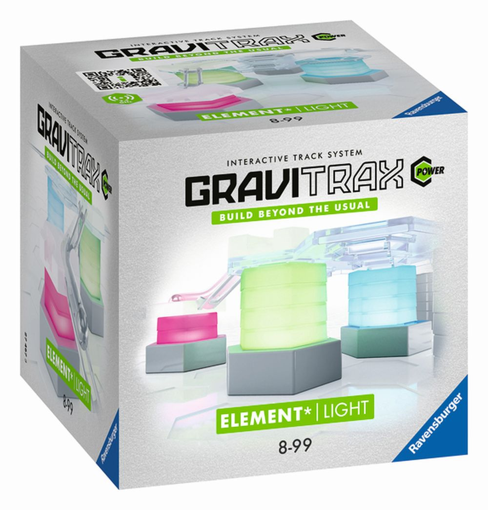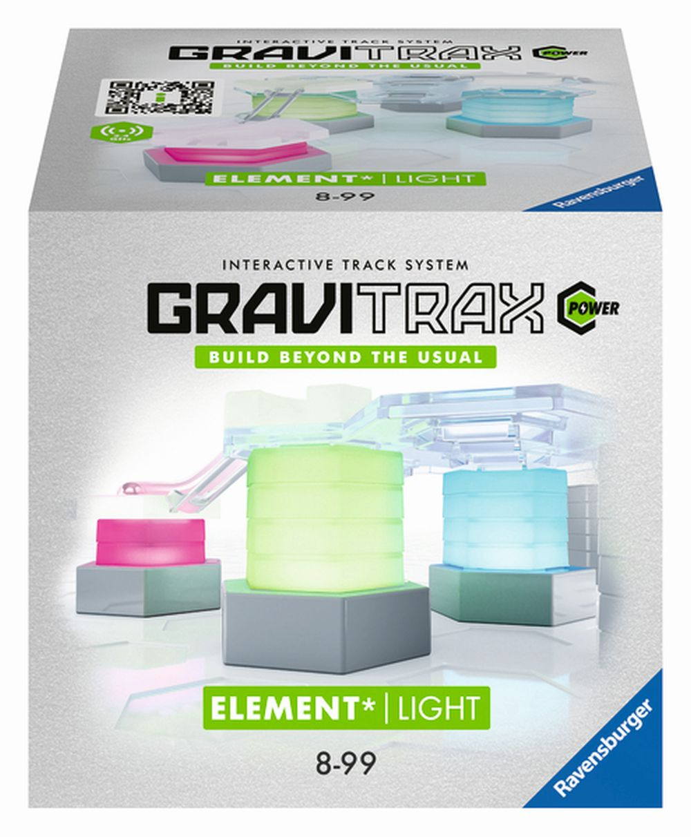 Tolle Lichteffekte für jede GraviTrax-Strecke: Mit dem GraviTrax POWER Light Element ist das kein Problem! Insgesamt 3 Lichtsäulen in Kombination mit transparent strukturierten Höhensteinen ermöglichen es Ihnen, die Lichtsäulen in beliebiger Höhe aufzubauen und in jede GraviTrax-Strecke zu integrieren. Zusätzlich kann der Spieler per Knopfdruck die Farbe des Lichts ändern.
