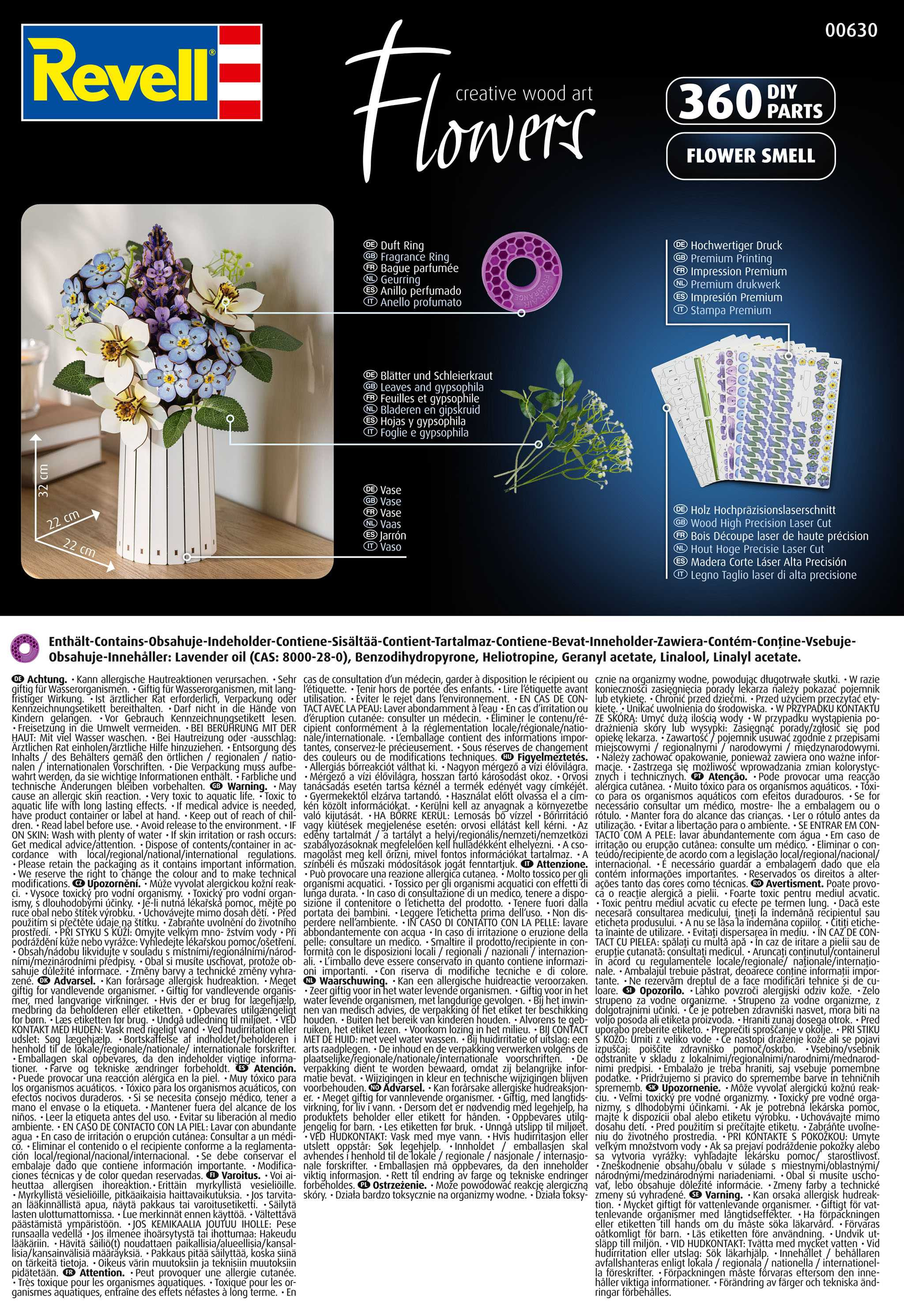 Trend „botanické stavby“ – tedy replikace rostlin z odolných materiálů – se těší celosvětově rostoucí oblibě. Je to moderní interpretace zátiší. Revell jde ještě o krok dále a spoléhá na přírodní materiál dřevo, který kombinuje udržitelnost a estetiku. Kombinace vizuální krásy a čichové přitažlivosti prostřednictvím vonného kroužku dělá z této sady inovaci v oblasti kreativního interiérového designu. Určeno pro osoby starší 14 let.