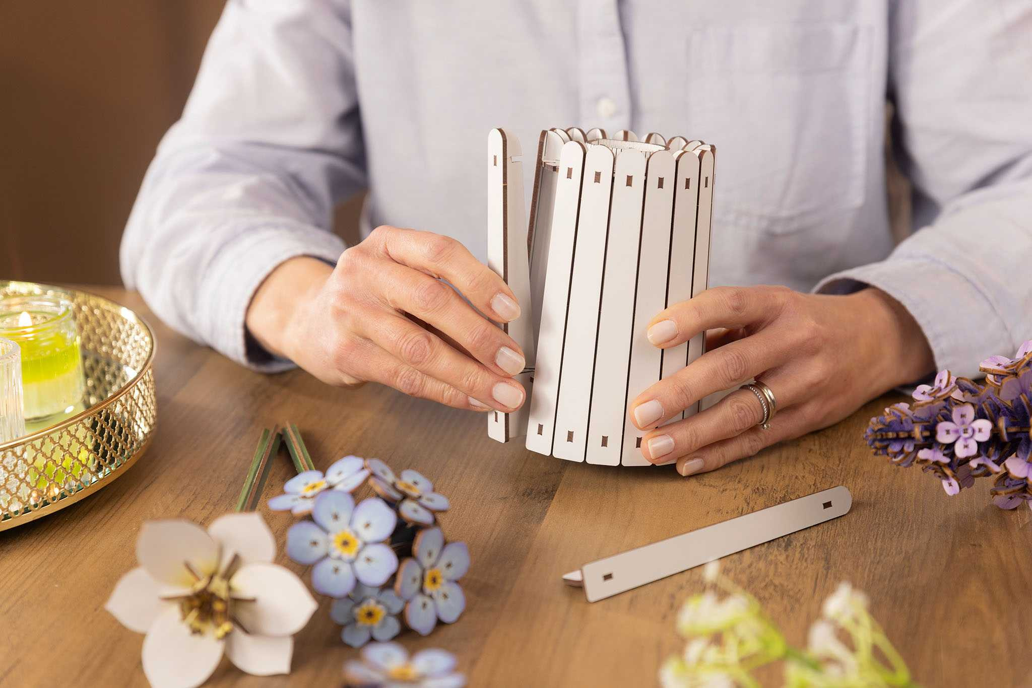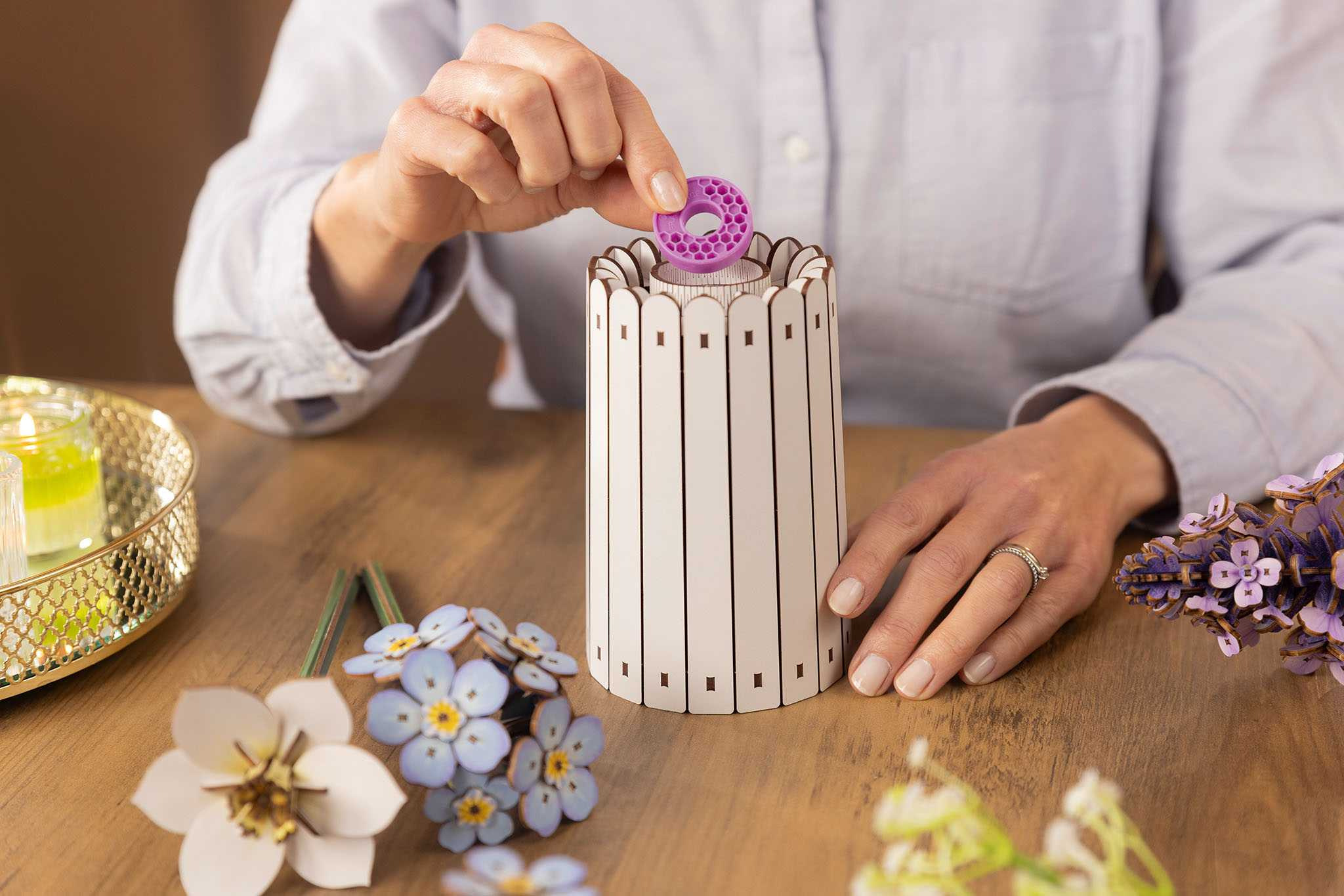 Obsah balení Vysoce kvalitní dřevěná sada na květiny a vázu Integrovaný vonný kroužek Snadno srozumitelný návod na stavbu