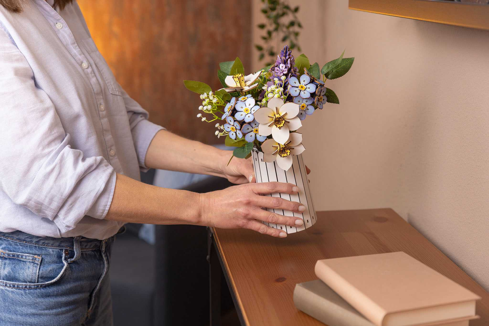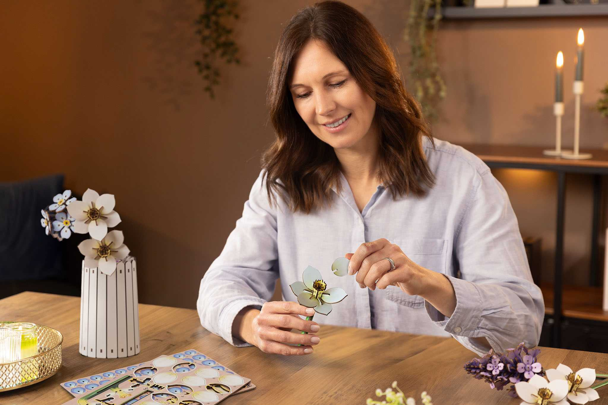 Proč tato kytice dojímá všechny smysly Jemné dřevěné prvky jsou navrženy tak, aby dokonale napodobovaly organické tvary skutečných květin a listů. Díky integrovanému vonnému kroužku z modelu vyzařuje nejen vizuální kouzlo, ale také příjemná vůně - jako skutečná kytice. Nemusíte shánět vhodnou vázu - stylová váza (také snadno sestavitelná) je součástí setu a dotváří celkový obraz. S výškou 32 cm a šířkou 22 cm je aranžmá ideální poutač na jídelní stůl, komodu nebo psací stůl. Skládání vysoce kvalitních dřevěných dílů dohromady je čistá relaxace a podporuje koncentraci.