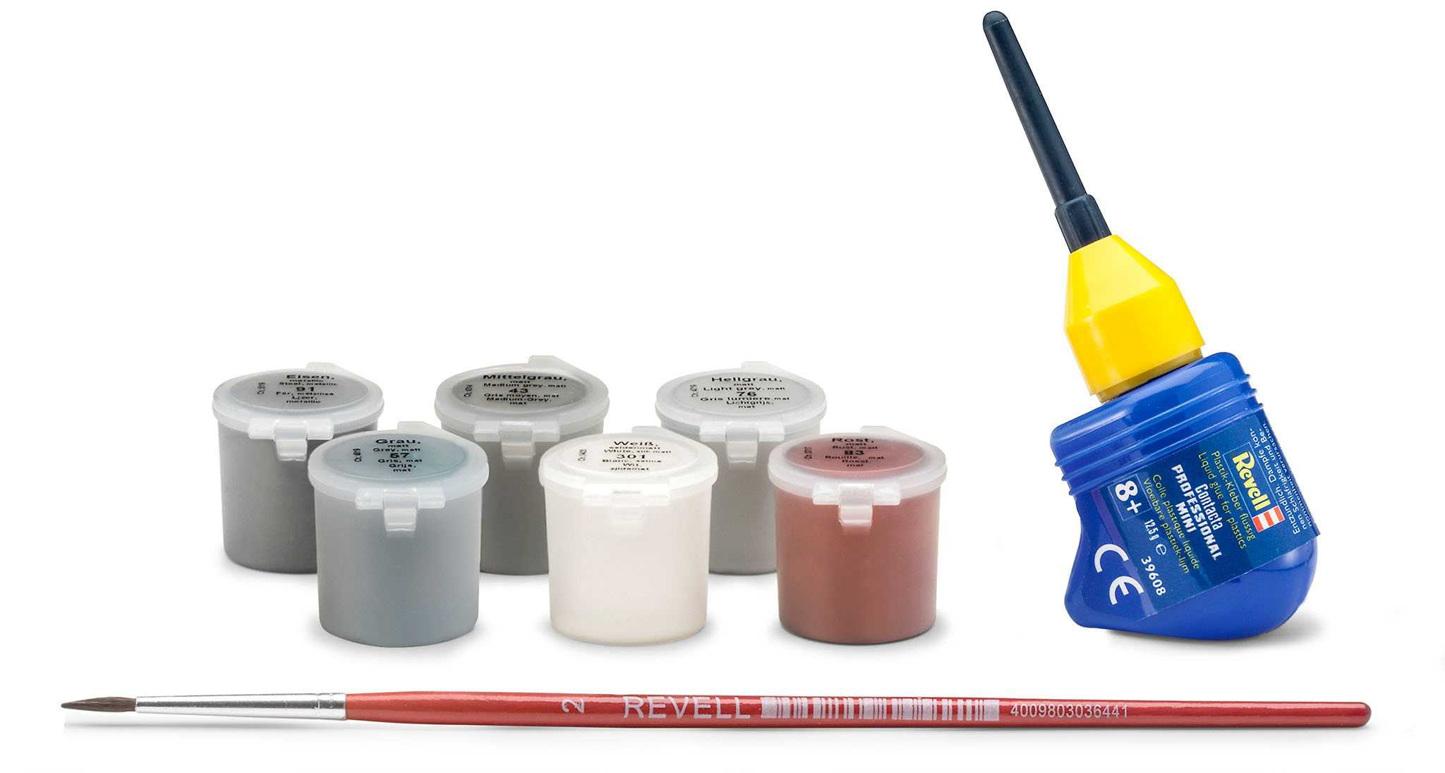 2 Plastikmodelle (unmontiert), illustrierte mehrsprachige Bauanleitung, Abziehbilder, Farben (Revell Aqua Color), Pinsel, Kleber (Revell Contacta Professional Mini)