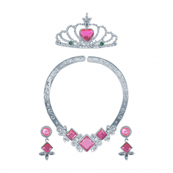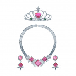 Elegantní sada doplňků, která promění každou malou slečnu v pohádkovou princeznu! Souprava obsahuje korunku, náhrdelník a náušnice ve stříbrné barvě, zdobené zářivými růžovými kamínky.