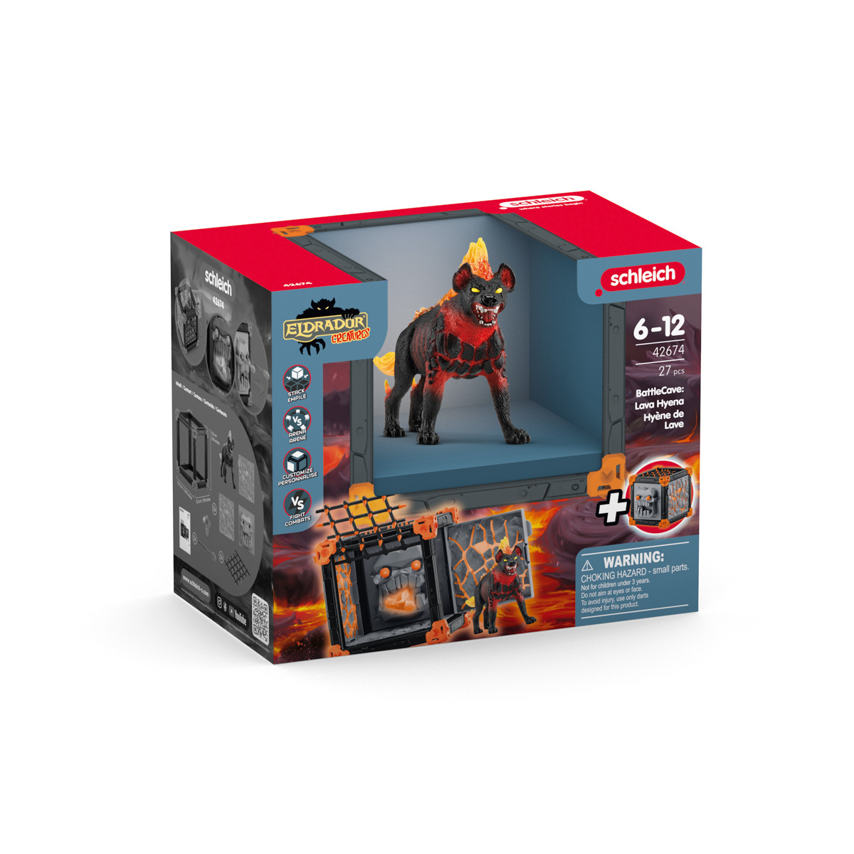 Lávová hyena se s rozzářenýma očima hrozivě nahrbí před svou arénou BattleCave. Kdo se odváží bojovat? Je to obrana krystalu světa, který je ukrytý v aréně BattleCave. V aréně je vidět podlá maska s krystalem v ústech. Strašidelné – a ano, ty oči vypadají jako střílející šípy! Ti, kteří se odváží vylézt na arénu BattleCave, musí být opatrní, protože se mříže snadno otevřou do záludné pasti. Jakmile se ocitneš v aréně BattleCave, lávová hyena tě rozhodně nenechá tak rychle znovu utéct… Arény ELDRADOR® CREATURES BattleCaves promění každý dětský pokoj v akční zónu! Kdo bude čelit dechberoucí bitvě? Všechny arény BattleCaves lze kombinovat. Na útočníky čekají děsivé tunely a záludné pasti. Ve velké aréně se pak mohou utkat v závěrečném souboji. To je ale boj! Rozměry balení: 23 x 16,5 x 28,5 cm. Věk: 7-12