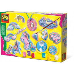 Máte také rádi jednorožce? Tato sada SES Creative vám umožní vytvořit si různé druhy figurek jednorožců vyrobených ze sádry. Nalijte sádru do formy a nechte ji zaschnout.Použijte přiložené barvy a vybarvěte si všechny jednorožce podle svých představ, nakonec je posypejte třpytkami. Výsledek je fantastický! Sada obsahuje: sádru, formu, 6 barev, štětec, pomůcku na uhlazení sádry, stříbrné třpytky v tubě, modrou saténovou stuhu. Věk: 5+