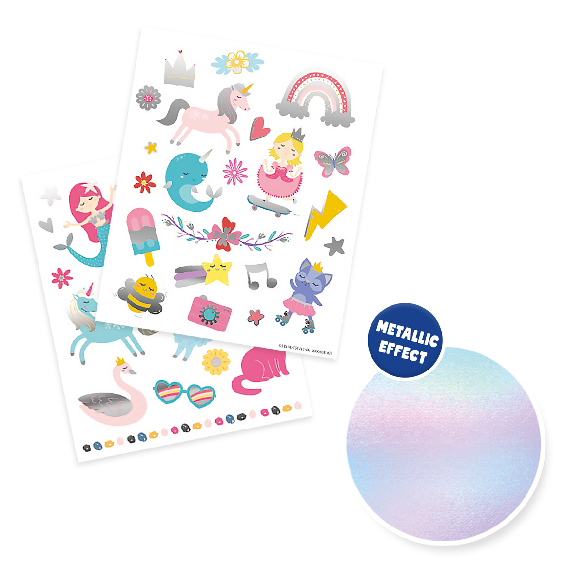 Úžasná tetování s metalickým efektem rozzáří dětem den. Vyberou si odvážnou princeznu na skateboardu, nebo si na ruku nalepí krásného jednorožce? Sada obsahuje 40 veselých a roztomilých motivů. Tetování se snadno nanáší a stejně jednoduše se smývá z pokožky. Pohádkové téma s vtipnými ilustracemi. Kosmeticky testováno. Rozměry balení: 20 x 15 x 0,5 cm. Věk: 3+
