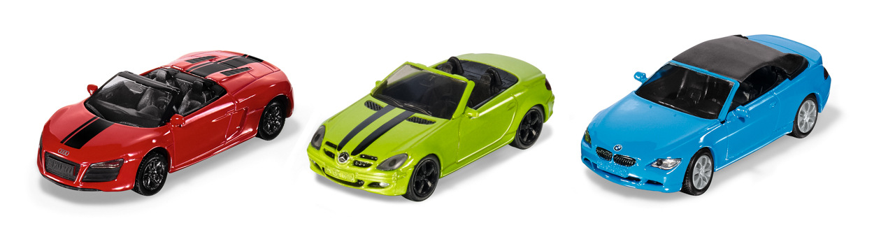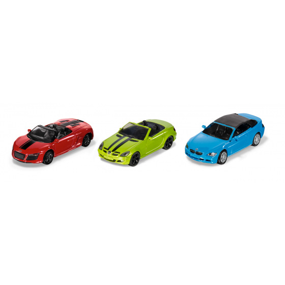 SIKU Super - set kabrioletů 3ks. Jakmile se na obloze objeví první sluneční paprsky, zažijí vášnivý řidiči kabrioletů krásný okamžik. Samozřejmě je ještě krásnější, když si můžete vybrat ze třech kabrioletů. Mercedes SLK, Audi R8 Spyder a BMW 645i. Tři vozidla různého charakteru. Mercedes je sportovní dvoumístný kabriolet. Zelené lakování a dva pruhy podtrhují jeho ctižádost. Audi R8 je nekompromisní závodník. To je zdůrazněno červeným lakem a dvěma pruhy. 10-válcový motor zrychluje dvoumístný model vyrobený v Neckarsulmu na 313 km/h. BMW 645i je naprosto odlišný: Díky velkému motoru V8 a 333 HP jede hladce, ale přesto až 250 km/h. Poutavý světle modrý model se skládací střechou. Rozměr balení: 17 x 10 x 5,7 cm. Věk: 3+.