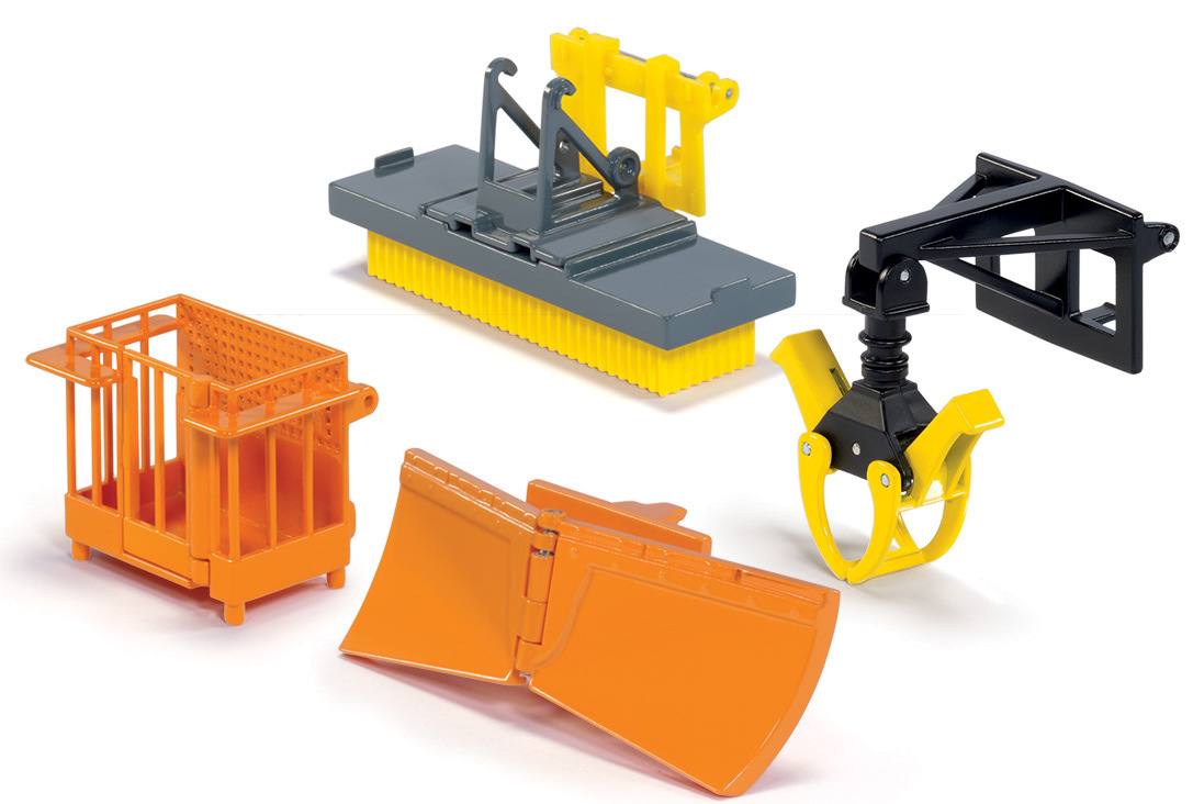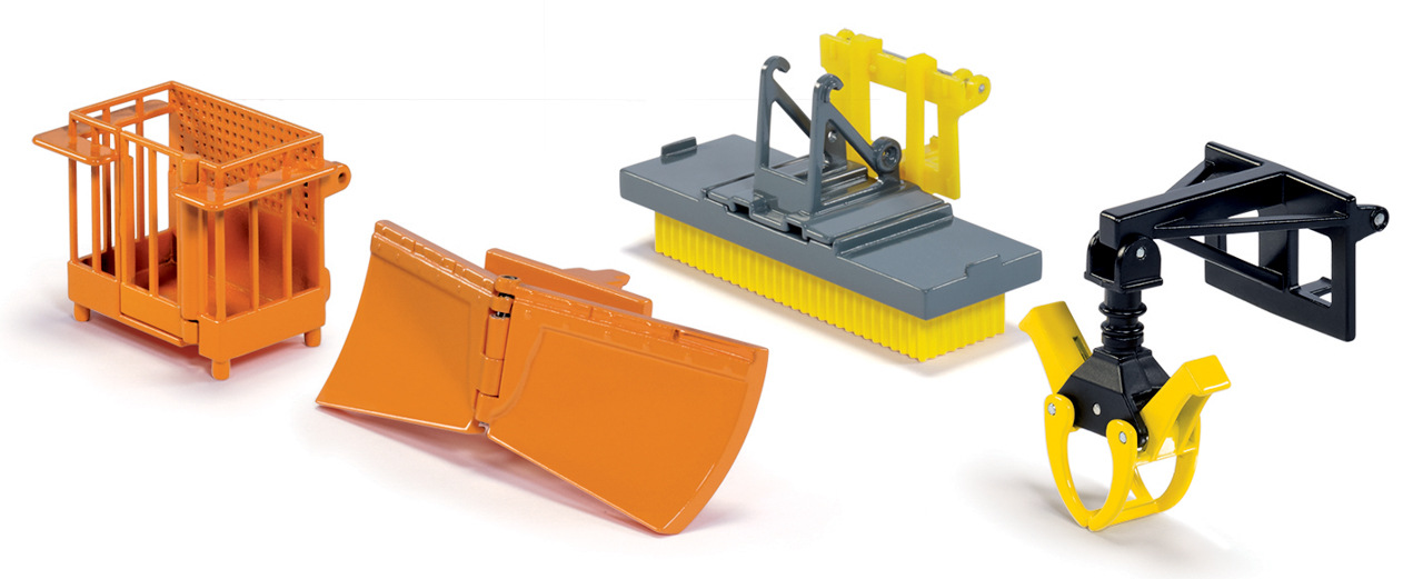 Řada upevňovacích zařízení pro traktory SIKUFARMER32 s předními nakládači. Skládá se s pracovní plošiny, sněhového pluhu, zametacího kartáče a naběrače kmenů stromů. Pracovní plošina je také vybavena dveřmi. Sněžný pluh se může pohybovat zleva doprava a všechny tři sběrače kmenů mají volně pohybující se "drápy". Charakteristickým rysem zametacího kartáče je dodaná paletová vidlice. Ta může být použita k vyzvednutí kartáče. Hroty paletové vidlice Fendt 939 Vario s čelním nakládačem traktoru z řady SIKUCONTROL32 také pasují do držáku zametacího kartáče. Měřítko: 1:32. Rozměr: 210 x 131 x 59 mm. Rozměr balení: 21 x 13,1 x 5,9 cm. Věk: 3+
