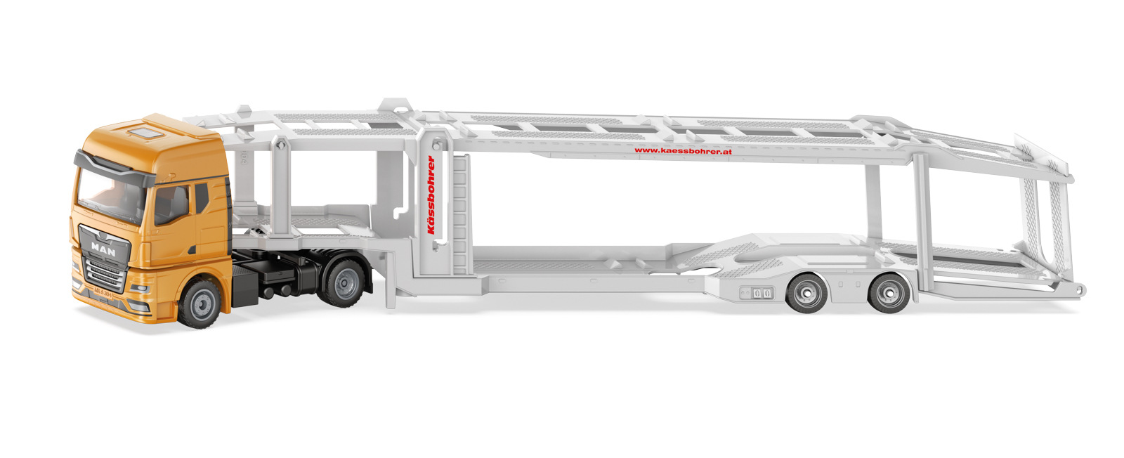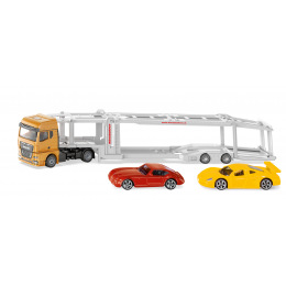Tahač lakovaný na žlutou barvu s logem MAN včetně dvou modelů Siku autíček. Je tím pravým dopravním prostředkem, pokud je potřeba převézt z místa na místo více aut nebo se vezou nová auta z výroby. Přes okna je vidět do moderní kabiny řidiče. Velký přívěs lze během okamžiku připojit k návěsu. Variabilní návěs umožňuje přepravu osobních aut i zemědělských strojů a stavebních vozidel. Vyrobeno z kovu s plastovými detaily v měřítku 1:50. Rozměr balení: 46x7,2x12 cm. Věk: 3+