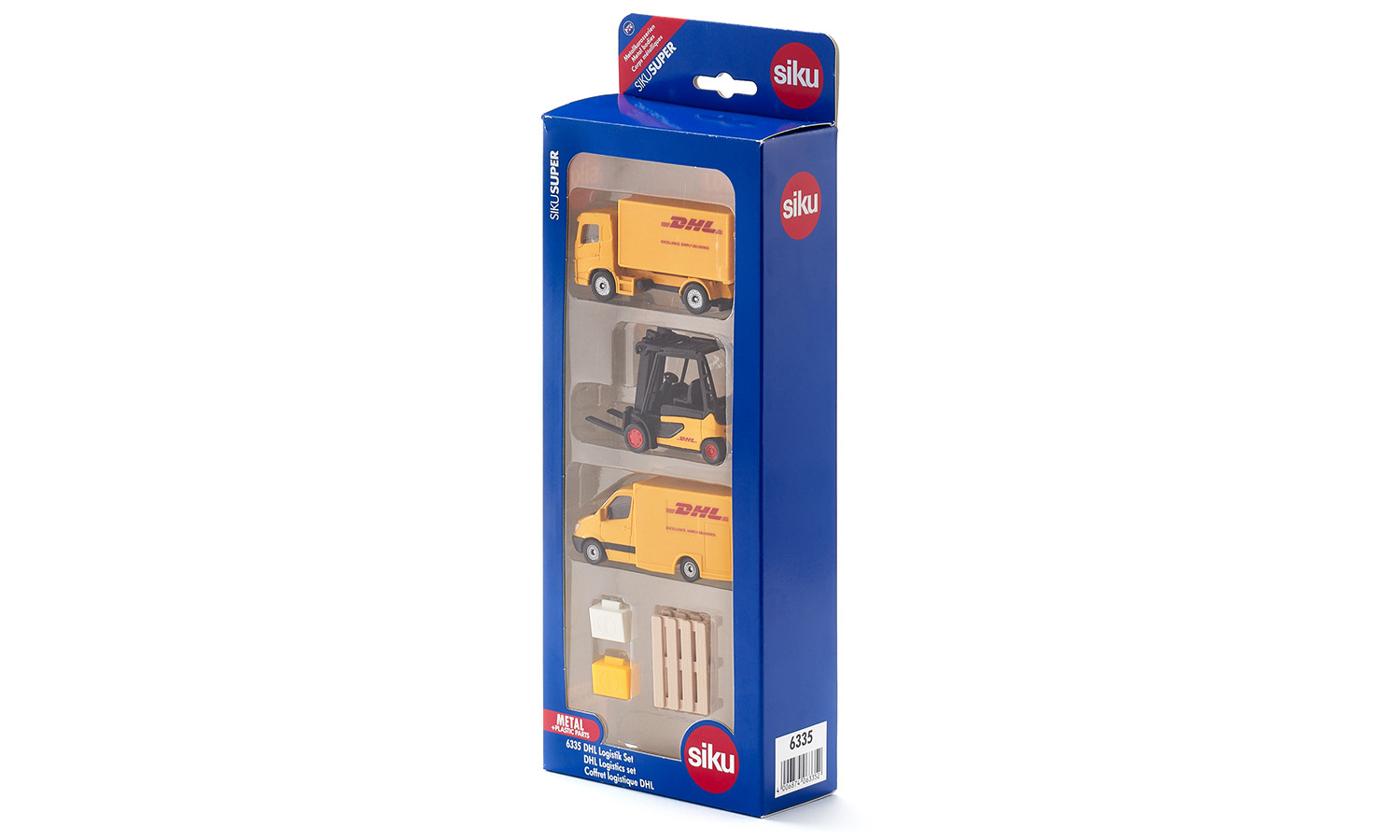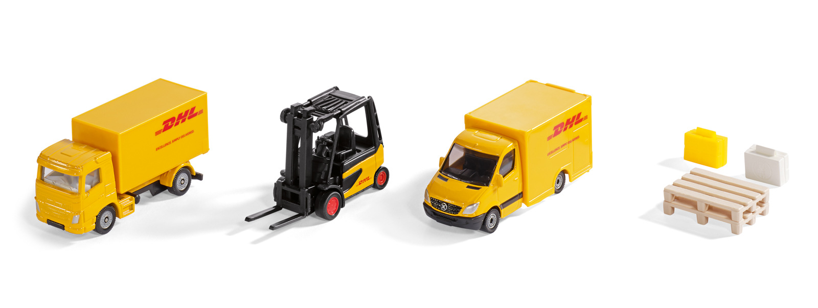 Ať už jde o metropolitní město nebo ospalou provinční vesnici: Žlutá doručovací vozidla se třemi velkými červenými písmeny expresního balíku a listovní služby DHL jsou všudypřítomná. Balíková služba byla založena v San Franciscu v roce 1969 jako společnost pro přepravu cenností: Tehdy tři zakladatelé doručovali nákladní dokumenty z lodí a další důležité dokumenty letadlem ze San Francisca do Honolulu. První písmena jejich příjmení poskytovala název společnosti: Adrian Dalsey, Larry Hillblom a Robert Lynn. Společnost DHL a její charakteristická doručovací vozidla jsou samozřejmě nezbytná také v hračkářských městech a vesnicích každé herny, kde čile sbírají a doručují dopisy, balíky a balíčky. Logistická sada DHL, skládající se z těžkého nákladního automobilu, vysokozdvižného vozíku a vozidla na doručování balíků, zajišťuje co nejhladší průběh služby. Každé z vozidel je samozřejmě okamžitě rozpoznatelné ve svém žlutém laku DHL s licencovaným nápisem DHL. Kromě toho je zde celá paleta pln