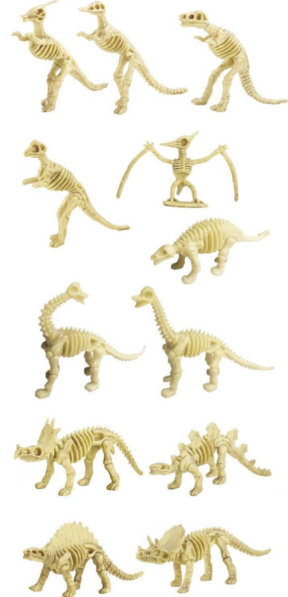 Sada na vykopávání kostry dinosaura, 12 různých druhů. Součástí je nářadí a figurka dinosaura. Velikost 6-7 cm. Baleno v displeji po 12 ks.