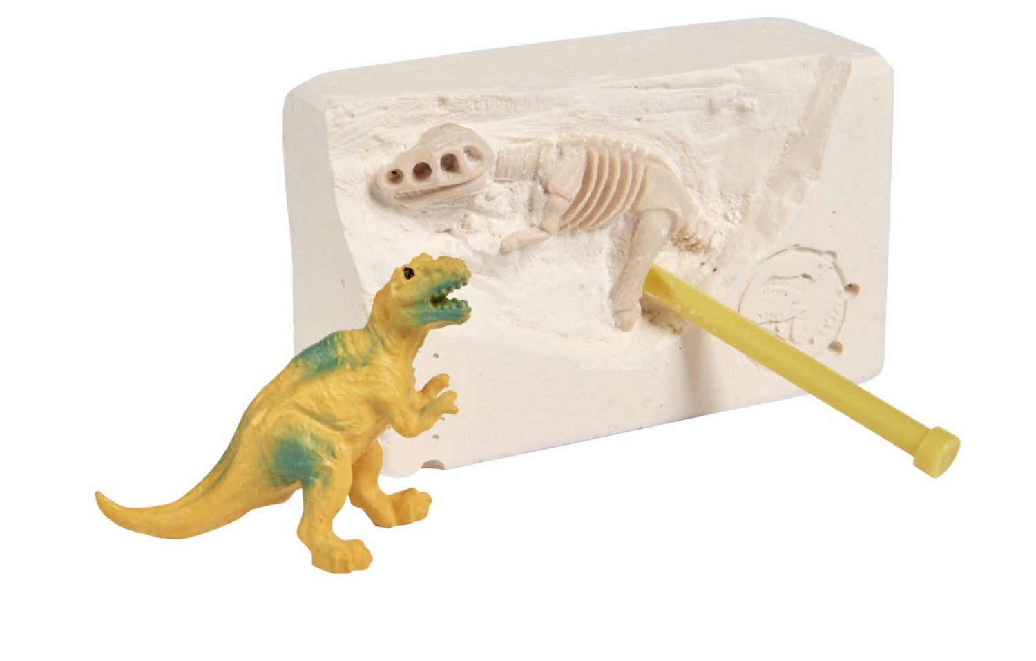 Sada na vykopávání kostry dinosaura, 12 různých druhů. Součástí je nářadí a figurka dinosaura. Velik