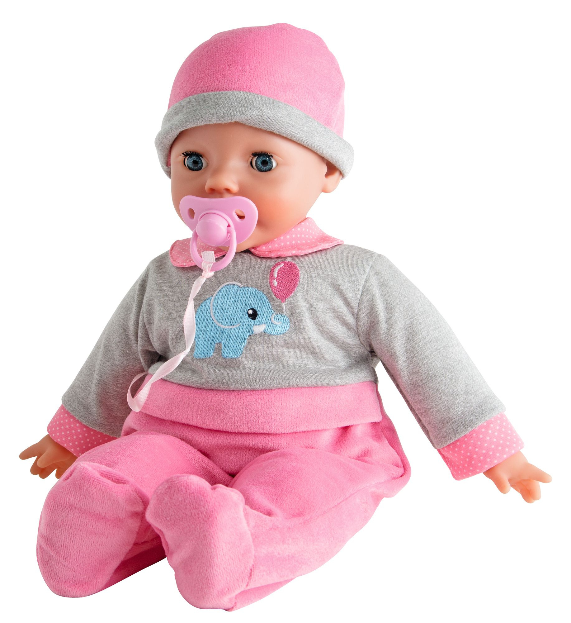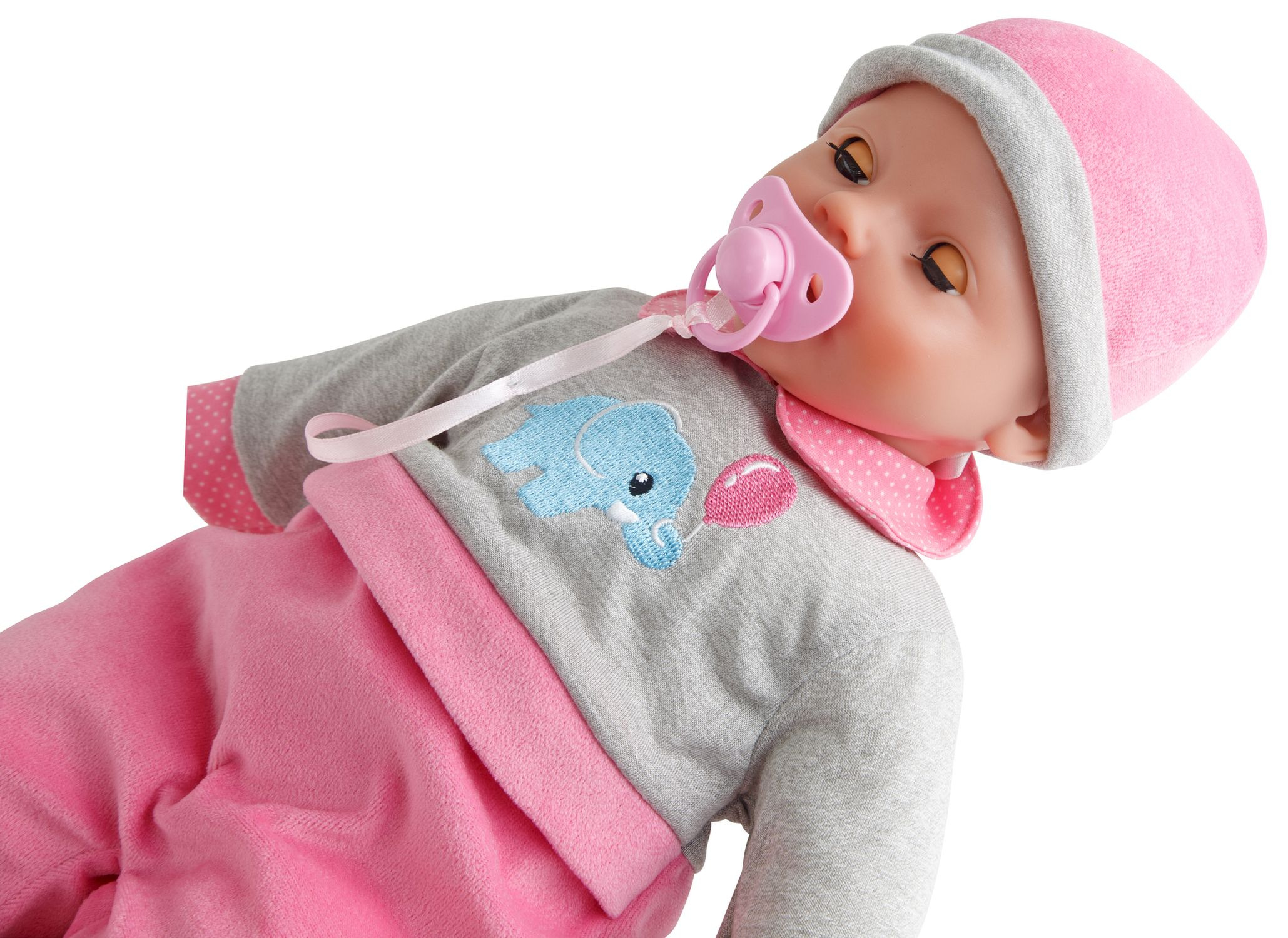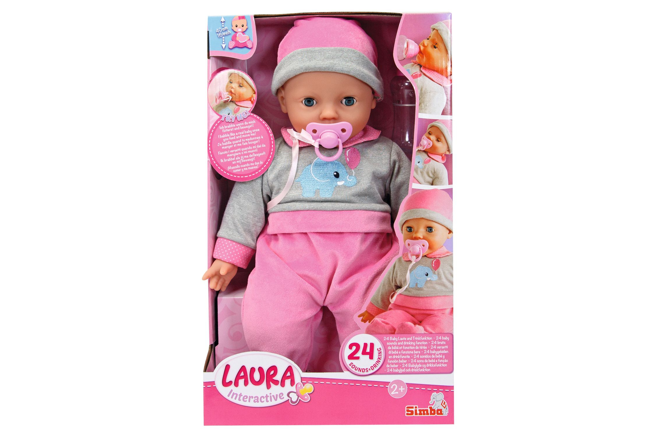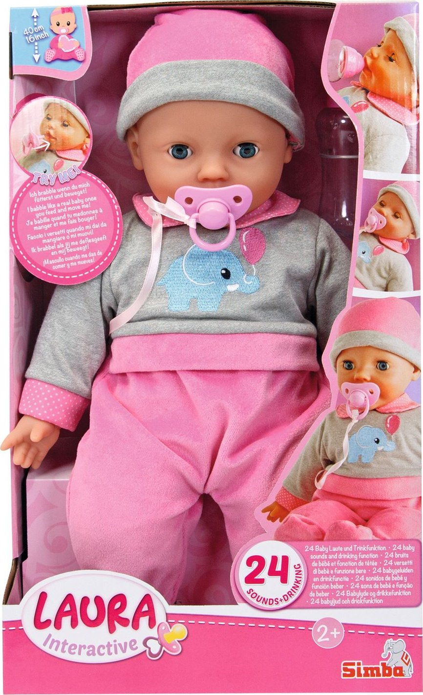 Panenka Laura má měkké tělíčko, zavírací očíčka, pije z lahvičky a vydádá 24 dětských zvuků. Lahvička a dudlík součástí. Velikost panenky 40 cm.