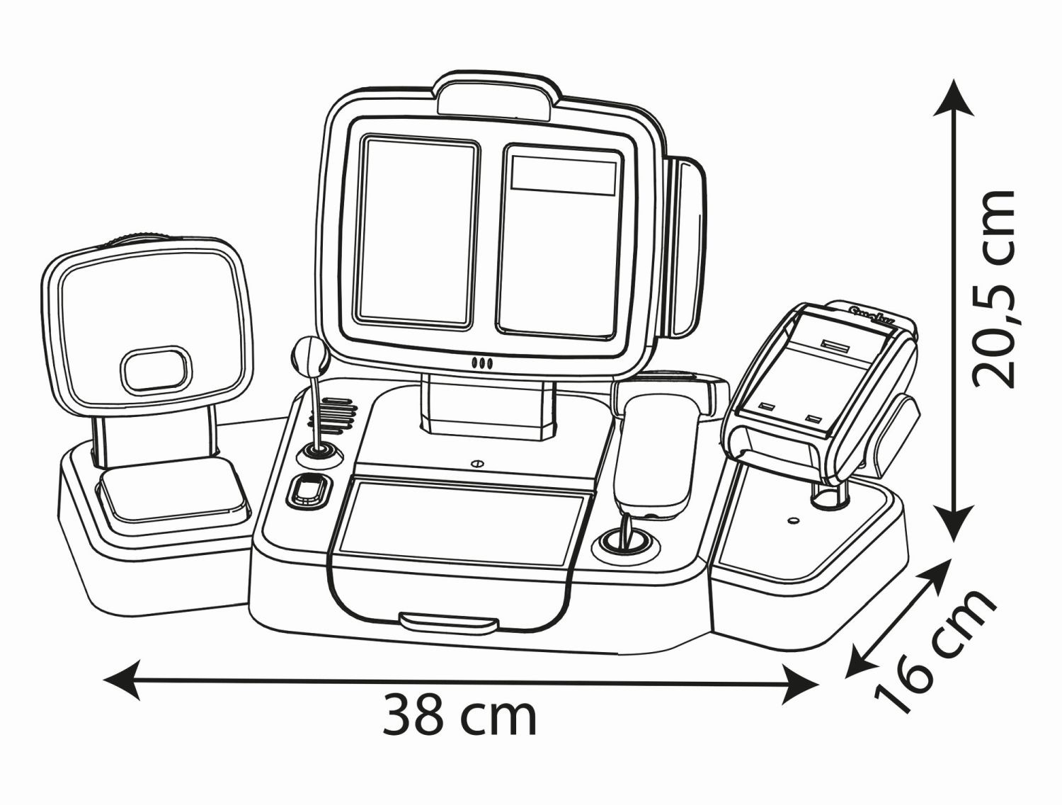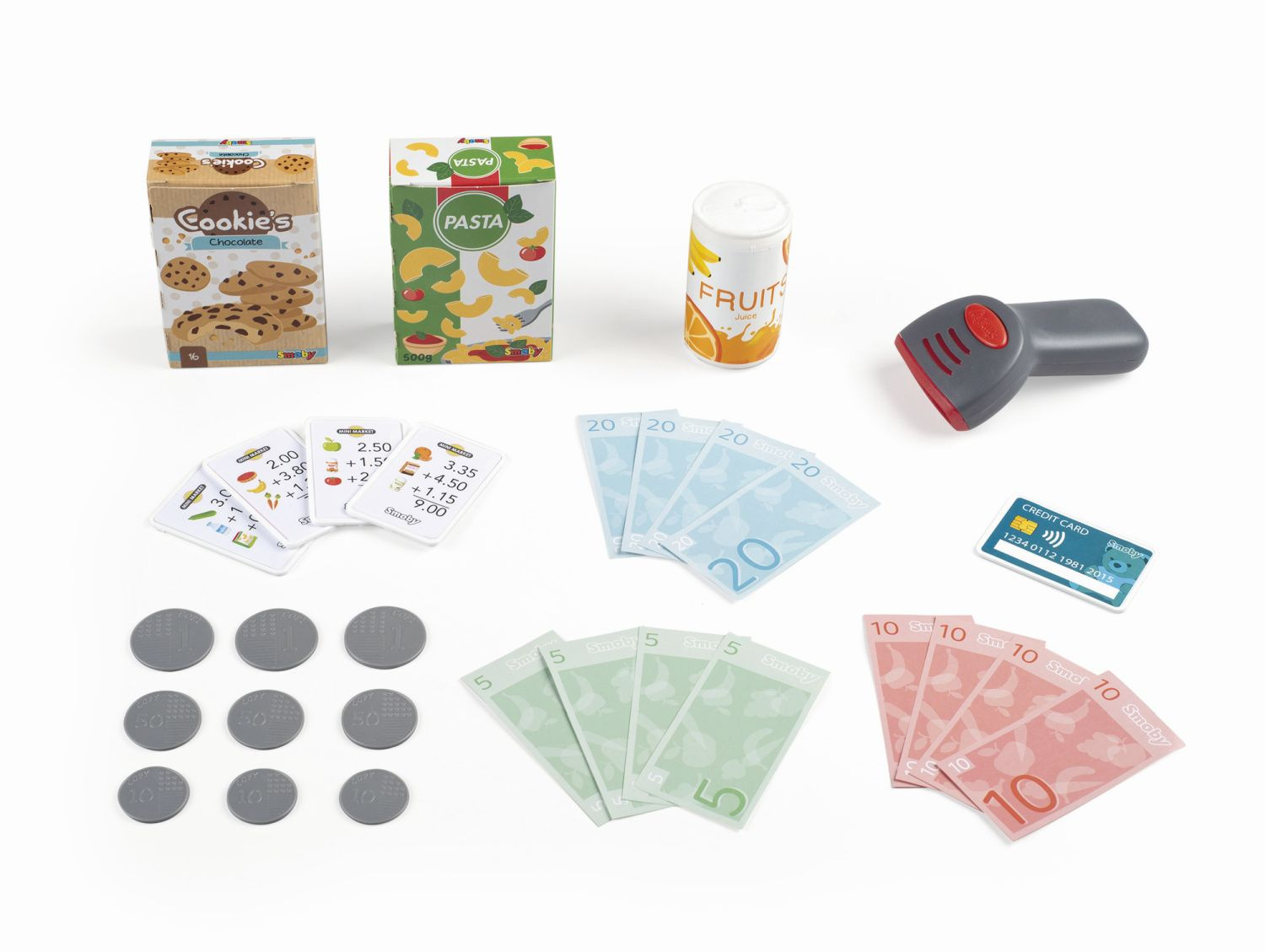 Elektronische Registrierkasse mit echter Rechnerfunktion, Scanner mit Licht- und Soundfunktion, Kreditkartenleser mit Kassenbon, mechanische Waage, Lebensmittelmodelle, Mikrofon und mehr. Abmessungen: 39 x 21,5 x 16 cm.