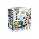 Maxi market s pokladnou, nová mechanická váha (zobrazená hmotnost se upravuje podle vážených potravin), hodiny a panel otevřeno/zavřeno. Bohaté příslušenství, např.makety krabiček (cereálie, těstoviny, sušenky, mléko), 2 plechovky, 2 jogurty, 6 ovoce a zeleniny, 2 makronky, 2 koláče, 1 chléb, 1 elektronický snímač čárových kódů se zvukem a světlem, 4 účtenky, 1 kreditní karta, 9 mincí a 12 bankovek. Celkem obsahuje 50 ks příslušenství. Rozměry: 80x60x90 cm. Nákupní vozík součástí. Vyrobeno ve Francii.