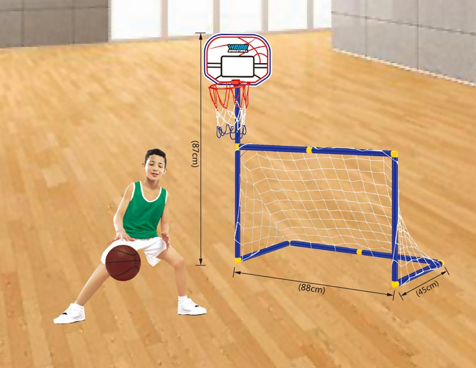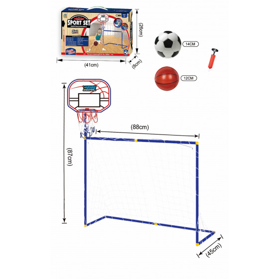 Fotbal nebo basketbal? Sada, která obsahuje náčiní pro obě hry. Vyber si, co si chceš zahrát. Rozměr branky 55x88xx45 cm, výška koše 87 cm, průměr míče na fotbal 14 cm a průměr míče na basketbal 12 cm. V sadě je pumpička na nafouknutí míčků.