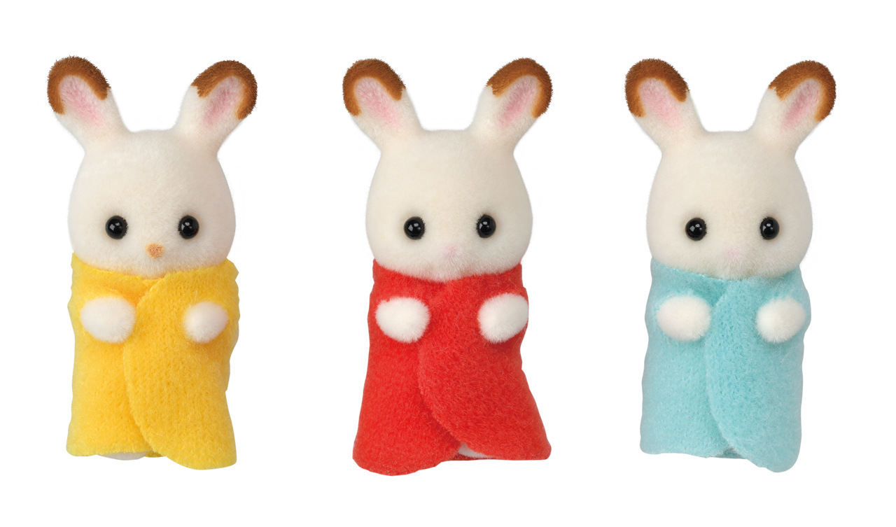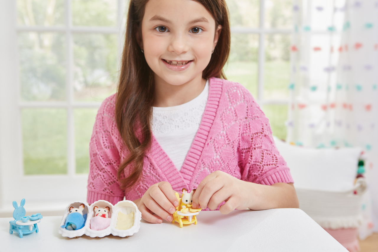 Sada malých roztomilých Chocolate králíčků. Trojčátka Flora, Fauna a Philip Chocolate jsou nejnovějšími přírůstky v rodině Chocolate králíků. Miminka můžete položit do kolébky a přikrýt dekou nebo posadit do dětských jídelních židliček a nakrmit je. Trojčátka mají milující rodiče, prarodiče, bratry a sestry, kteří se o ně starají a hrají s nimi (figurky nejsou součástí balení). Figurky jsou vyrobeny z plastu, který je potažený jemňounkým sametem. Očička jsou z černých korálků. Všechny končetiny jsou pohyblivé a hlavička otáčecí. Oblečení je vyrobeno tak, aby se dalo opakovaně svlékat a oblékat. Užijte si více zábavy s dalšími figurkami a doplňky Sylvanian Families (prodává se samostatně). Herní sady a figurky Sylvanian Families jsou nadčasové a vysoce kvalitní hračky. Hra podněcuje představivost dítěte. Sada obsahuje: 3x figurka miminek, 3x oblečení, 3x jídelní židlička, 3x talíř, 3x hrneček, 3x lžička, 3x deka, 3x kolébka. Věk: 3+. Video: https://www.youtube.com/watch?v=_2L_IHM_tPE