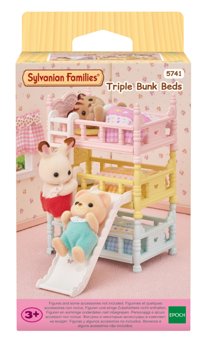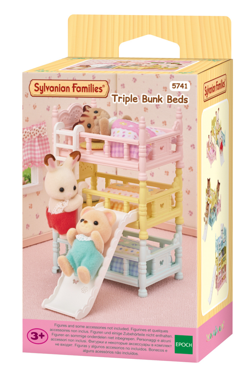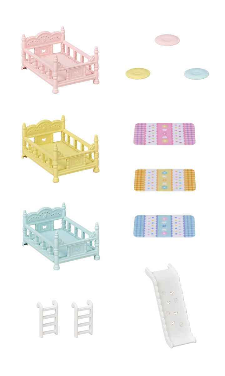 Trojlůžkový set Sylvanian Families skládá ze tří lůžek a povlečení, které si můžete sestavit několika různými způsoby podle svých potřeb. Sada obsahuje žebříky, které se budou hodit, pokud se rozhodnete postavit patrovou postel. Součástí balení je i skluzavka, po které mohou děti sjet dolů, místo aby slezly z vysoké postele po žebříku. Lůžka lze umístit na sebe, vedle sebe a v několika dalších uspořádáních. Skluzavku a 2 žebříky lze připevnit na konce nebo strany postelí. Sada obsahuje 3 polštáře a 3 přikrývky v příjemných pastelových barvách. Originální doplňky a nábytek hodí do všech chat Sylvanian Families.Kombinujte s dalším příslušenstvím a nábytkem pro ještě více zábavy(sady prodávají samostatně).