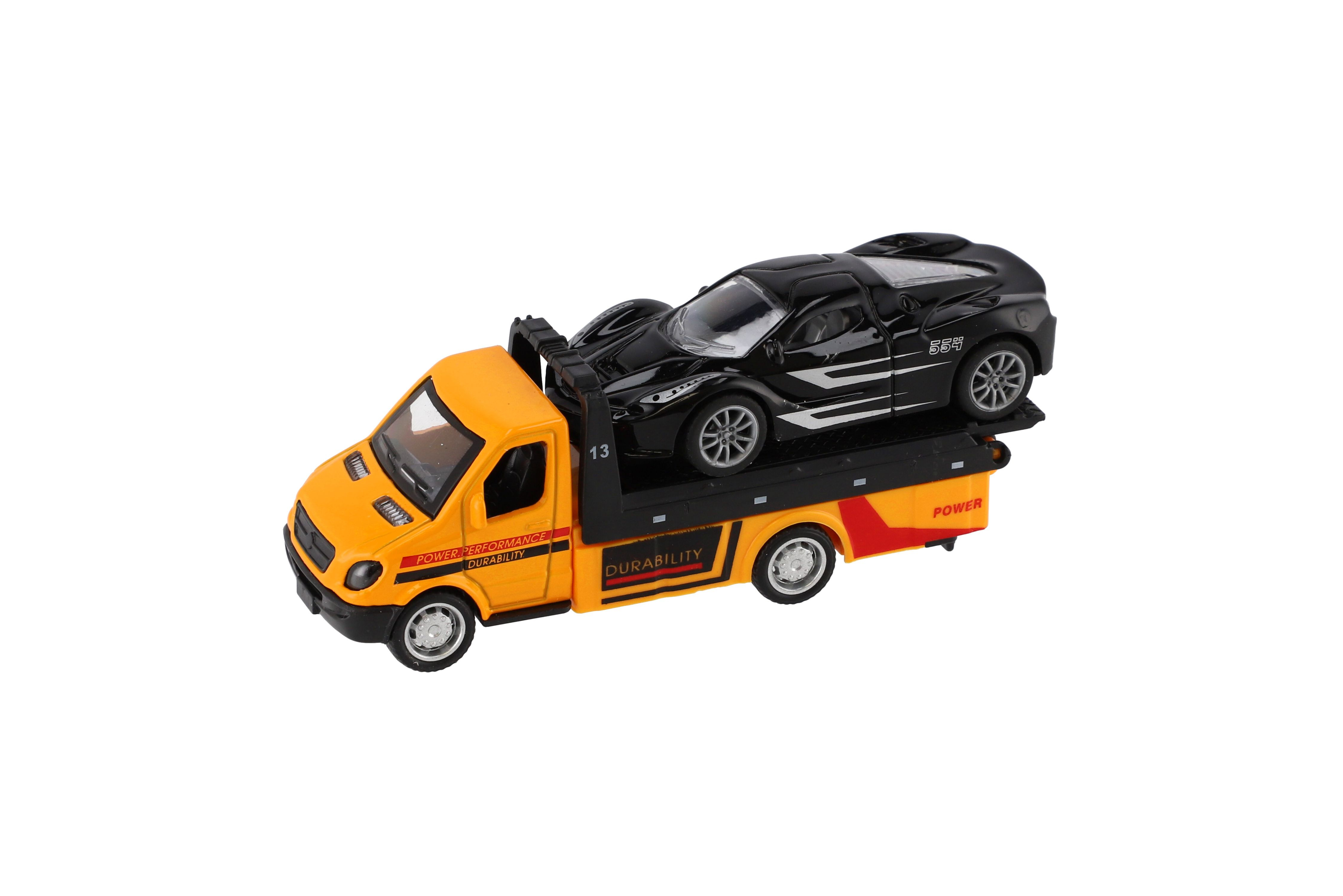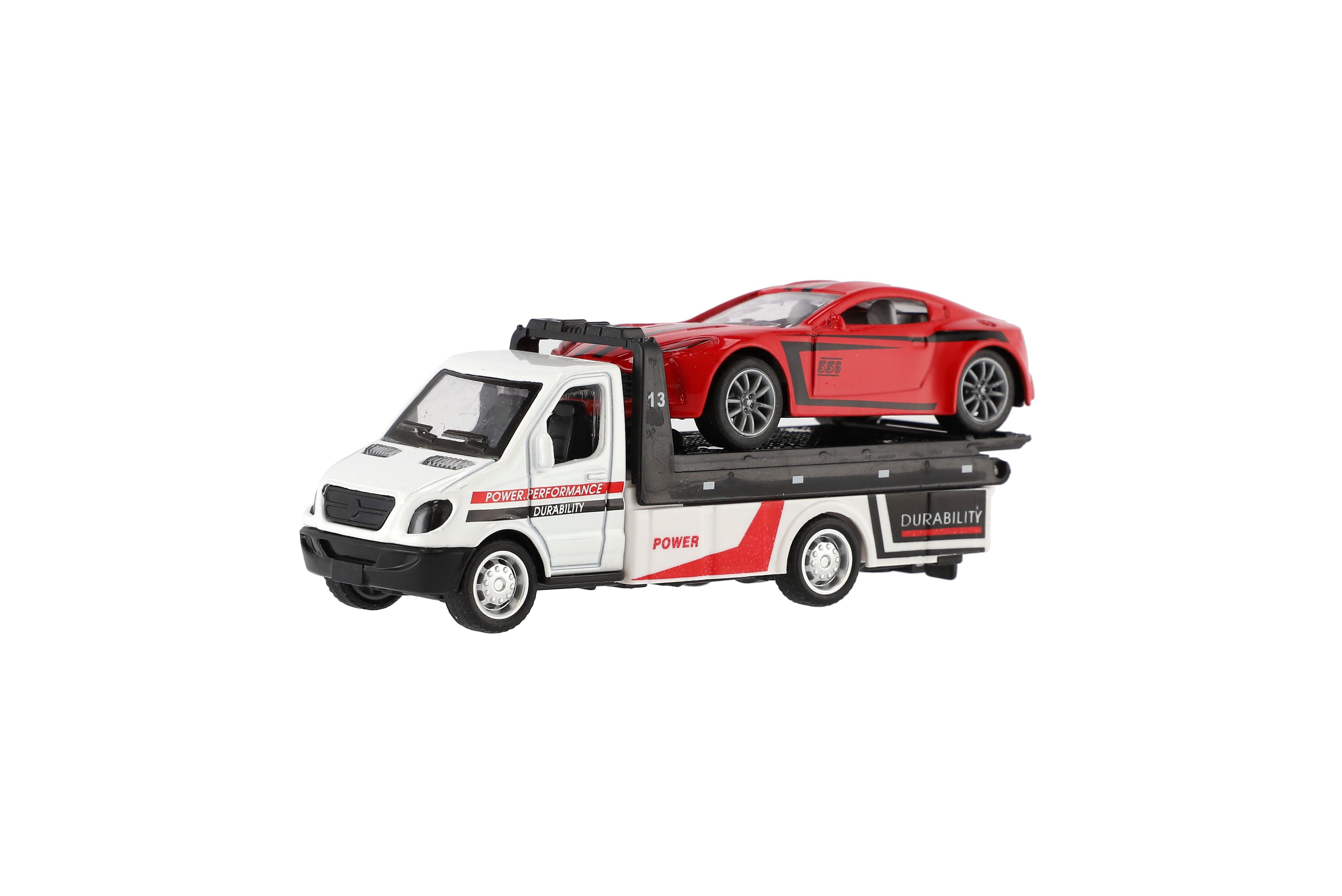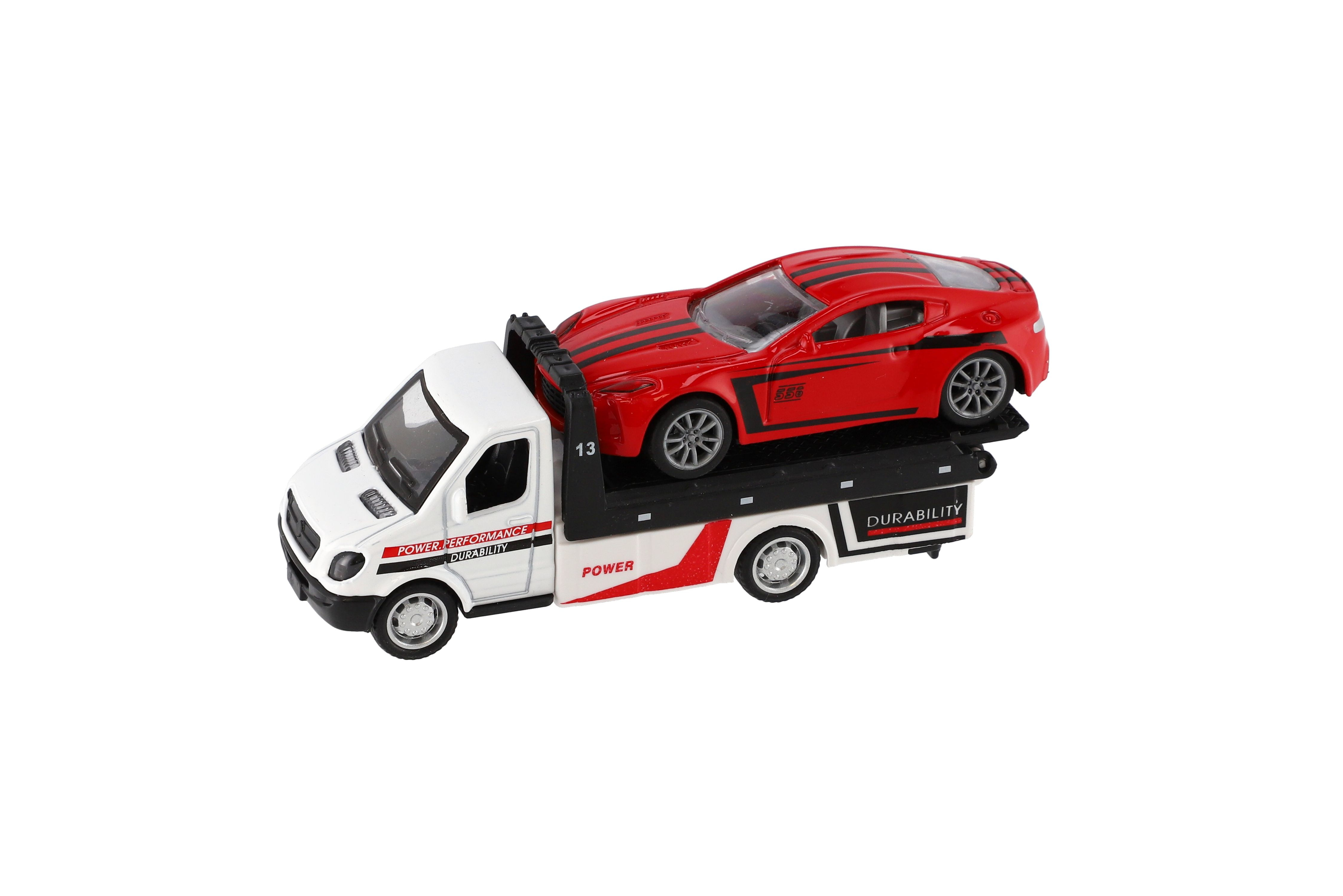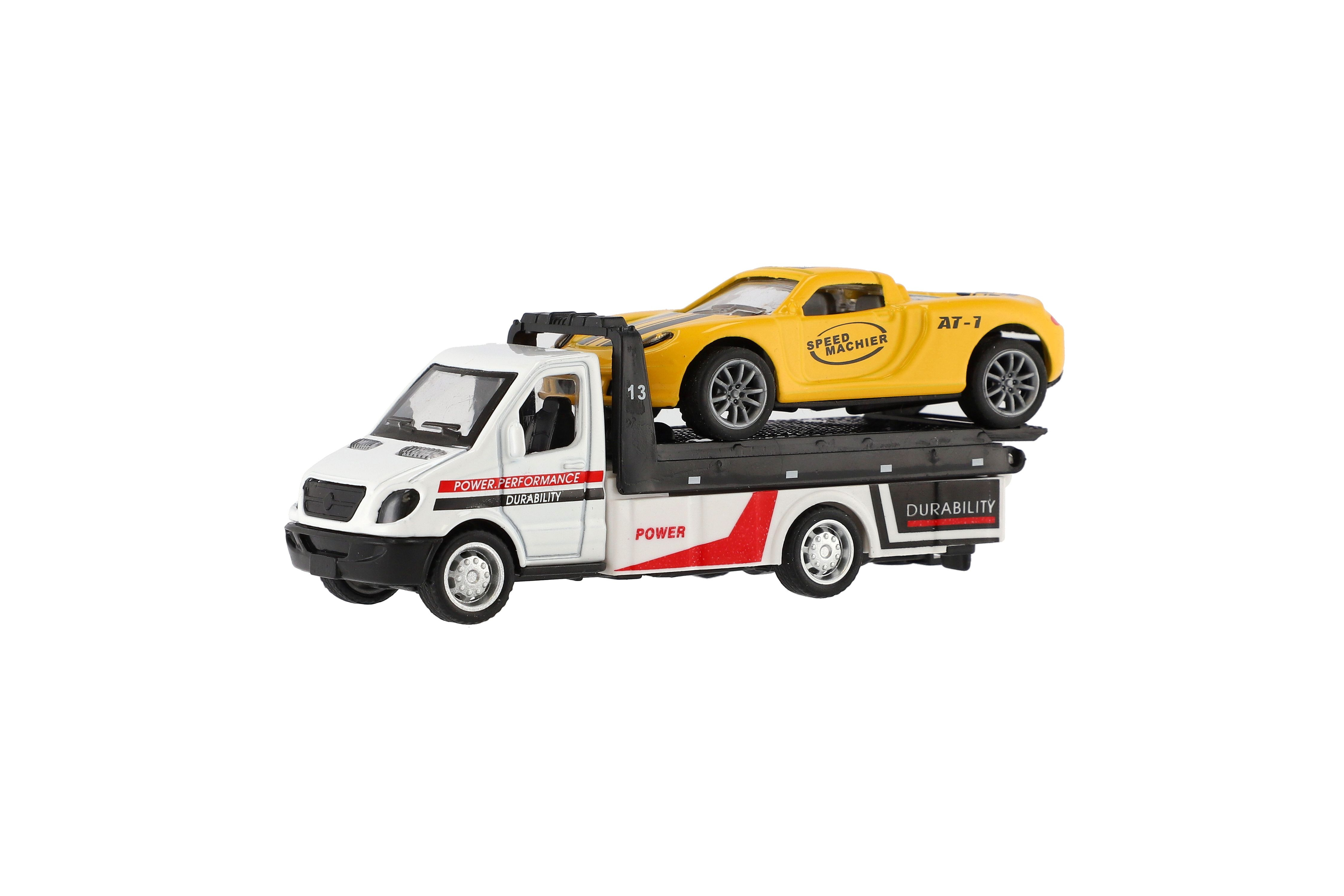 Ein Abschleppwagen mit Spielzeugauto ergänzt jeden Fuhrpark. Das Auto ist im Rückstoß. Abschleppwagengröße: 11 cm Kartongröße: 24 x 7,5 x 6 cm Geeignet für Kinder ab 3 Jahren