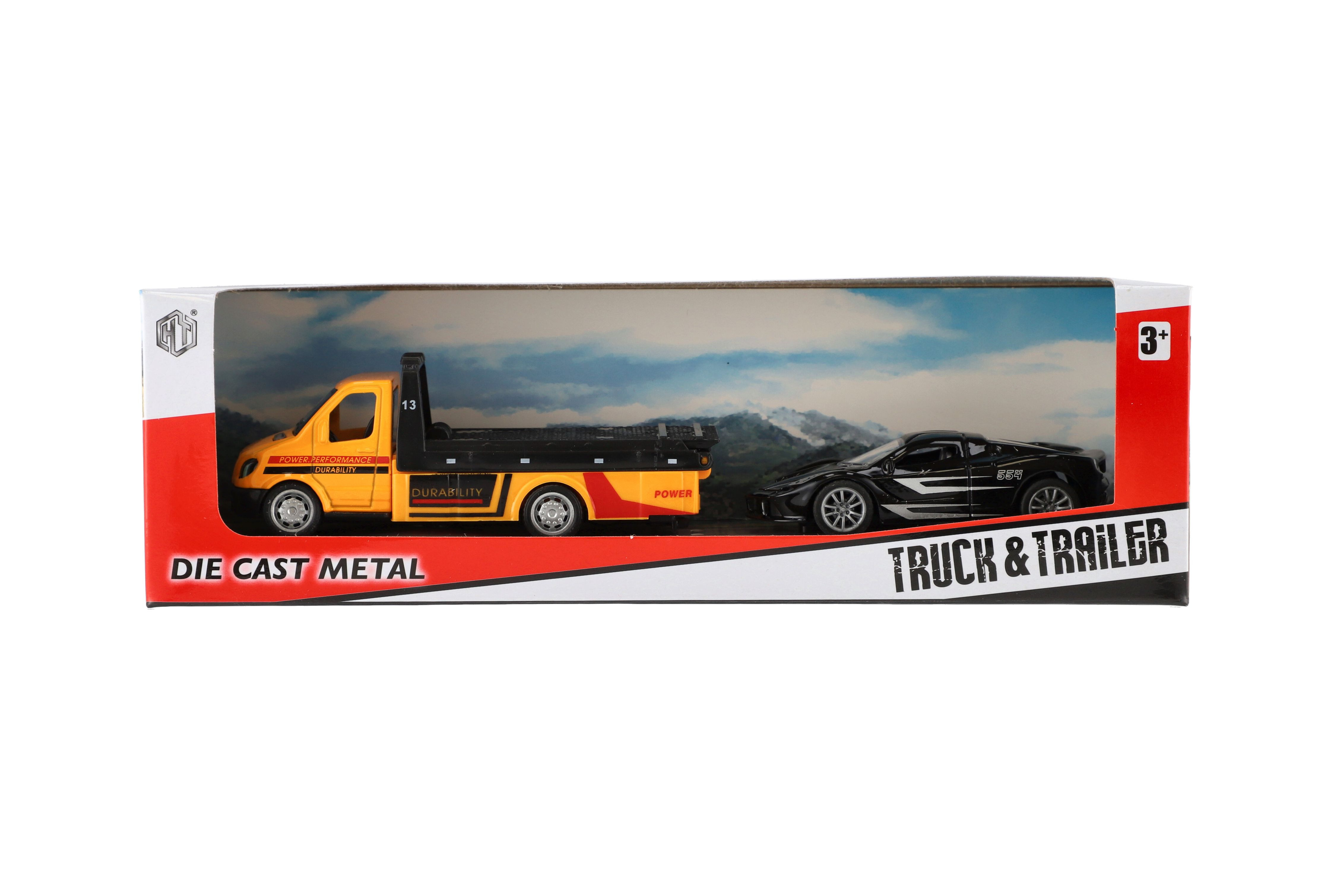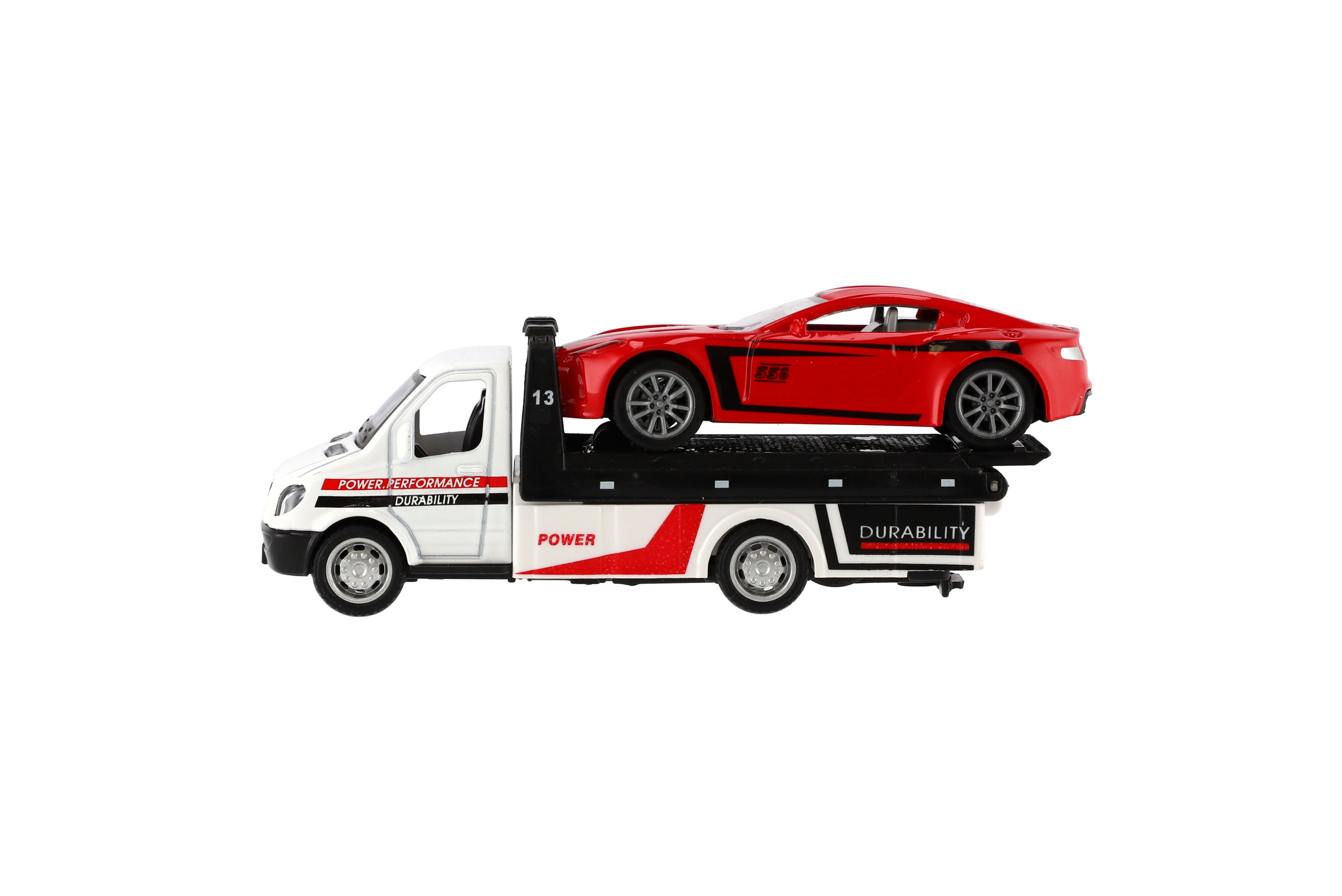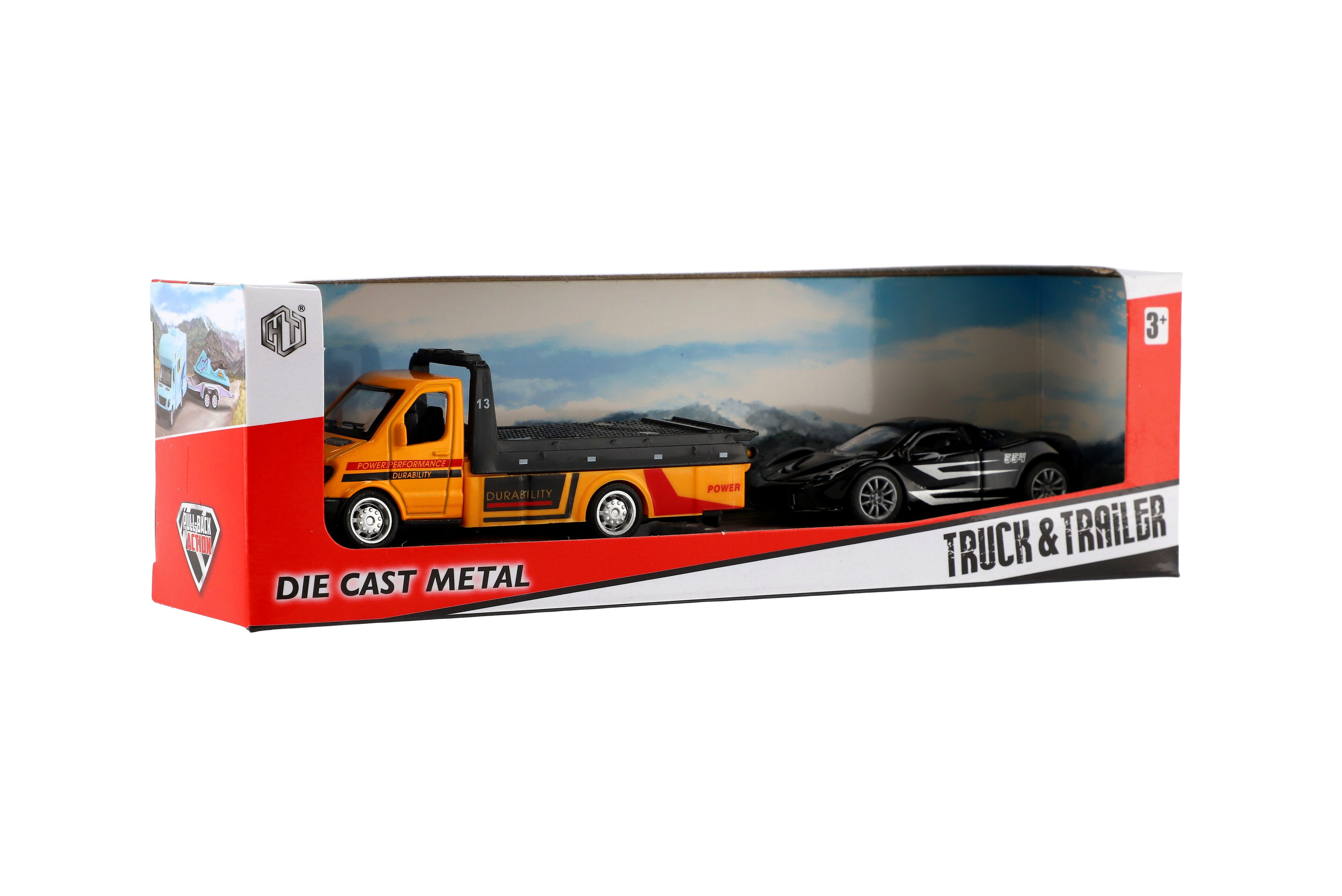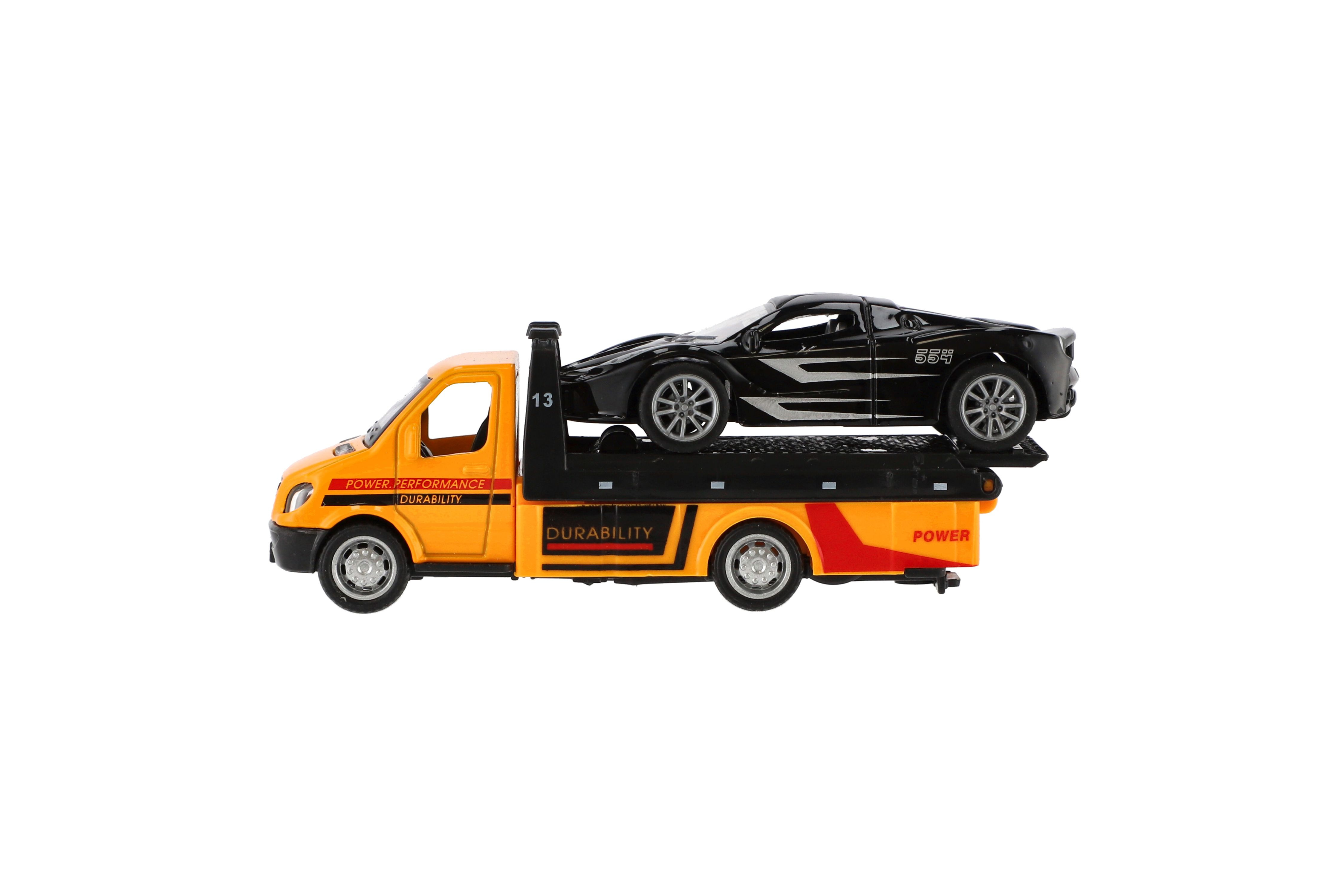 Ein Abschleppwagen mit Spielzeugauto ergänzt jeden Fuhrpark. Das Auto ist im Rückstoß. Abschleppwagengröße: 11 cm Kartongröße: 24 x 7,5 x 6 cm Geeignet für Kinder ab 3 Jahren