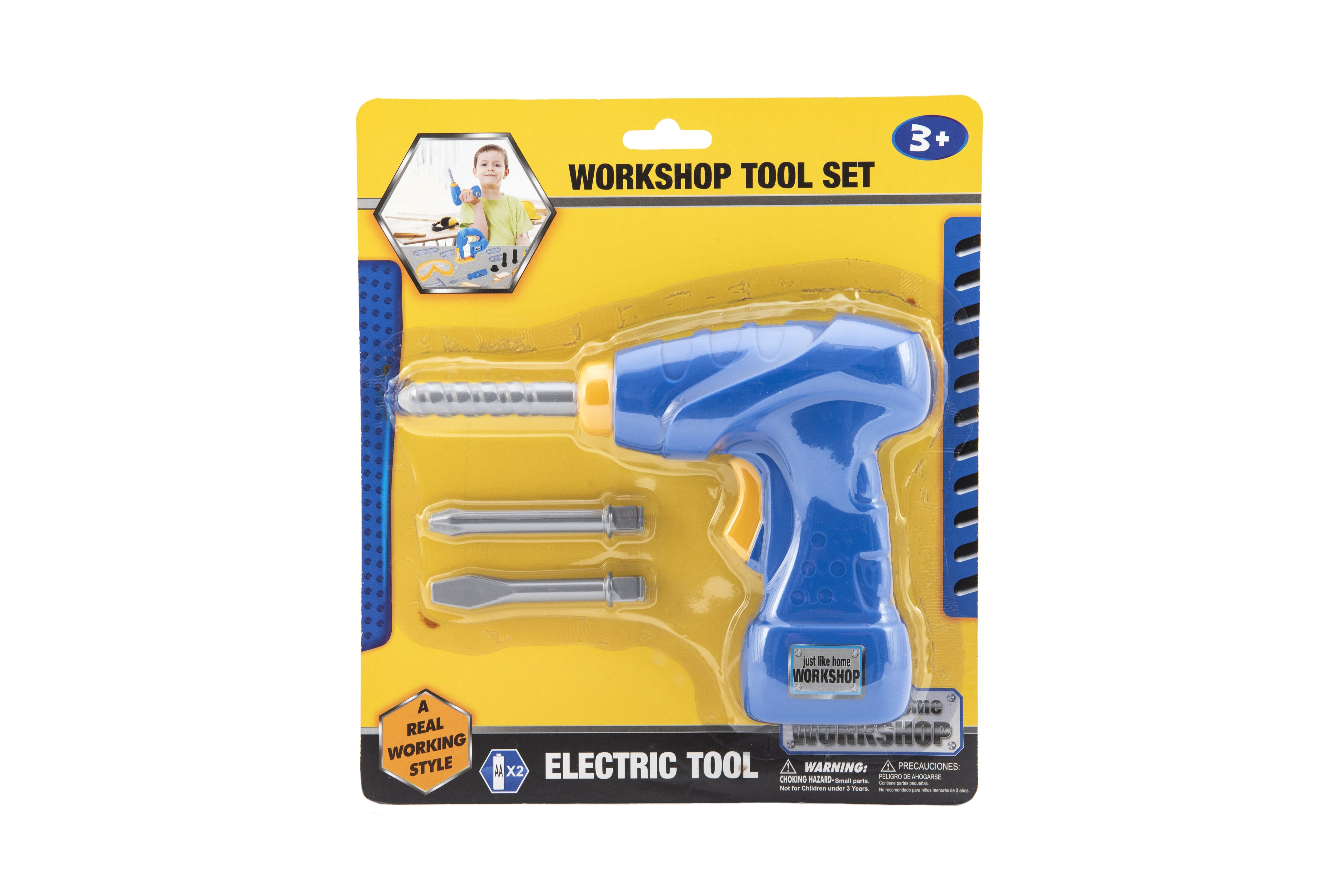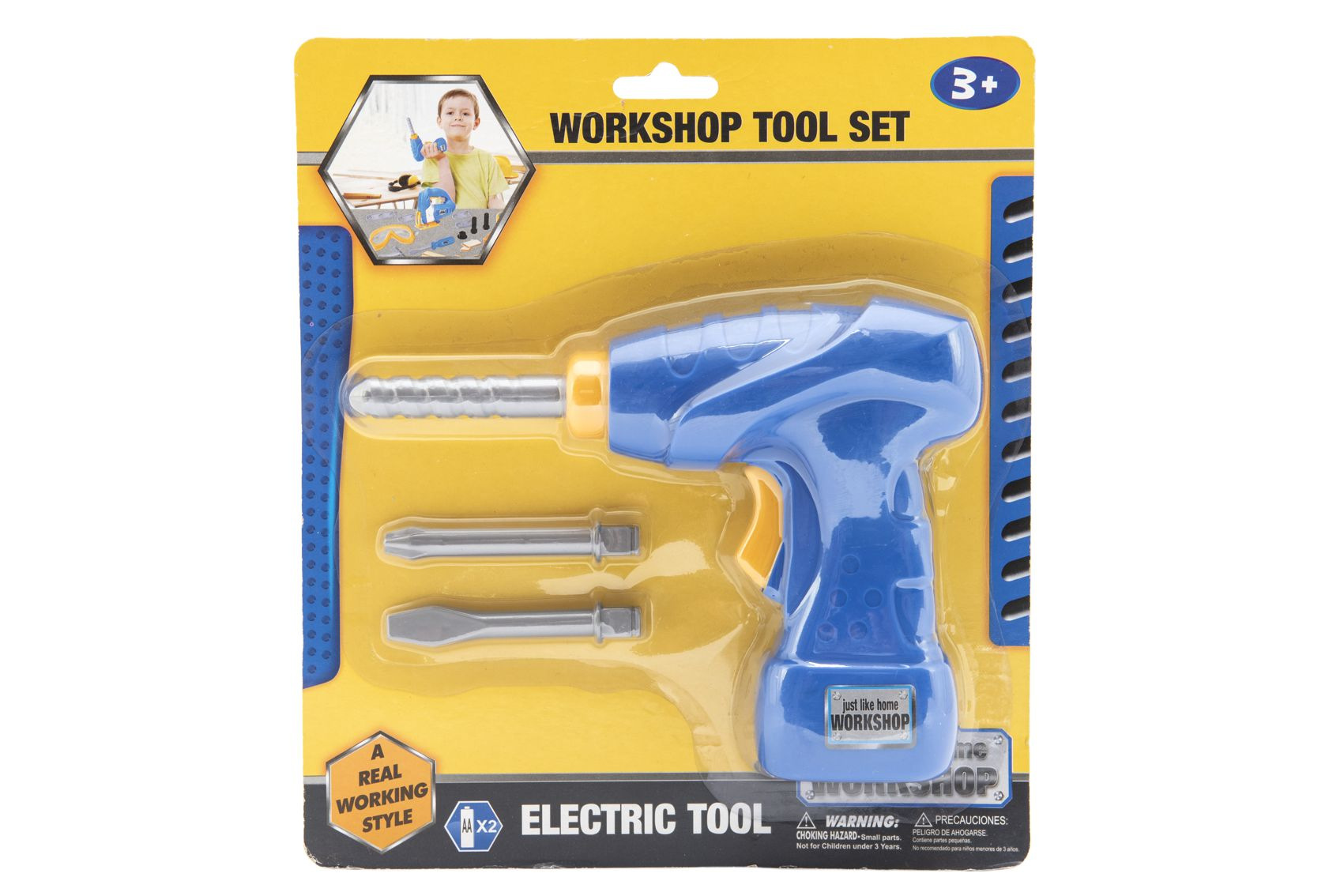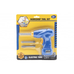 Teddies Akku-Bohrmaschine Werkzeug Kunststoff 18x14cm mit Zubehör batteriebetrieben mit Sound auf Karte 21x24cm