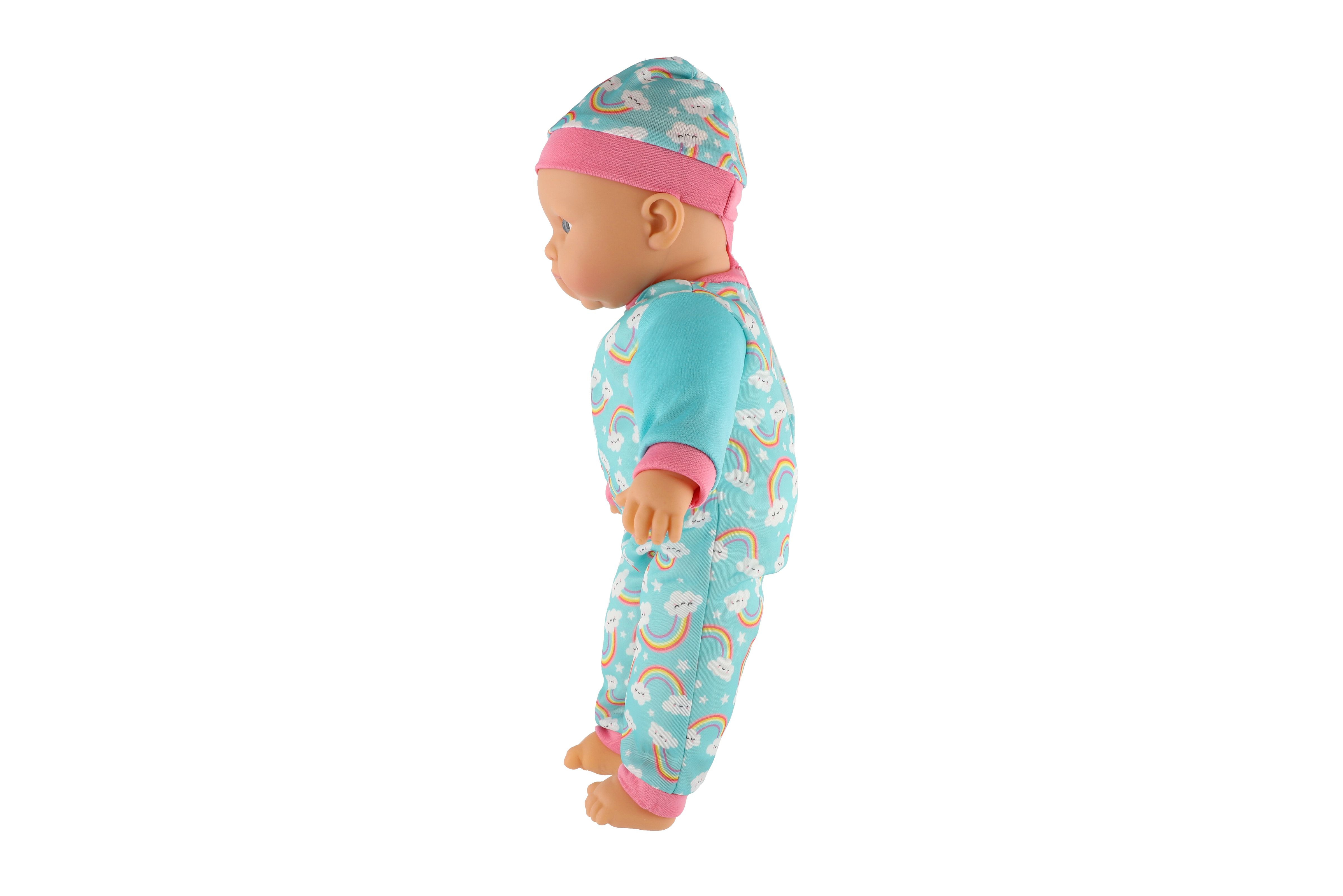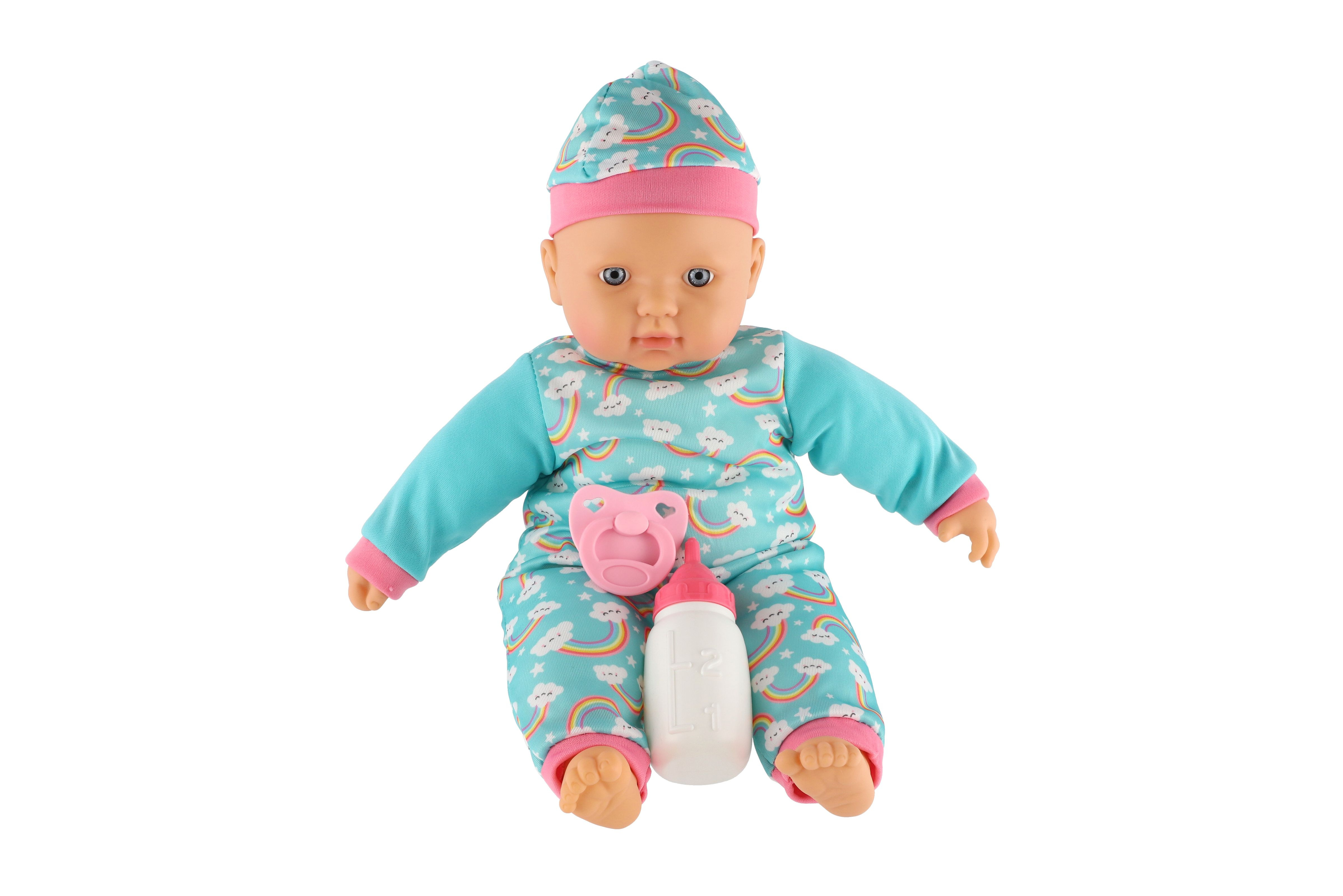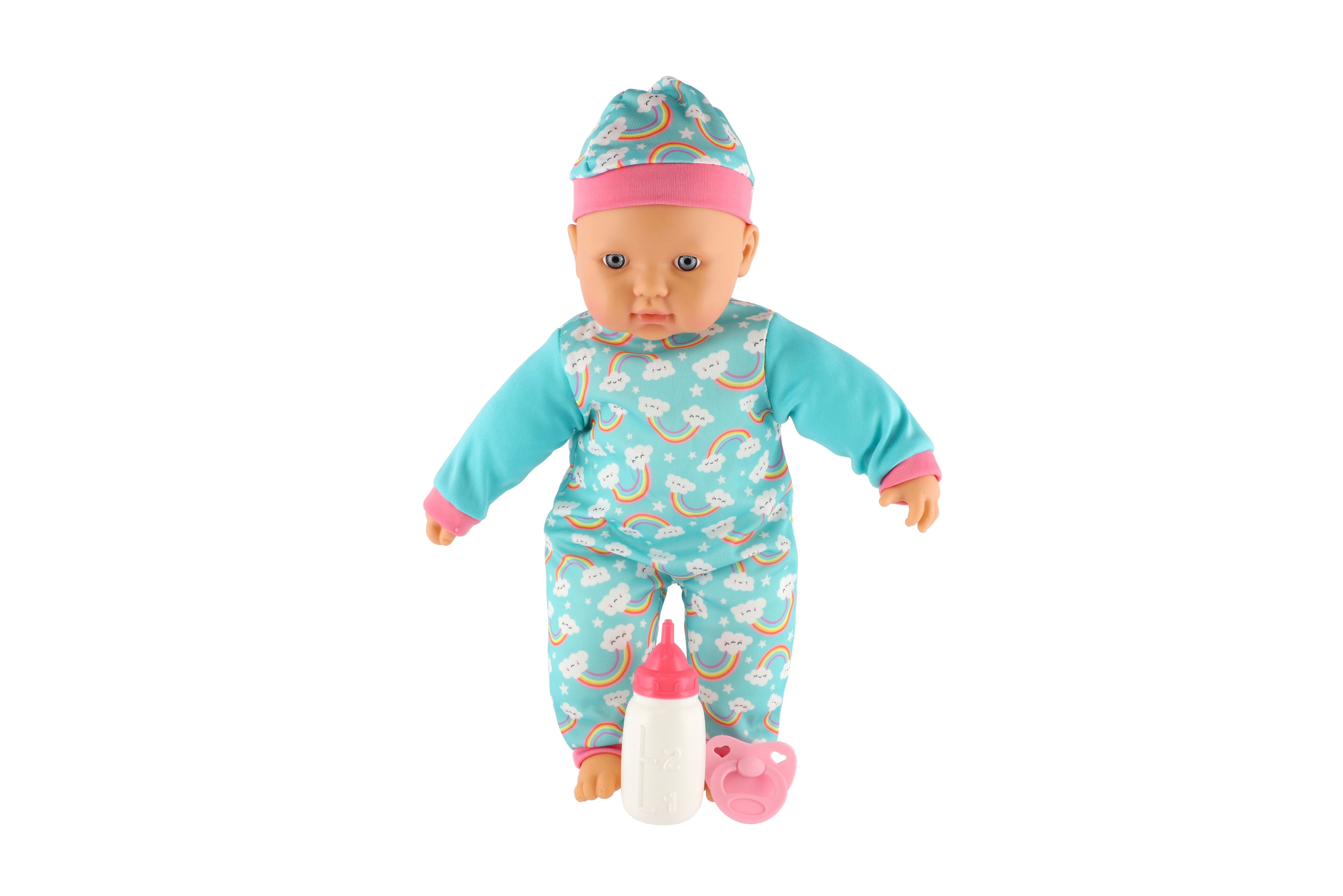 Eine süße Puppe mit weichem Körper in einem wunderschönen Regenbogen-Outfit. Dieses Baby wird sicherlich jedes kleine Mädchen glücklich machen und ein unverzichtbarer Teil ihres Lebens werden. Im Lieferumfang sind außerdem eine Flasche und ein Schnuller enthalten, die jede Mutter unbedingt für ihr Baby braucht. Puppengröße: 40 cm Verpackungsgröße: 41 x 19 x 12,5 cm