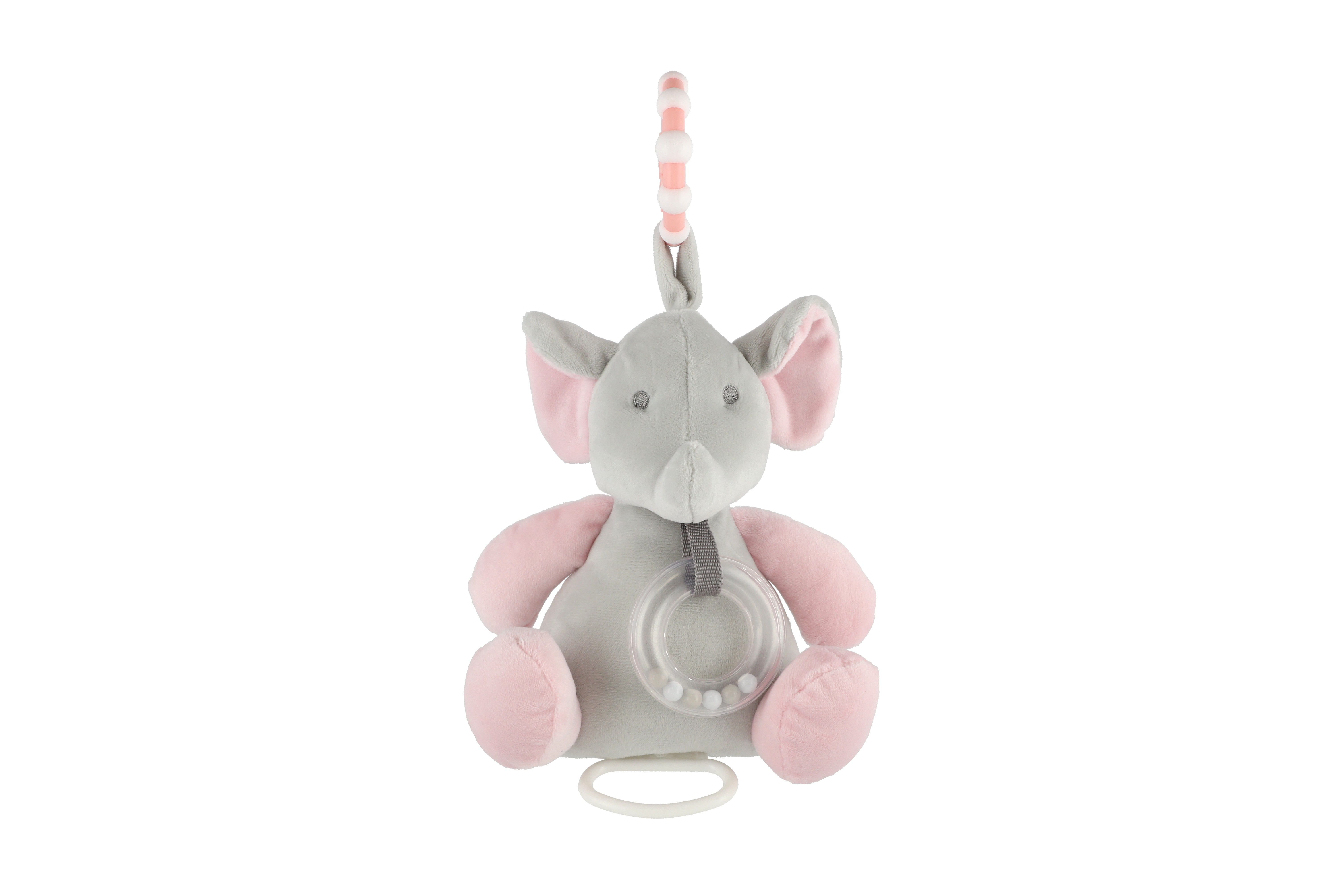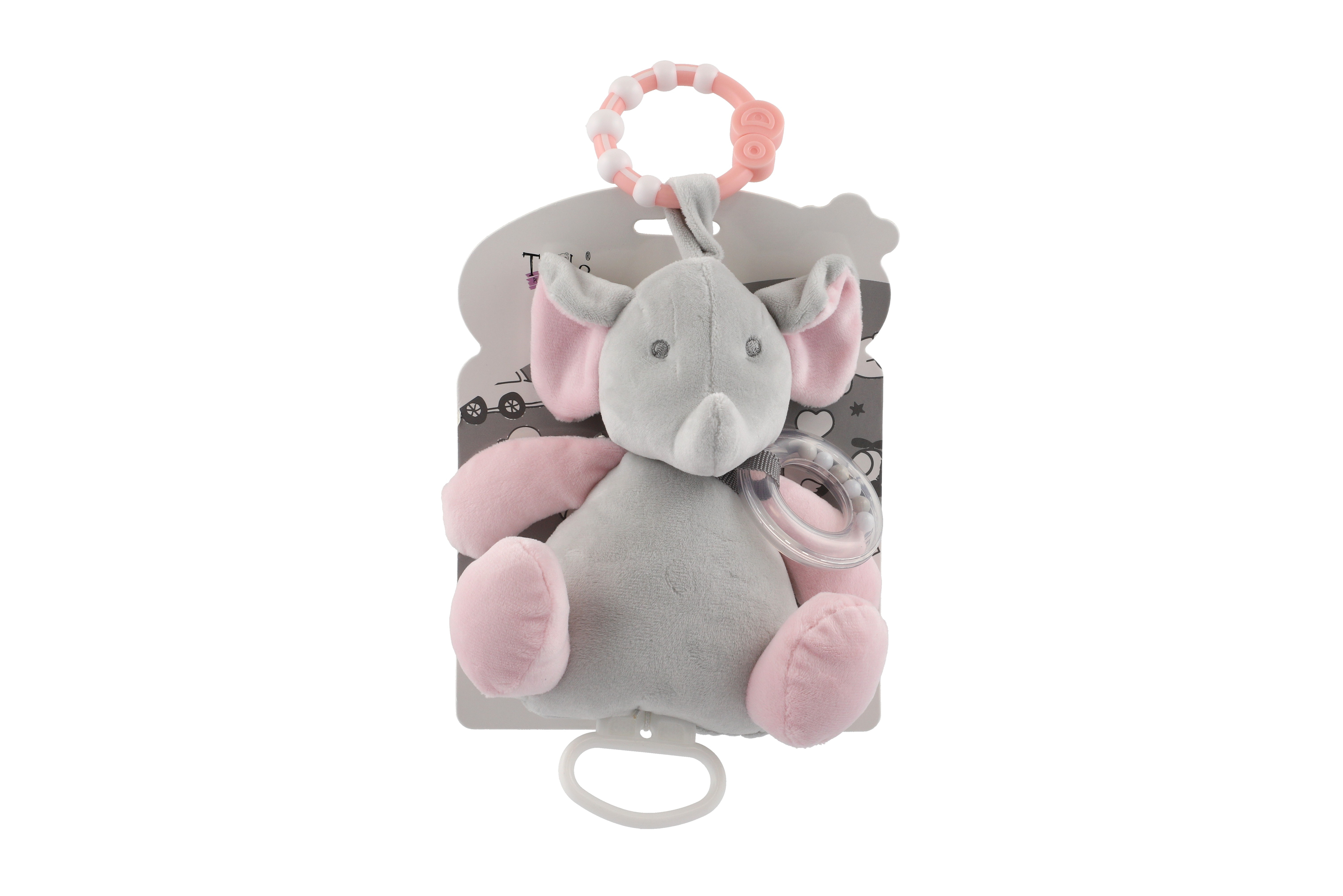 Teddies Elefant Aufzieh-Spieluhr Rassel Plüsch 16,5x21,5cm grau-rosa auf Karte im Beutel 0+
