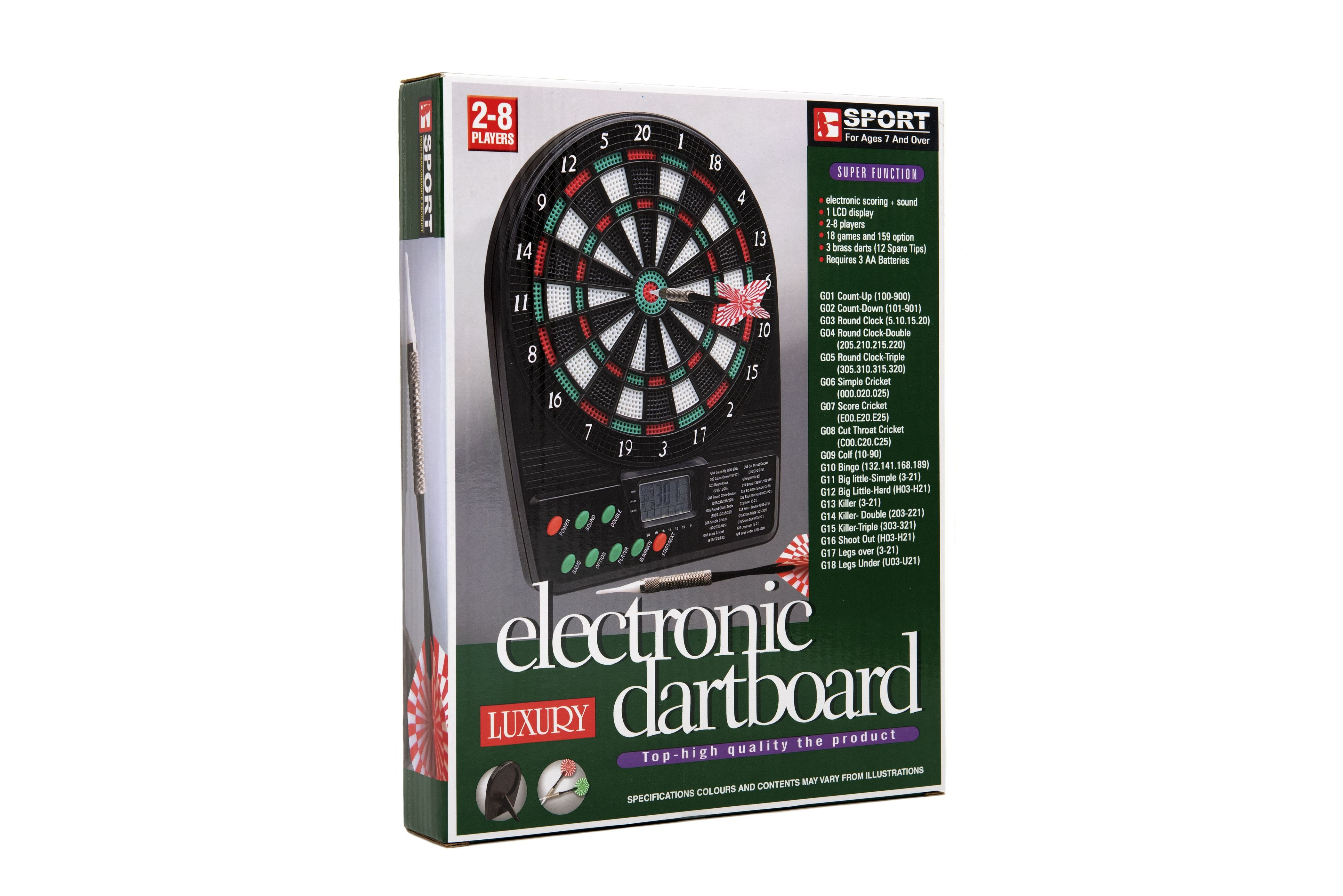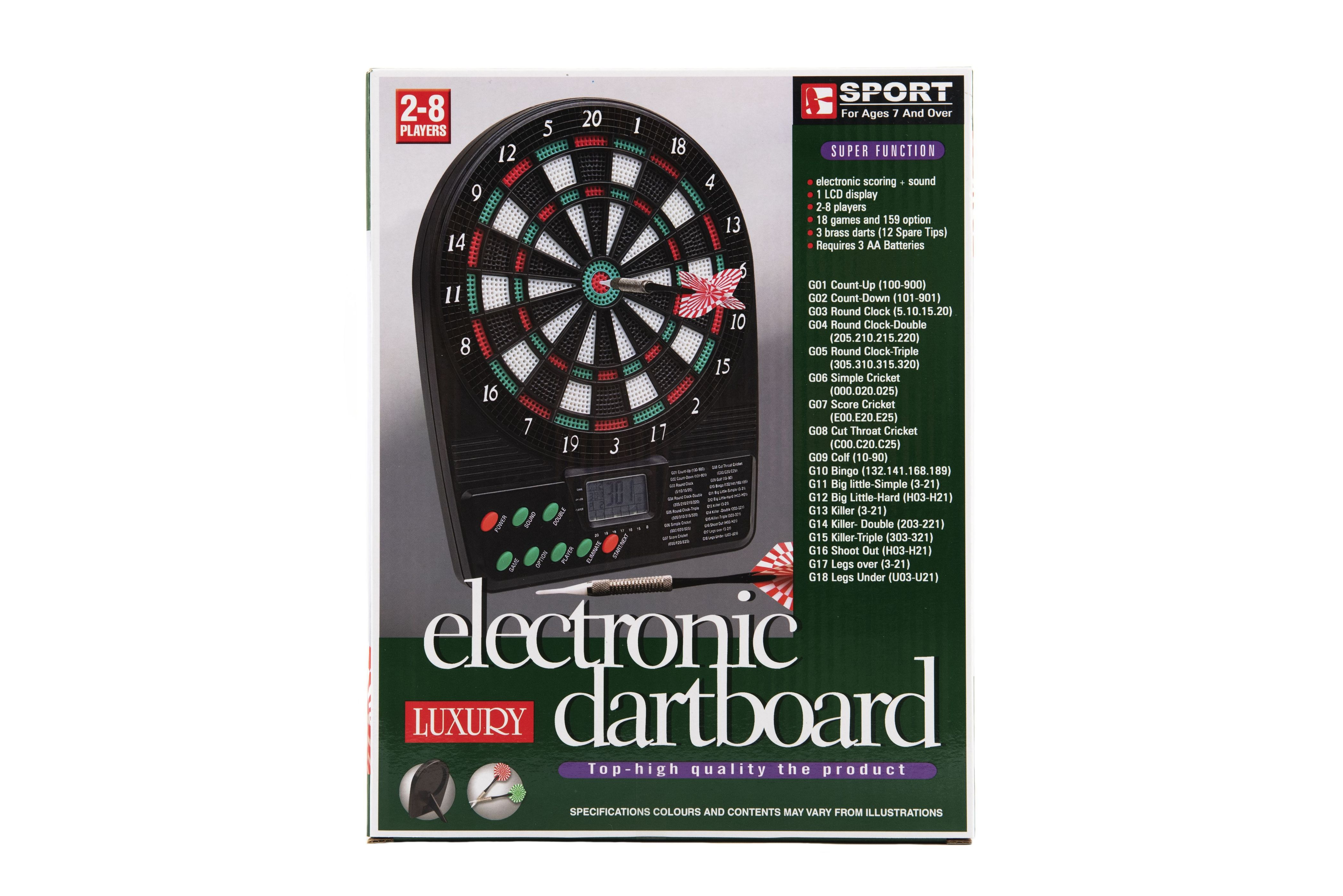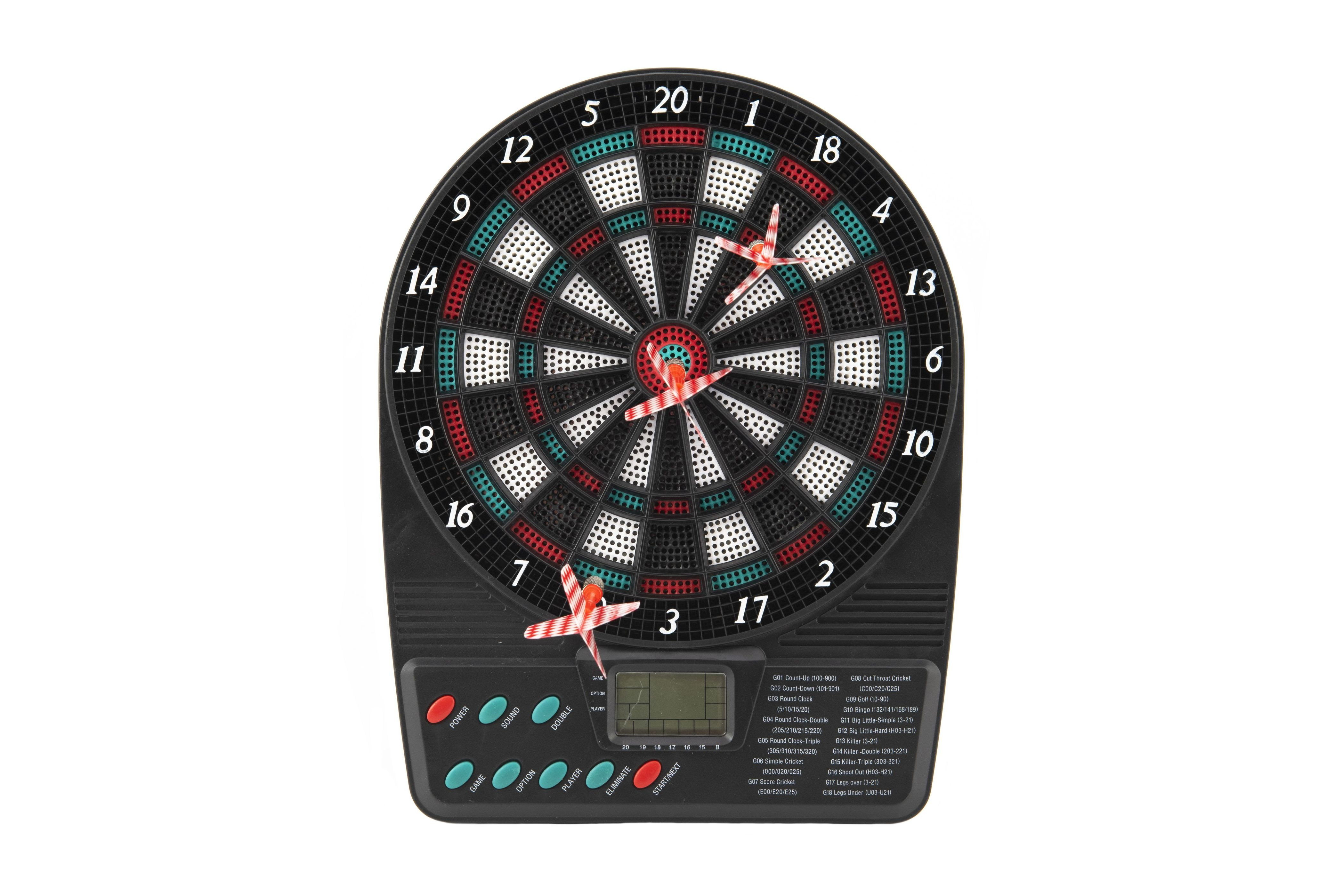 Das Dartschießen auf eine Zielscheibe ist für fast alle Jungen und viele Mädchen ein sehr beliebter Zeitvertreib. Dieses Set beinhaltet eine 20 x 26 cm große elektronische Dartscheibe mit 3 Darts und 12 Ersatzspitzen. Es enthält 18 Spiele mit mehreren Optionen und mehreren Levels. 3x AA-Batterien sind nicht im Lieferumfang enthalten. Verpackungsmaße 21 x 27 x 4 cm. Geeignet für Kinder ab 3 Jahren.