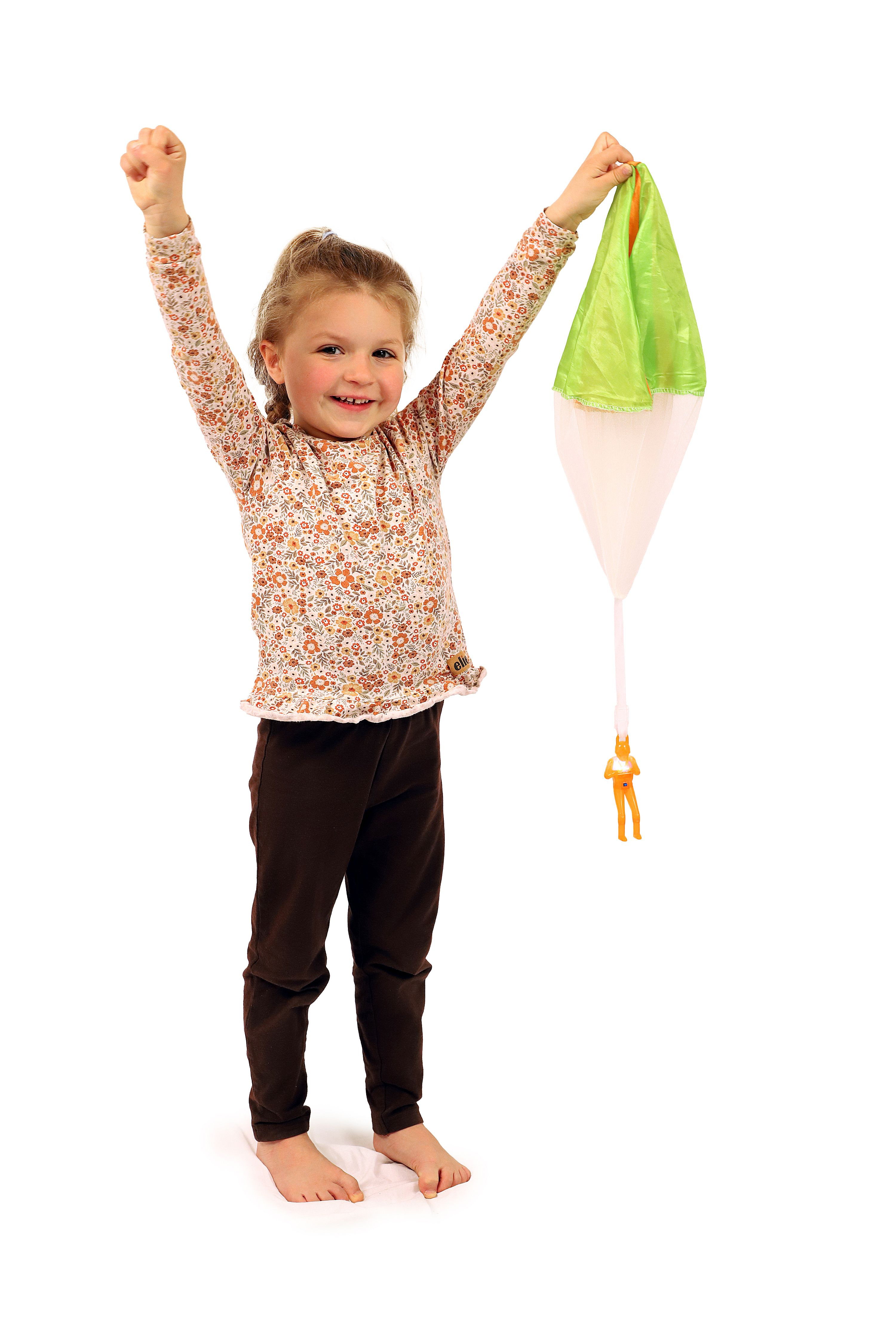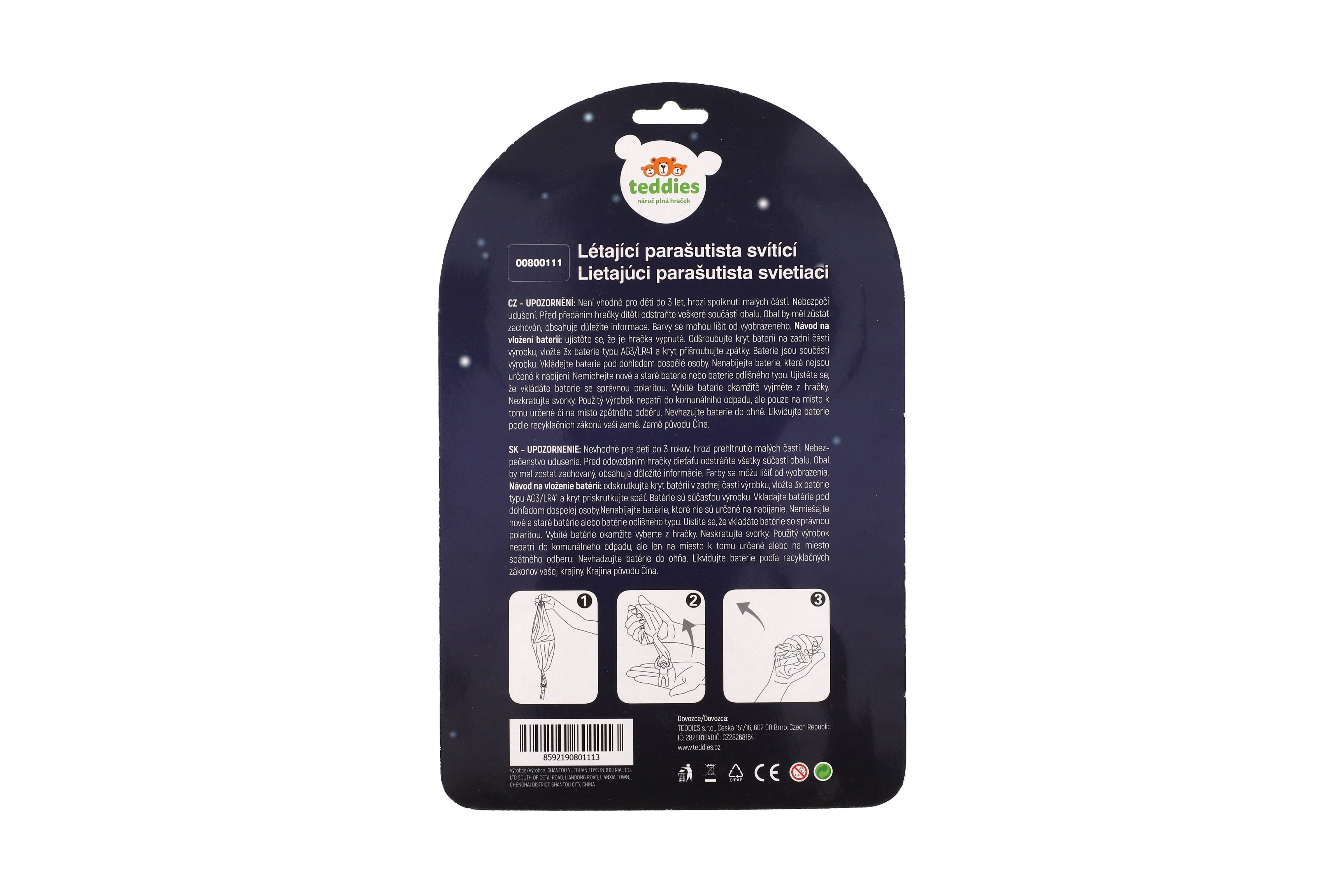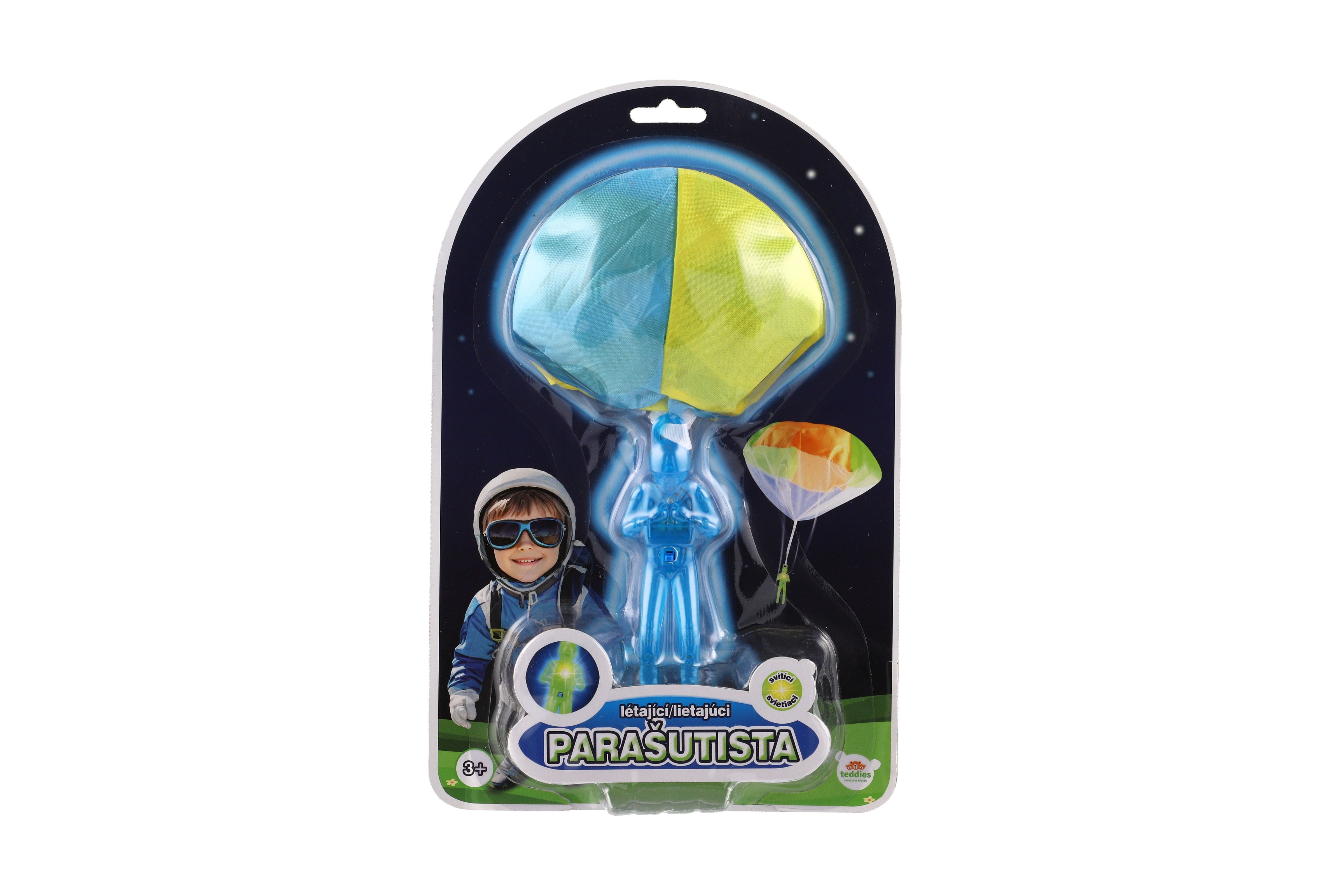 Plastová postavička svítícího parašutisty s padákem. Tato hračka jistě potěší každého malého dobrodruha. Hračka ideální na hrátky na zahradě. Běhej a vyhazuj parašutistu do největší výšky, překonávej délku jeho letu! Při pádu se padák nafoukne a zpomalí pád panáčka - jako opravdový parašutista! Baterie 3x AG3 jsou součástí výrobku. Rozměry balení 19 x 29 x 4 cm. Vhodné pro děti od 3 let.
