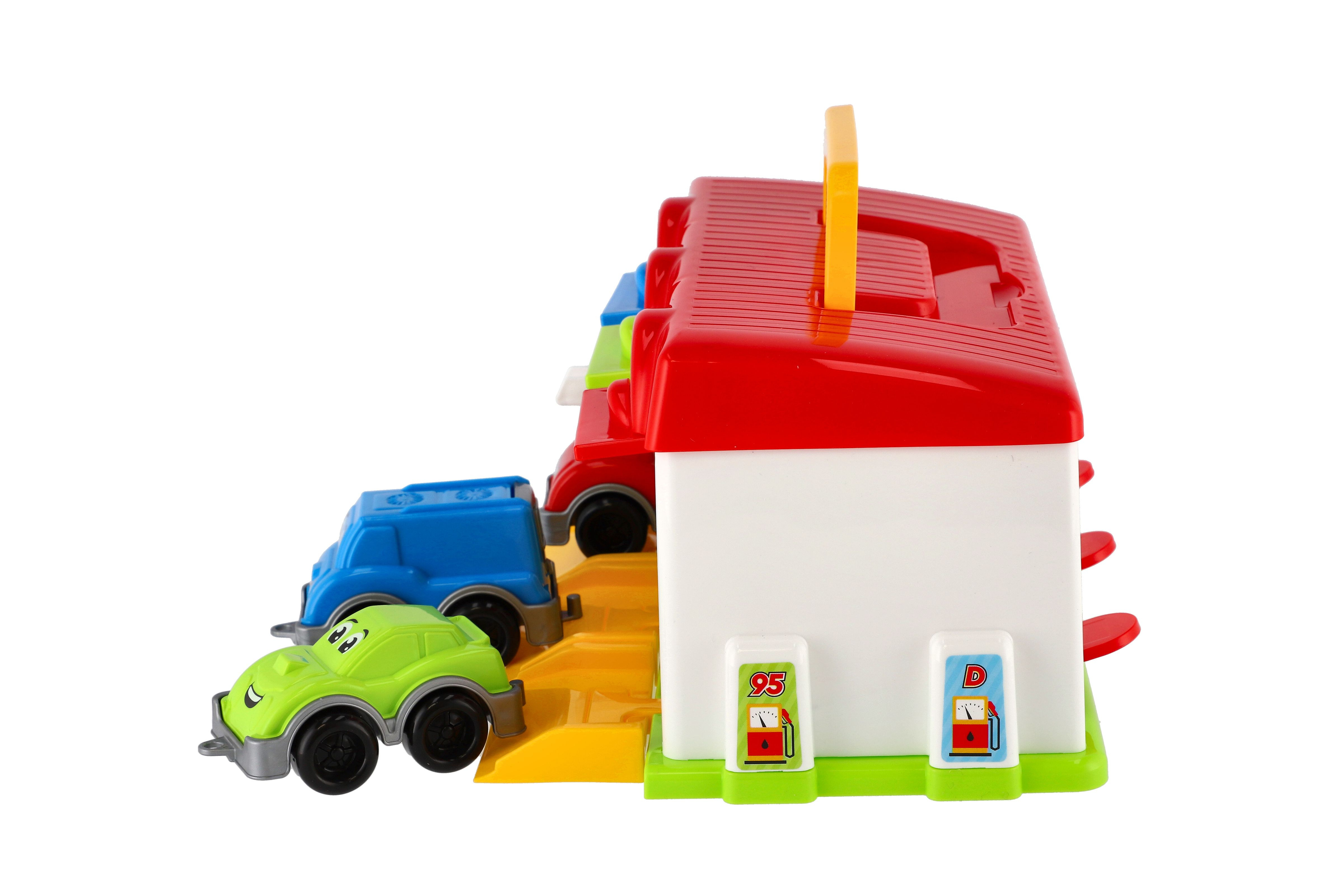 Beschreibung Teddies Garage mit 3 Autos + Zubehör aus Kunststoff in der Box 27x14x15cm