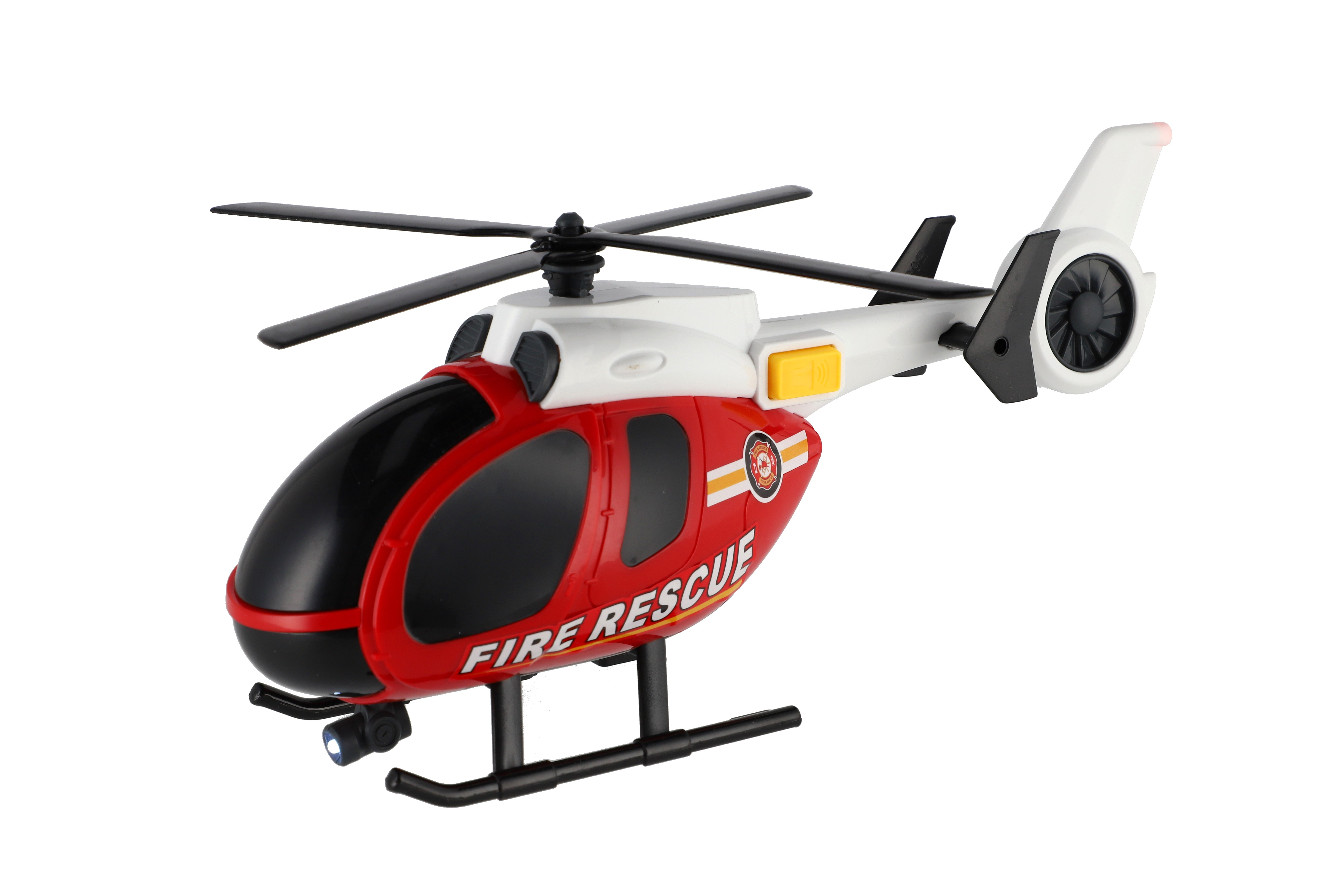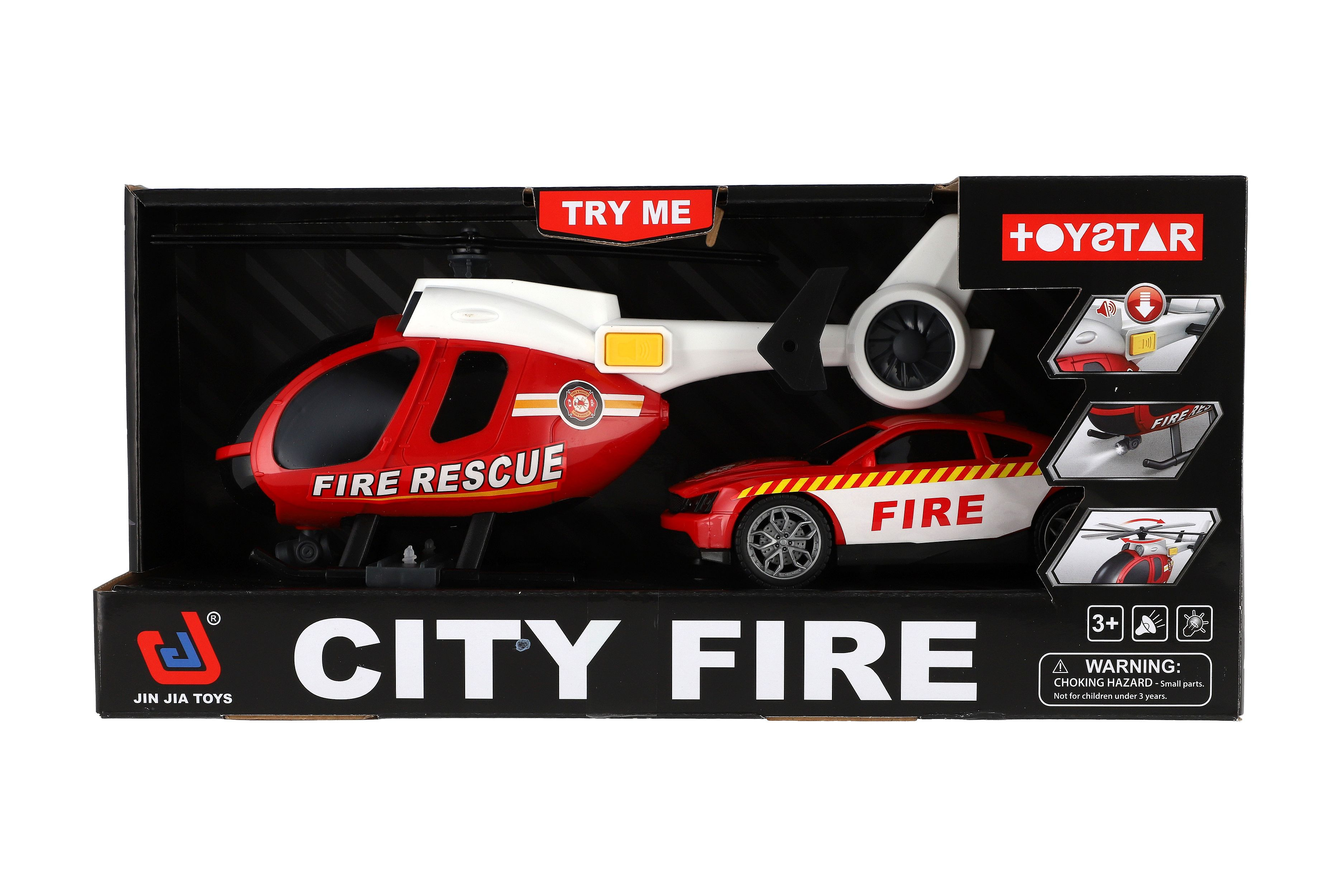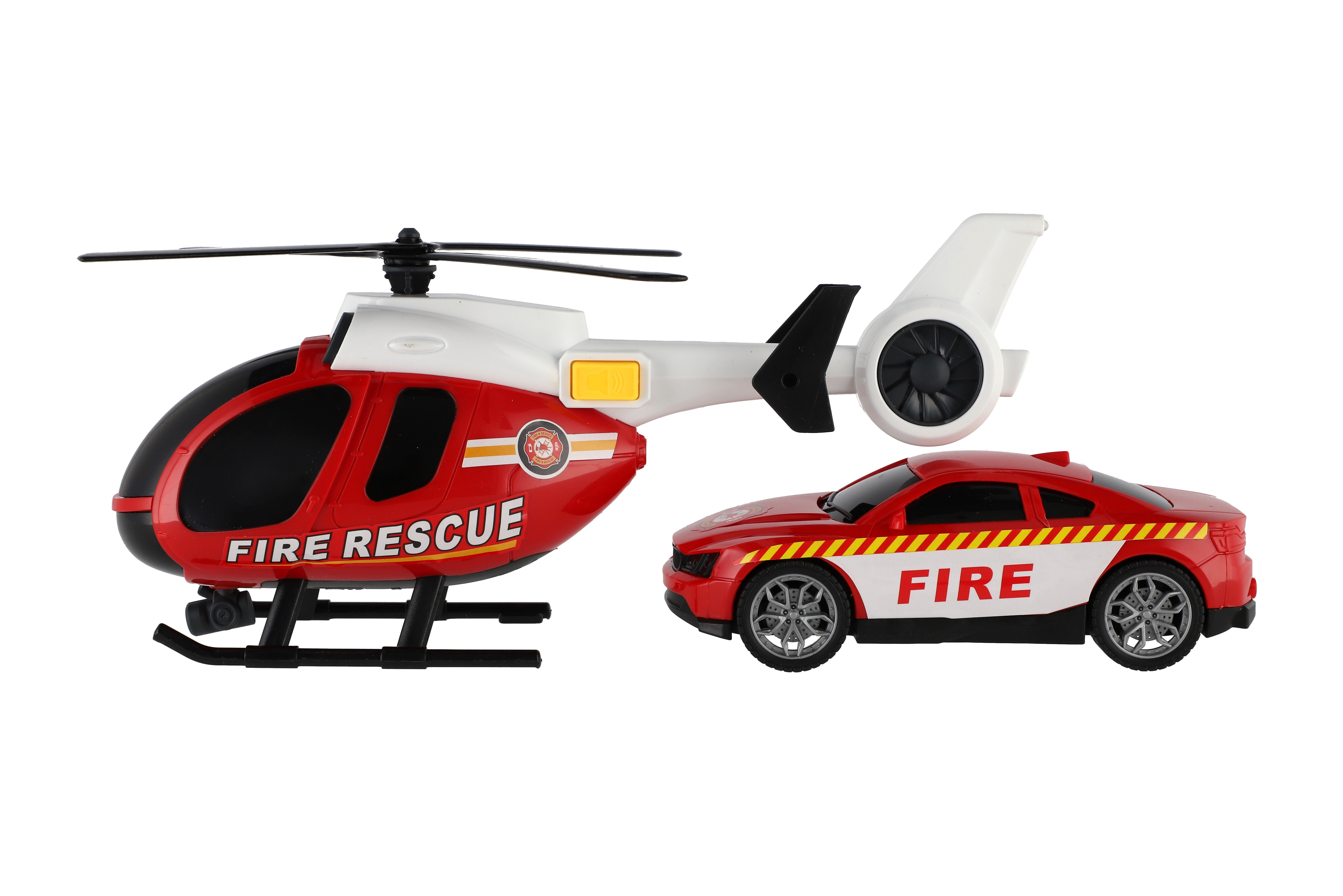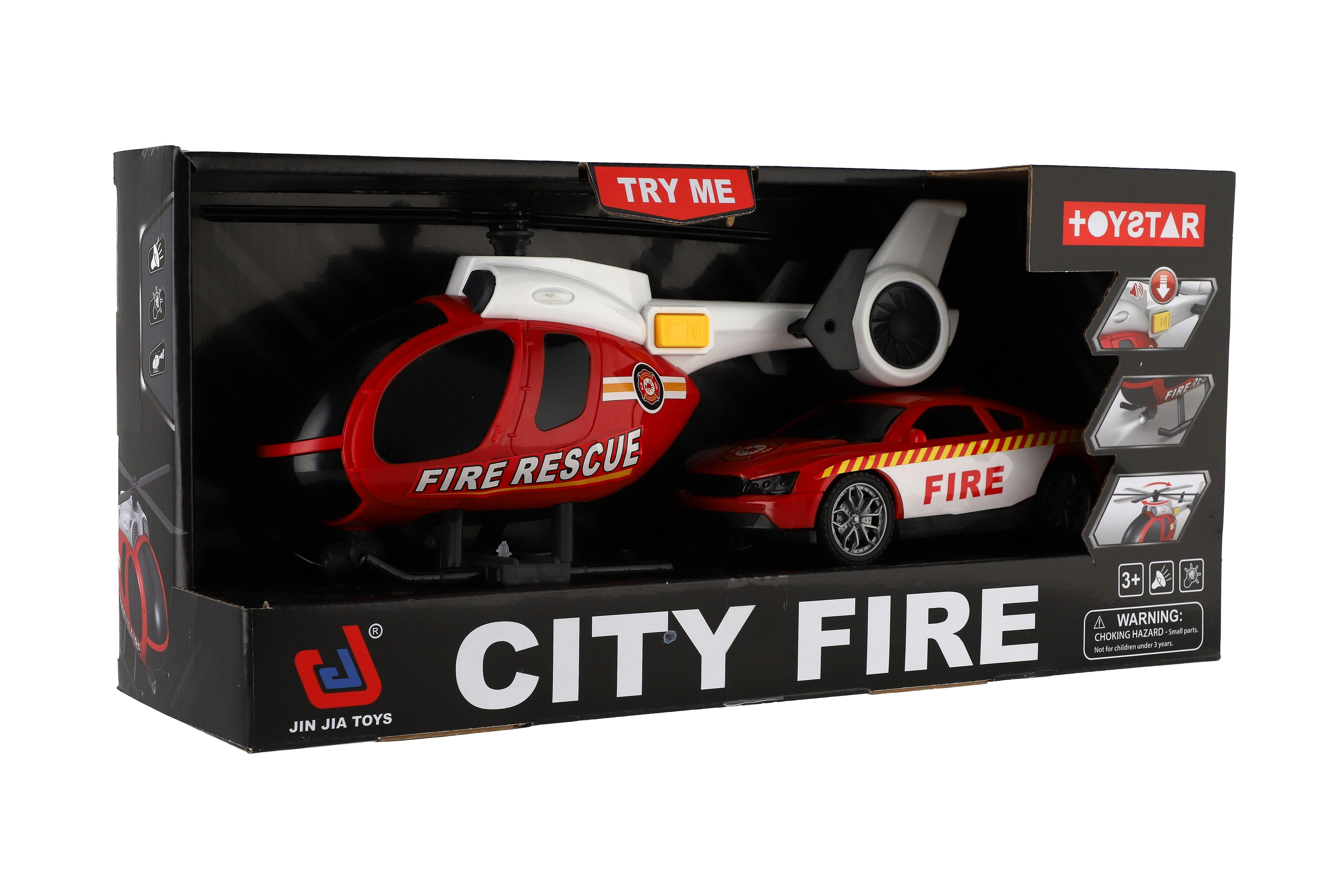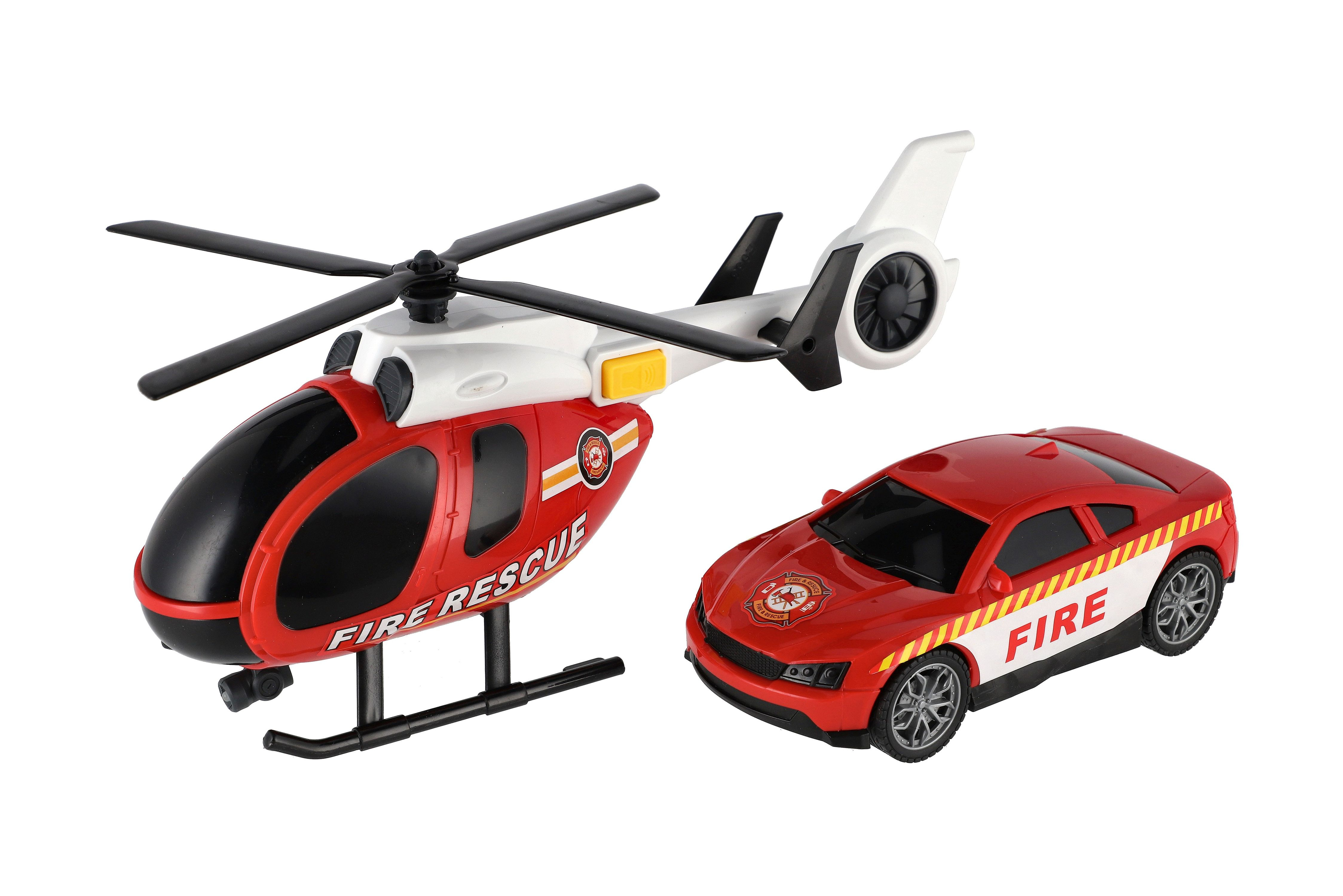 Beschreibung Teddies Hubschrauber, Feuerwehr-Auto aus Kunststoff mit Batterie, mit Licht und Sound in Schachtel 37x17,5x12cm