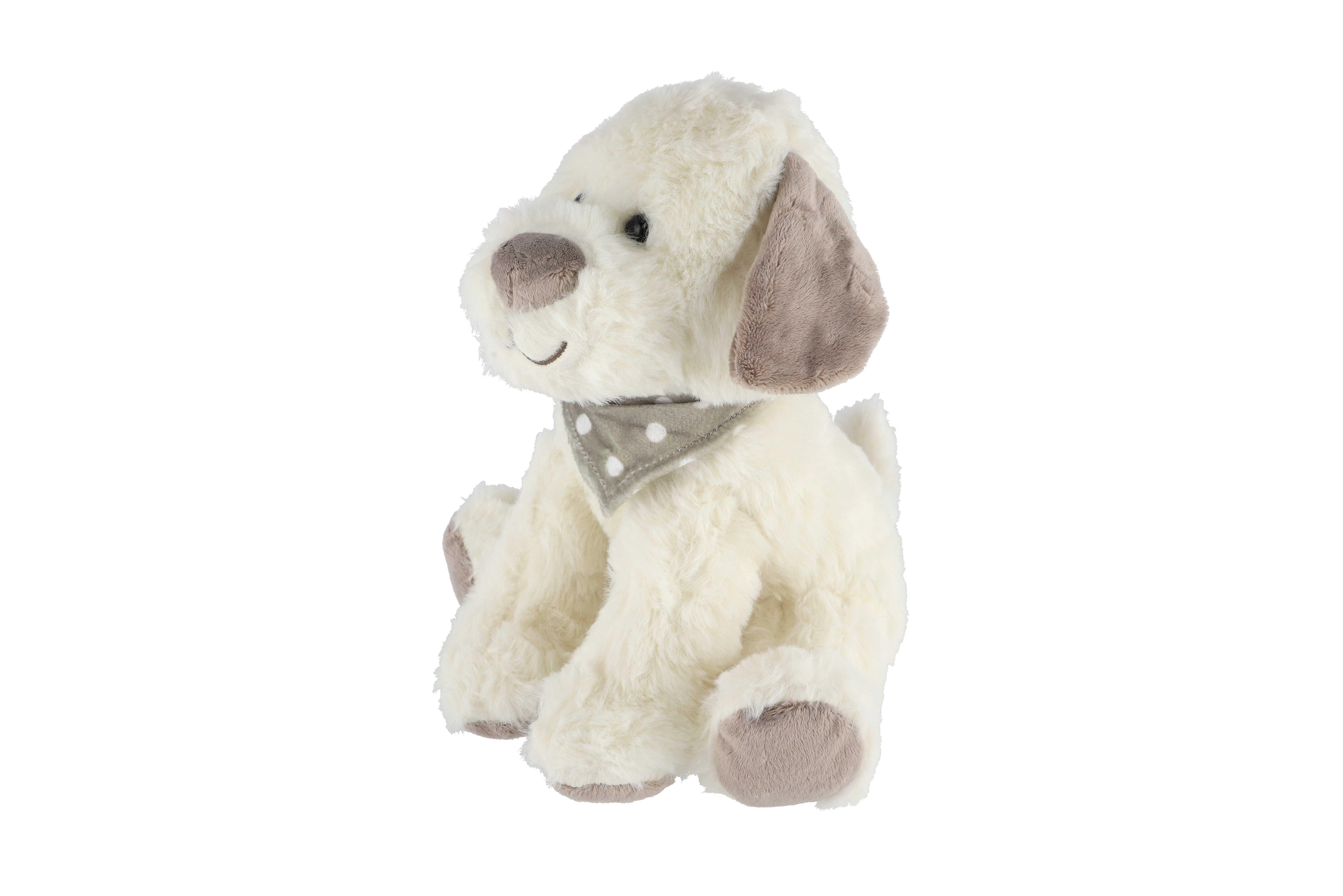 Beschreibung Teddies Hund/Hündchen sitzend mit Halstuch Plüsch 23cm weiß im Beutel 0+