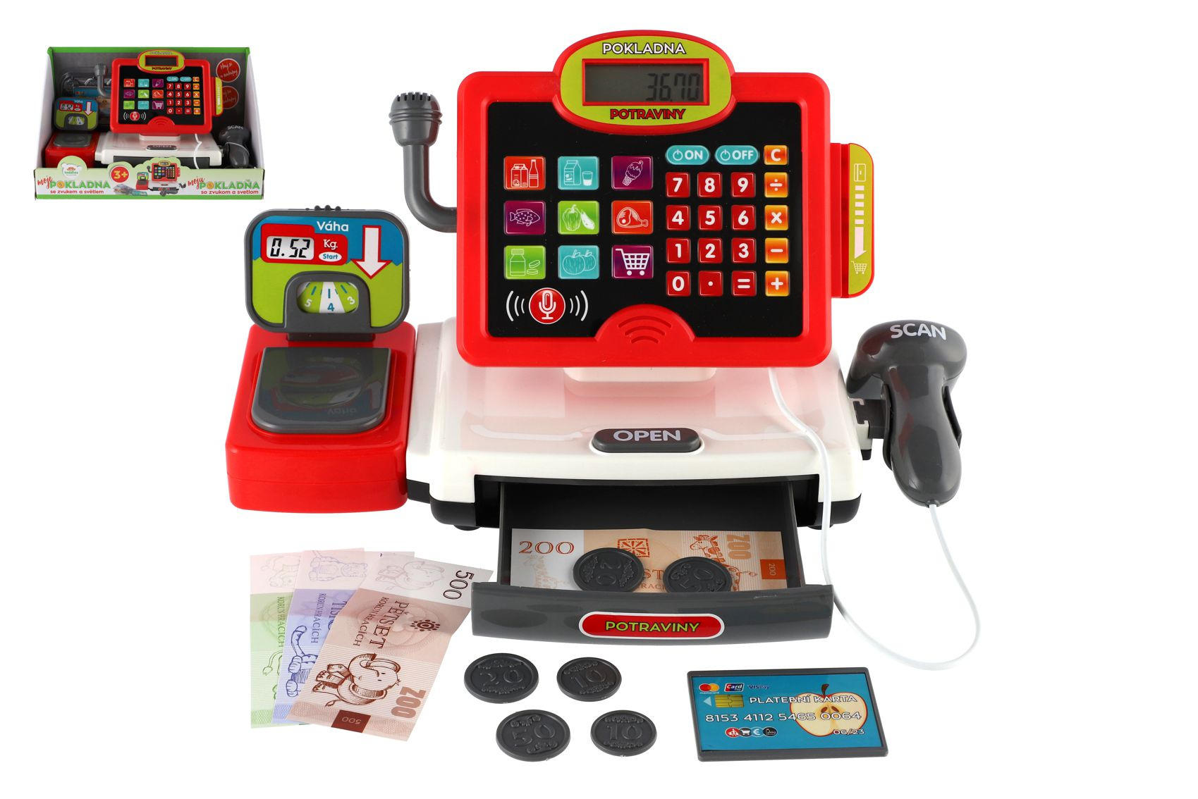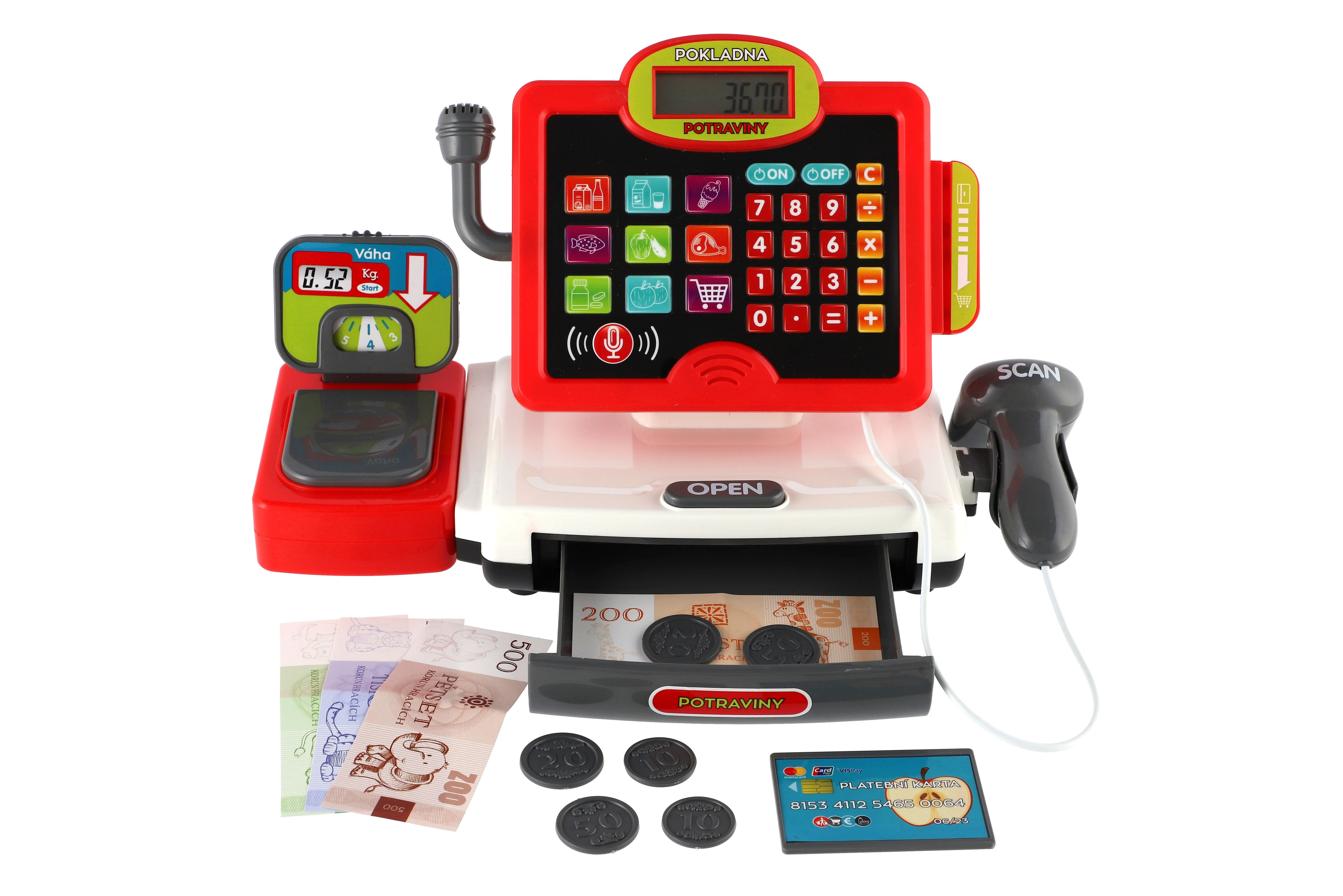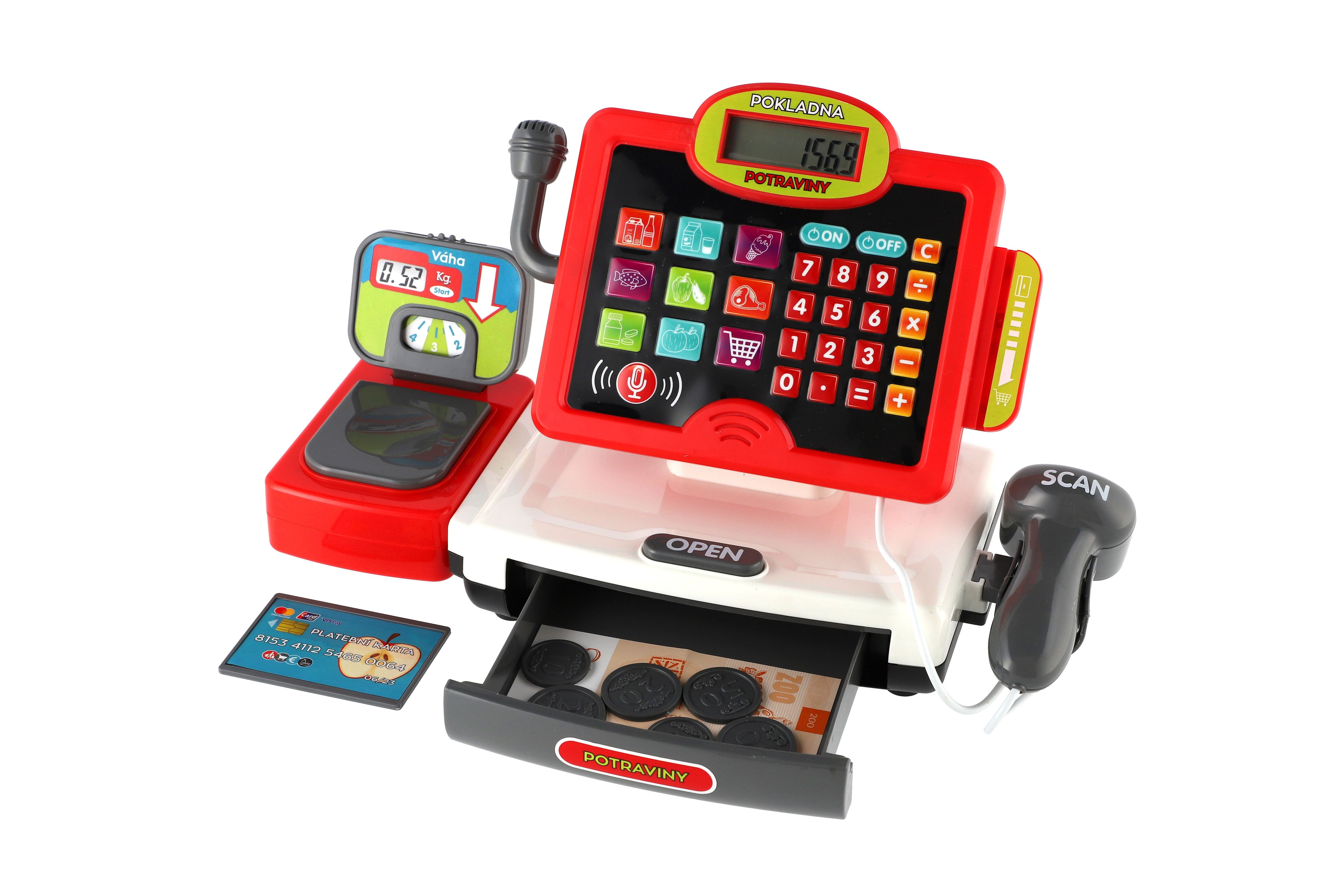 Oblíbená pokladnička s vysouvací zásuvkou na peníze, funkčními tlačítky, mikrofonem, váhou, košíkem a řadou maket potravin pro malé obchodníky. Výrobek na baterie.